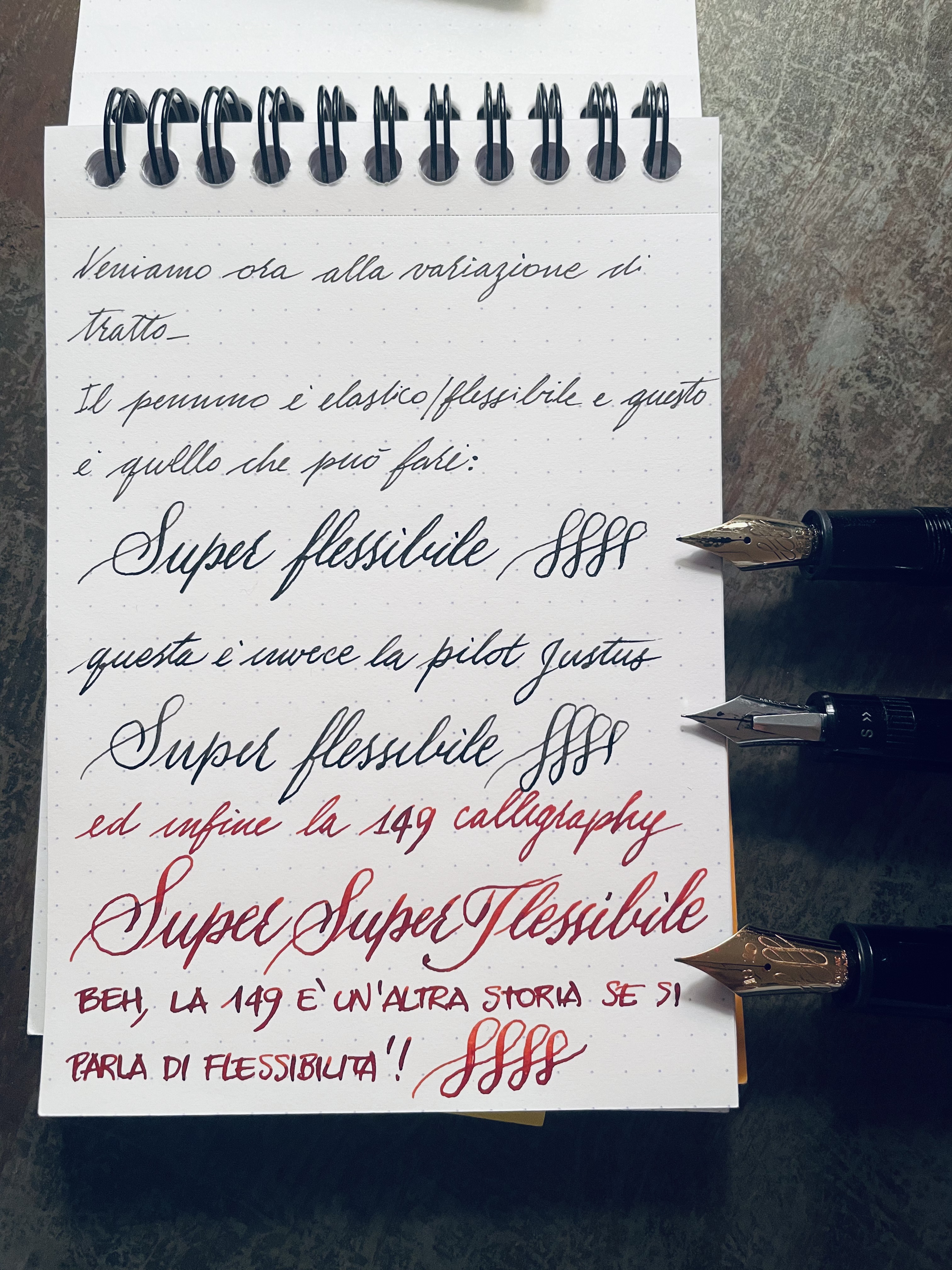 Hai ragione su entrambe le cose: la Justus non è super flessibile, ma ha un pennino quando scrivi molto più soft di quello della MB. Se provi a premere arriva fino ad un certo punto, ma poi si ferma e più di tanto non allarga.
