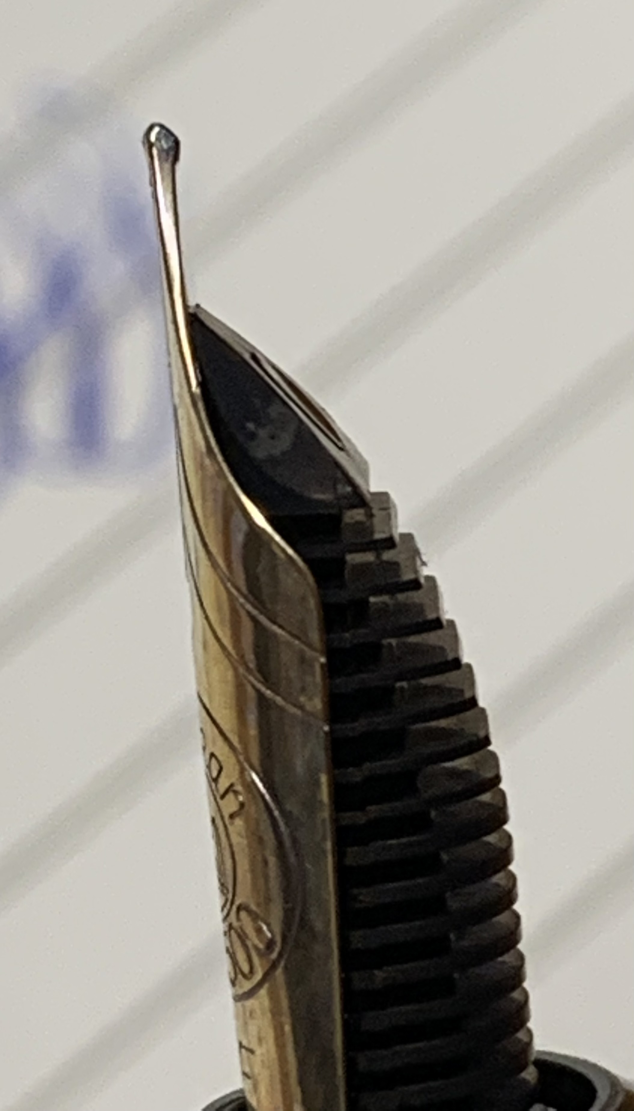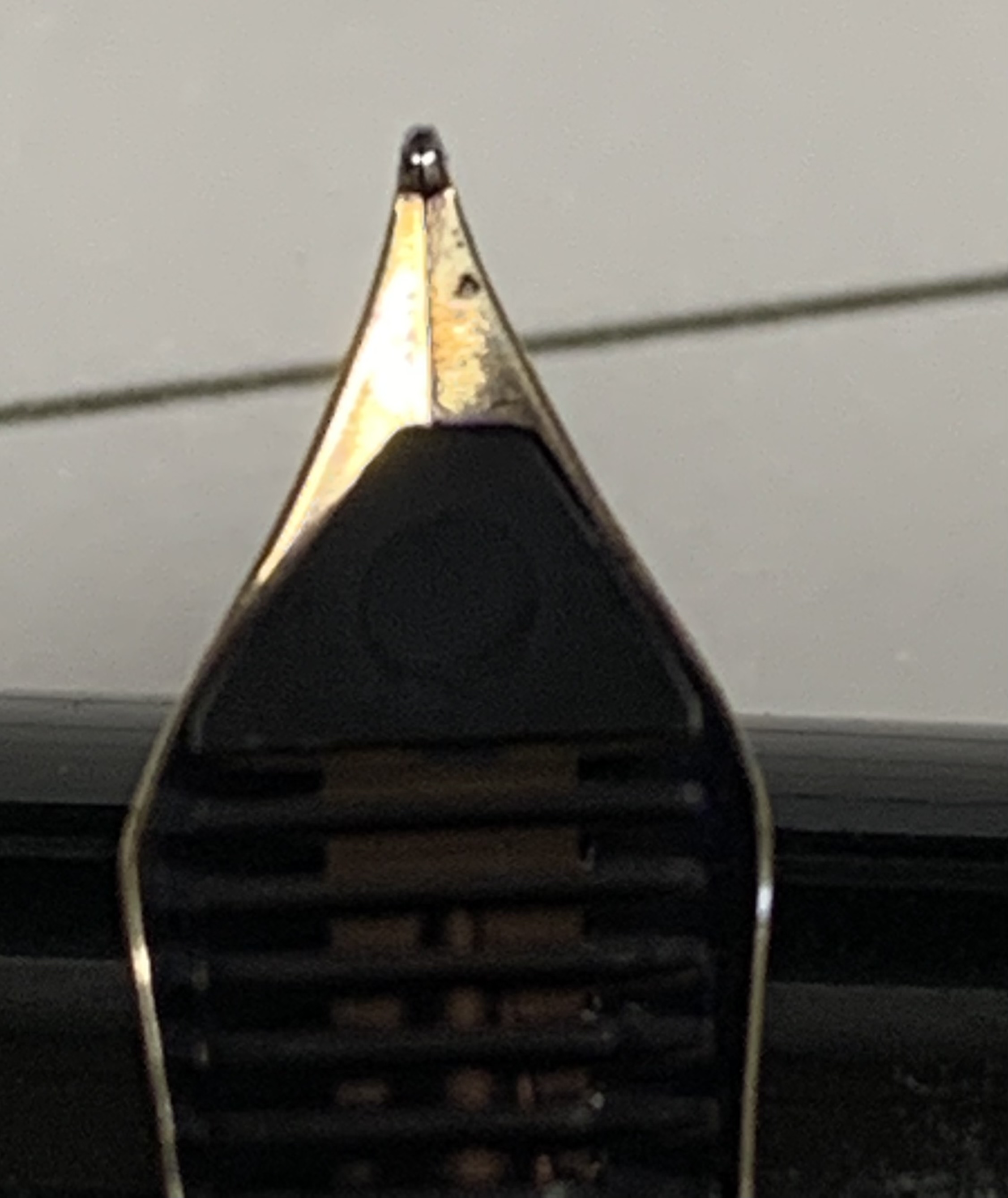 In questi pennini vintage una parte dell'iridio può anche essersi consumata con l'uso, quindi ne resta poco ed emerge la forma quasi rettangolare della punta del pennino...