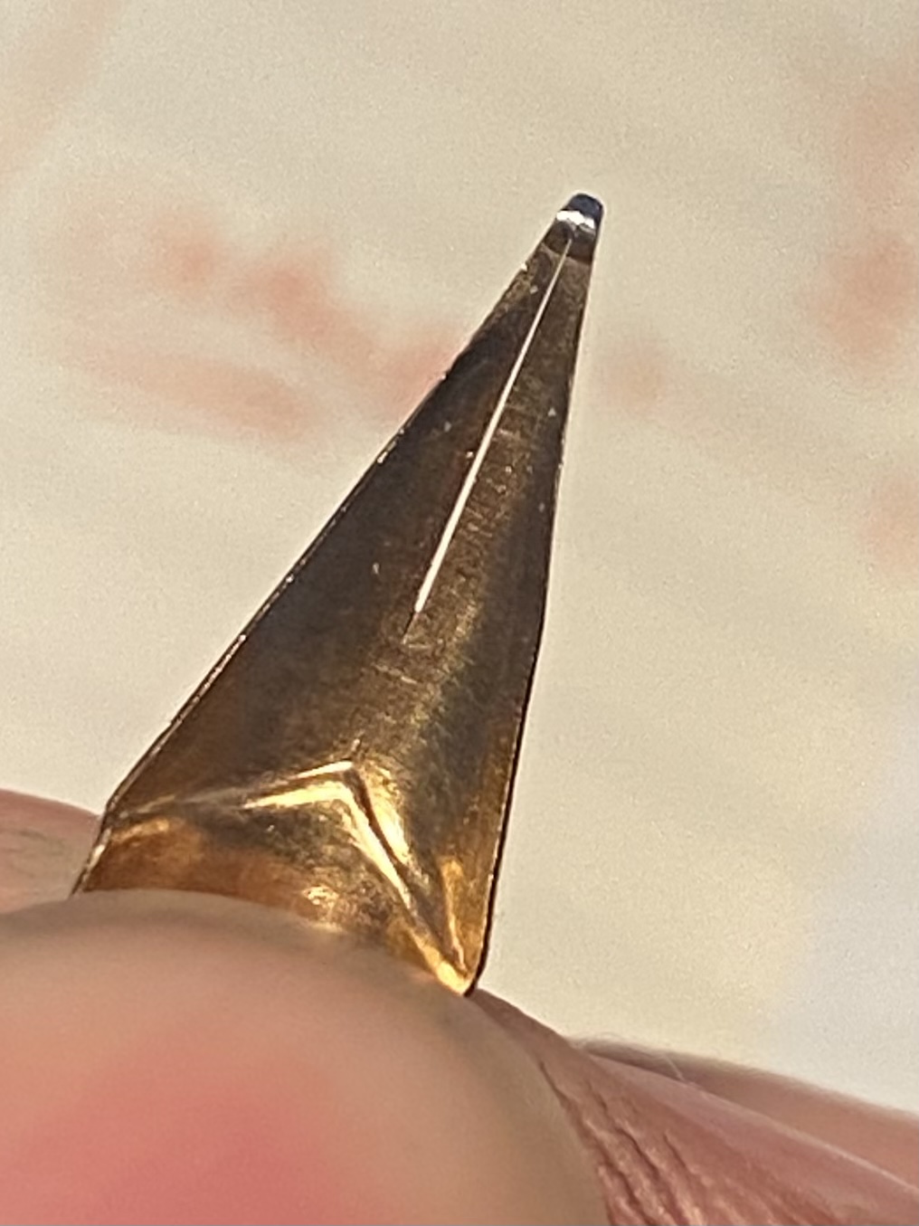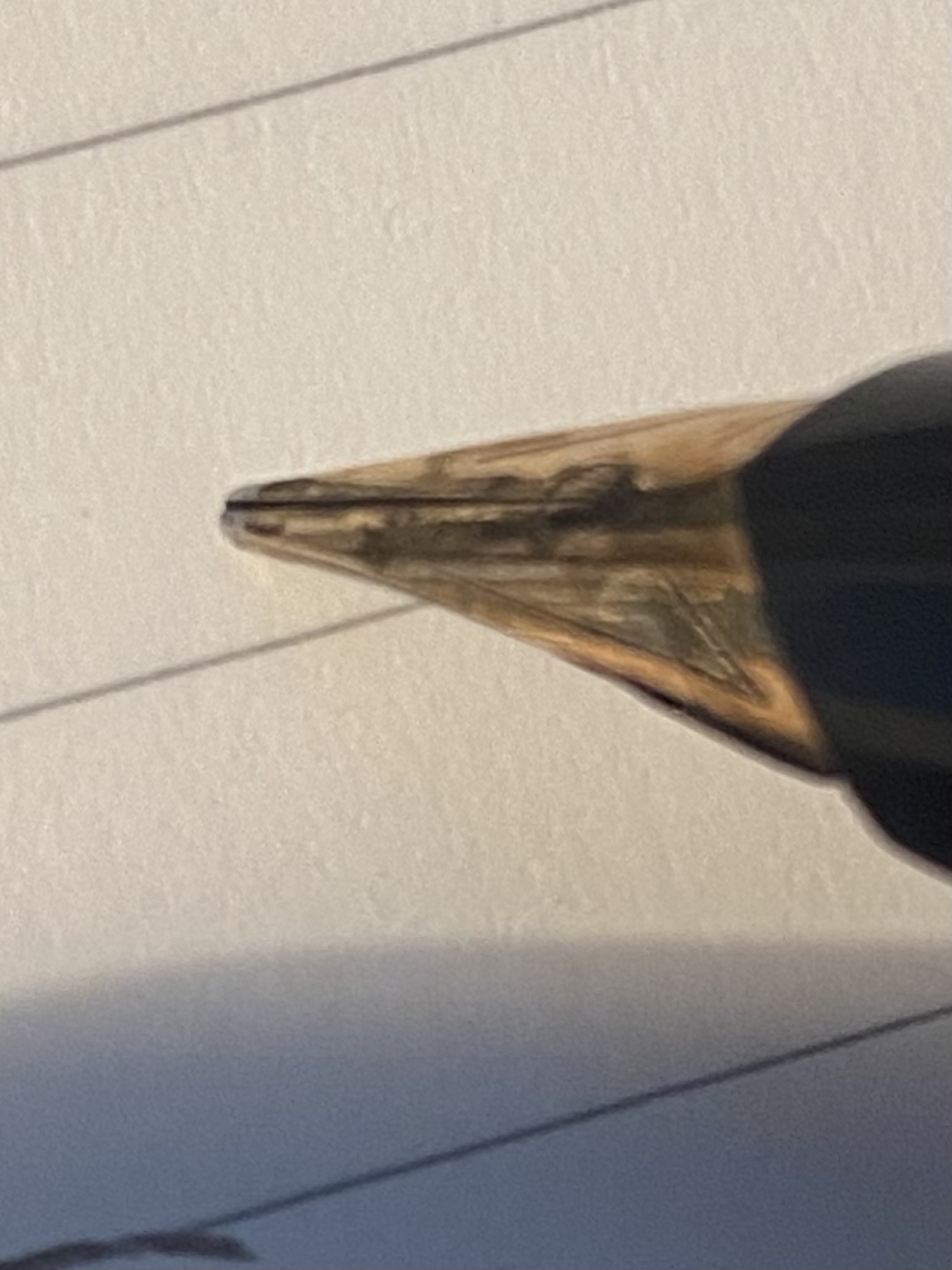 Ipotesi: il pennino è stato deformato e raddrizzato con arte ma il metallo ha mantenuto in "memoria" lo stress subito e a ogni minima pressione ritorna alle origini. Può essere fantasia ma non vedo altre opzioni.