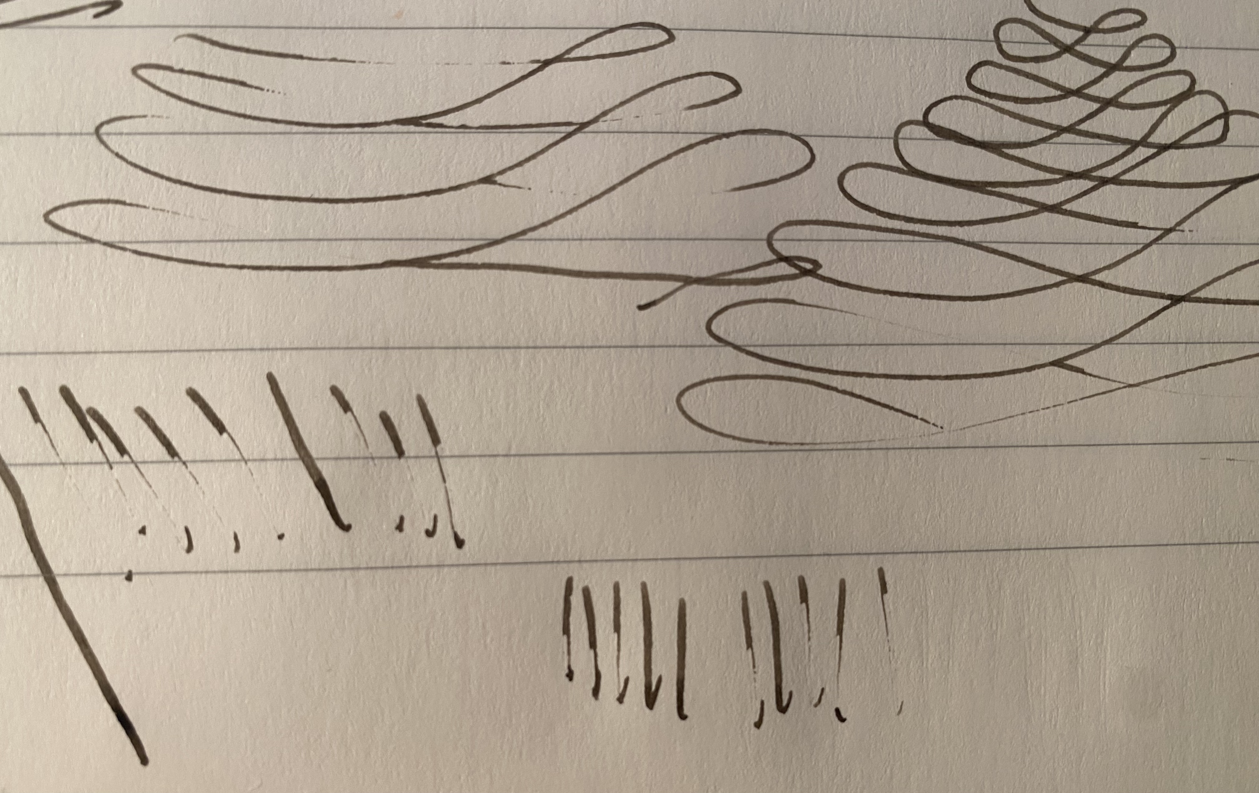 I tratti verticali sono a velocità normale in serie, praticamente i rebbi si aprono talmente tanto che il flusso non arriva più come dovrebbe e va a secco. E per una pelikan M non è normale…