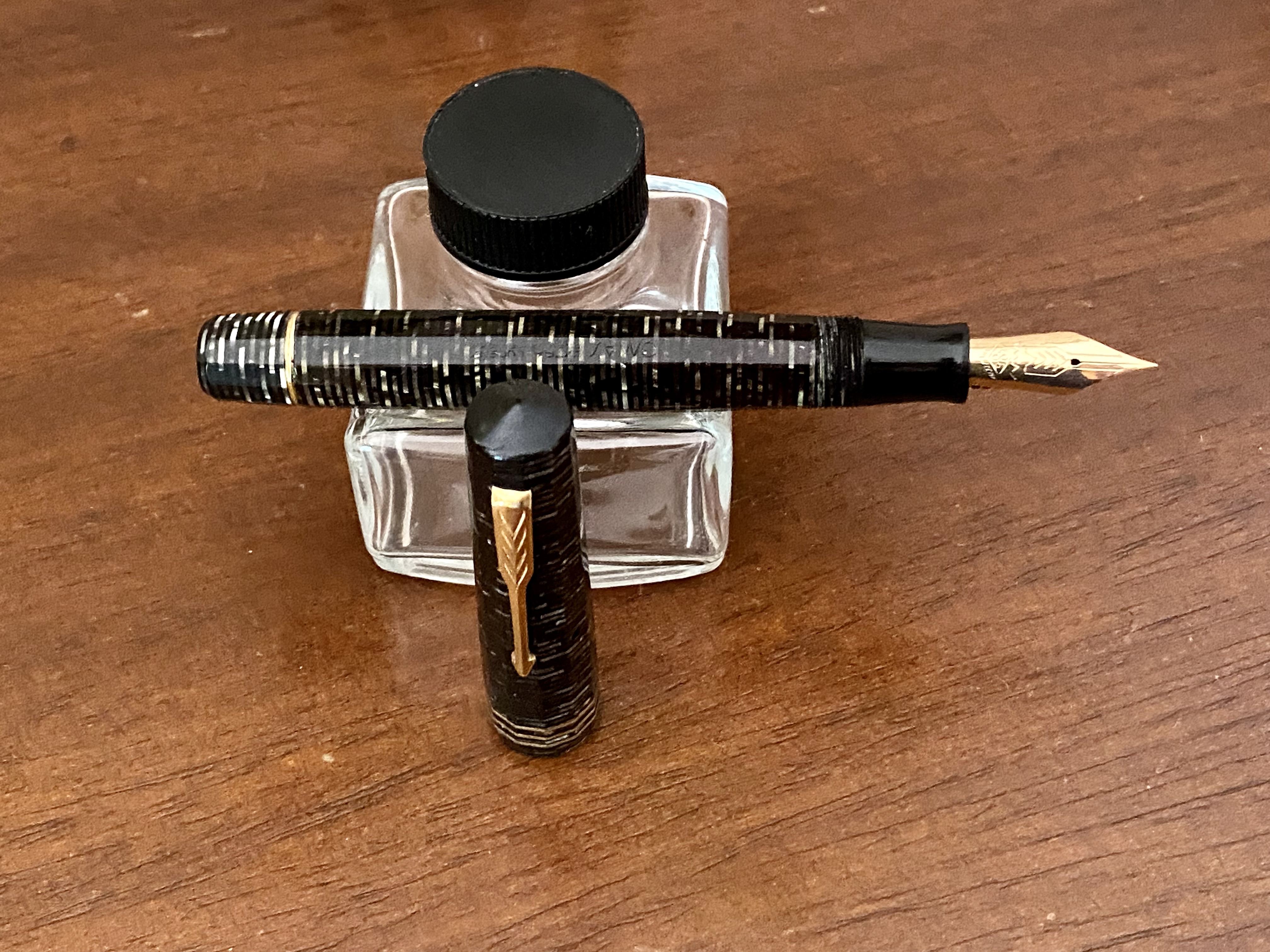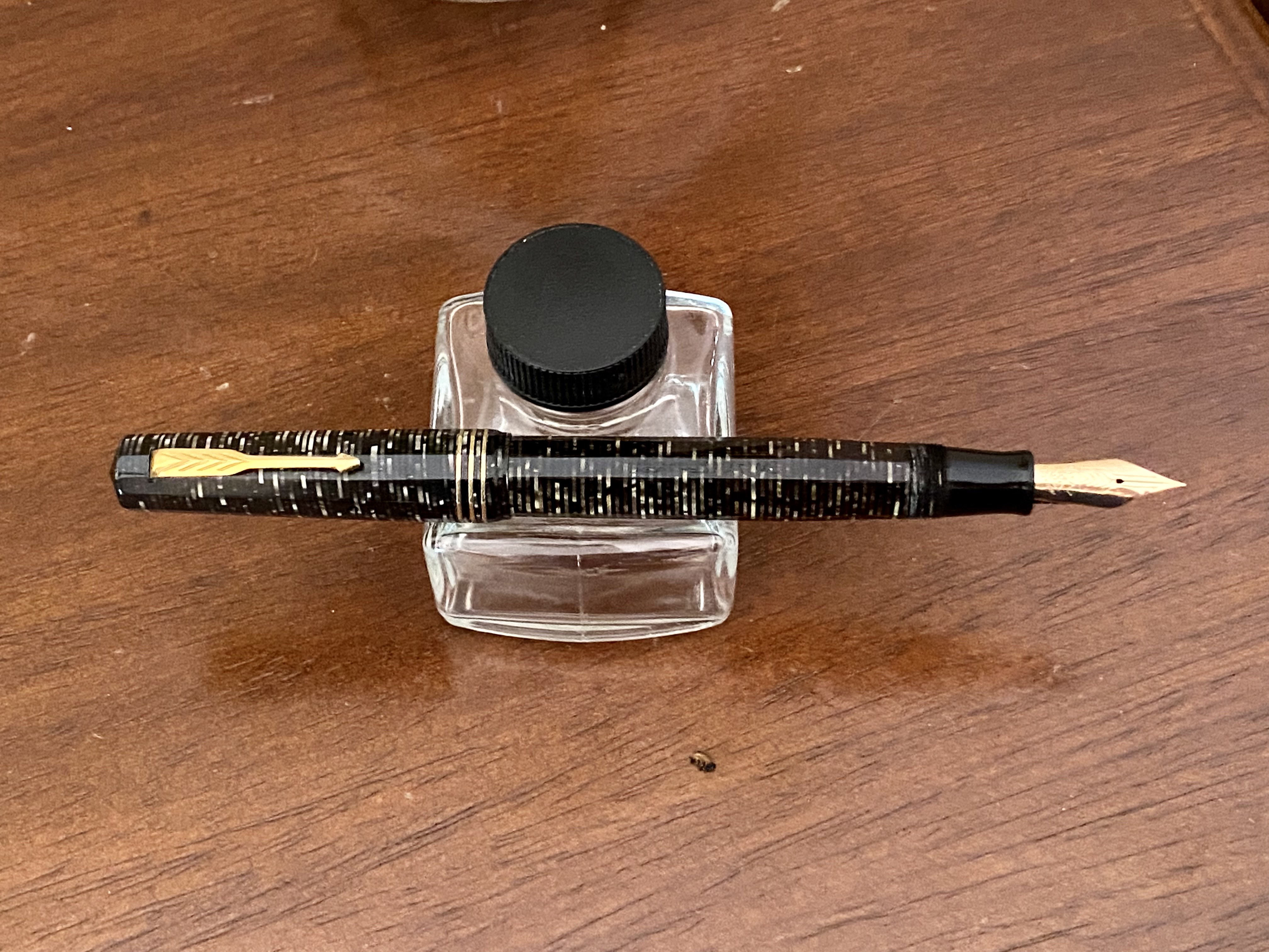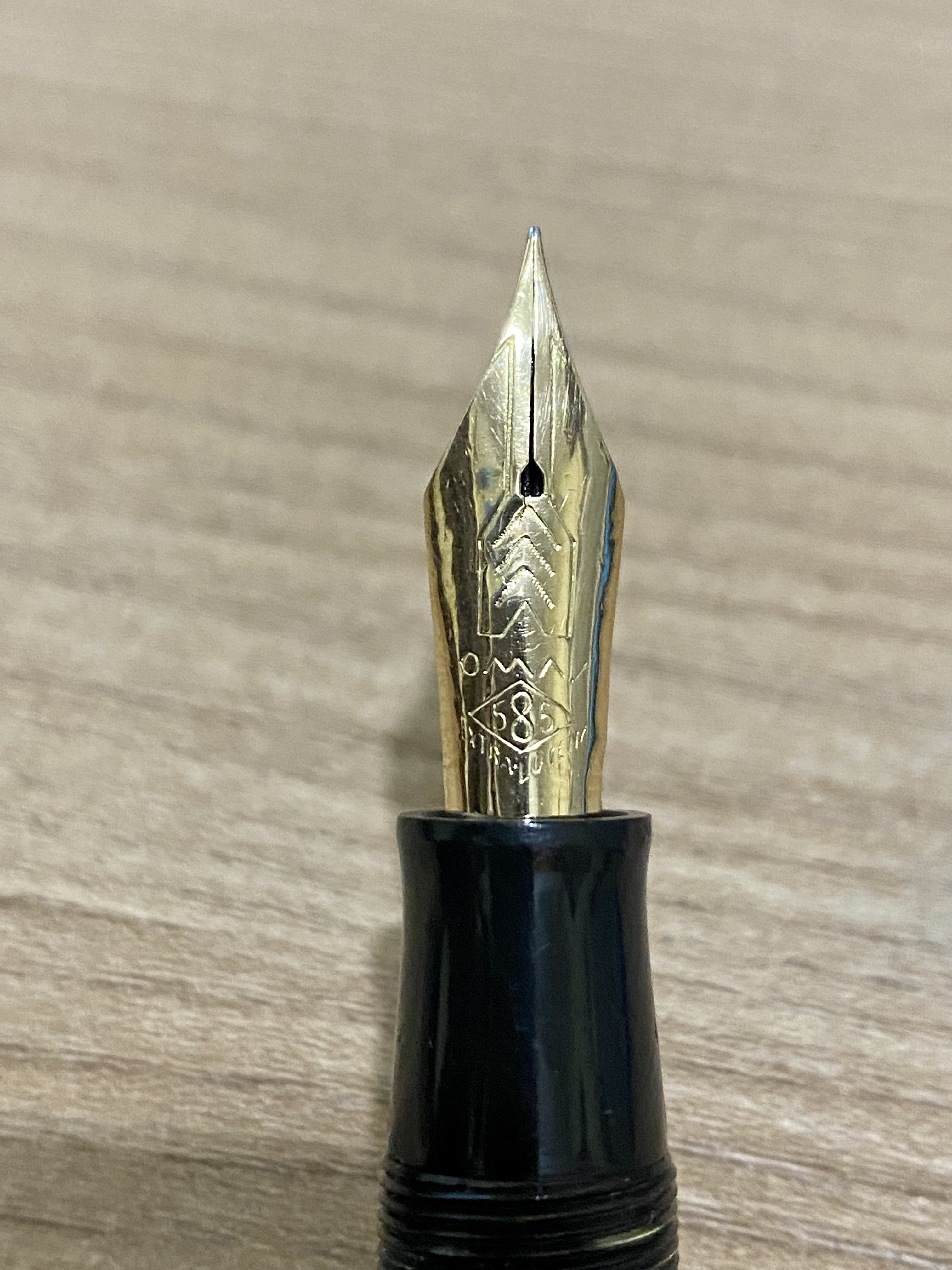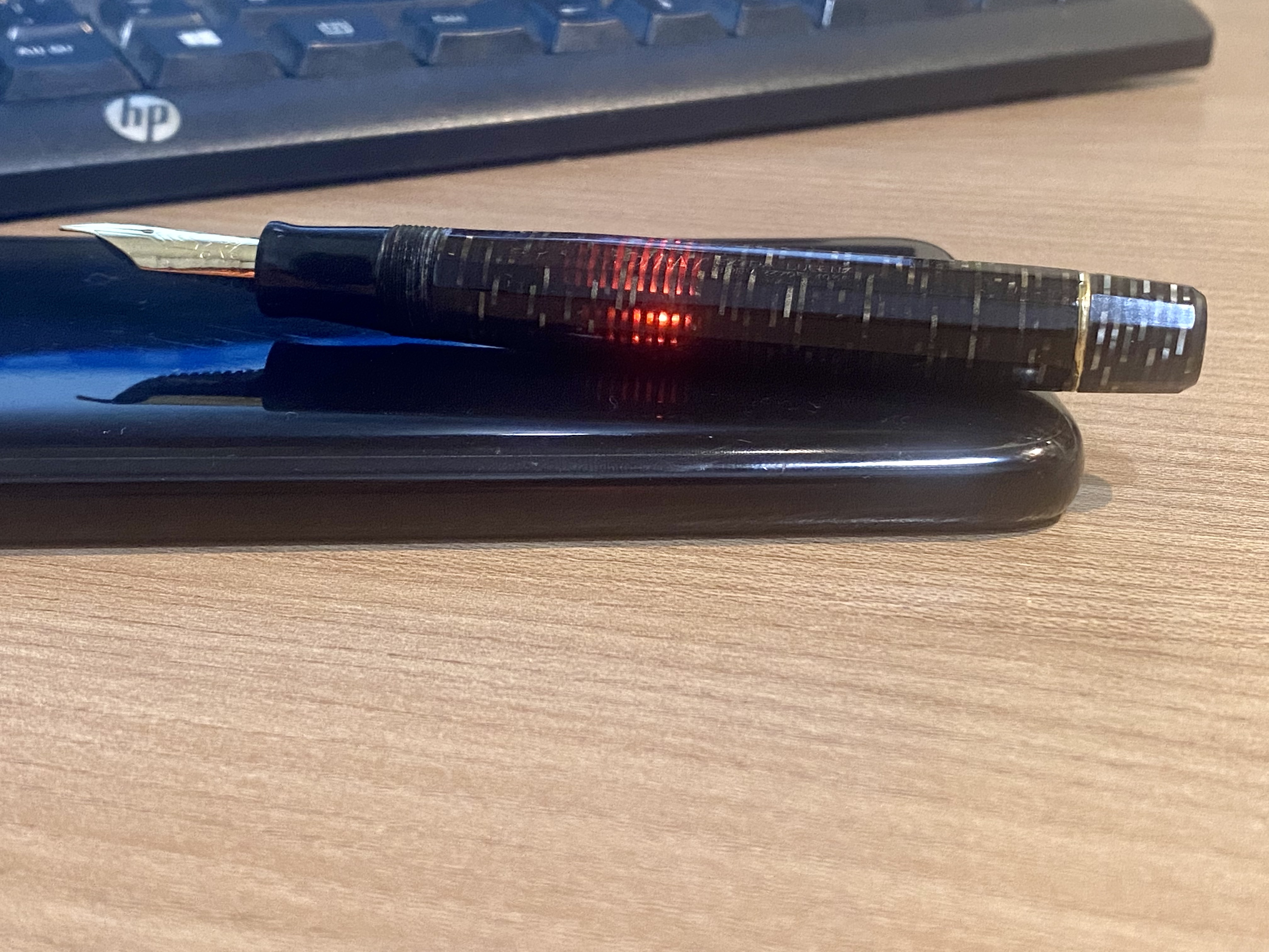 Il mio orgoglio oltre che per la penna in ottime condizioni, a dirla tutta, è per essere riuscito a riportarla in ottime condizioni. La presi ad inizio 2022 con il fondello di ricarica masticato, lo stantuffo tuffante che non funzionava (ma questo era il minimo), la clip spezzata e un pennino in acciaio generico pure arrugginito. Riuscire a ritrovare le parti mancanti originali e coeve è stato un lavoraccio, più che trovare chi me la rimettesse in sesto!