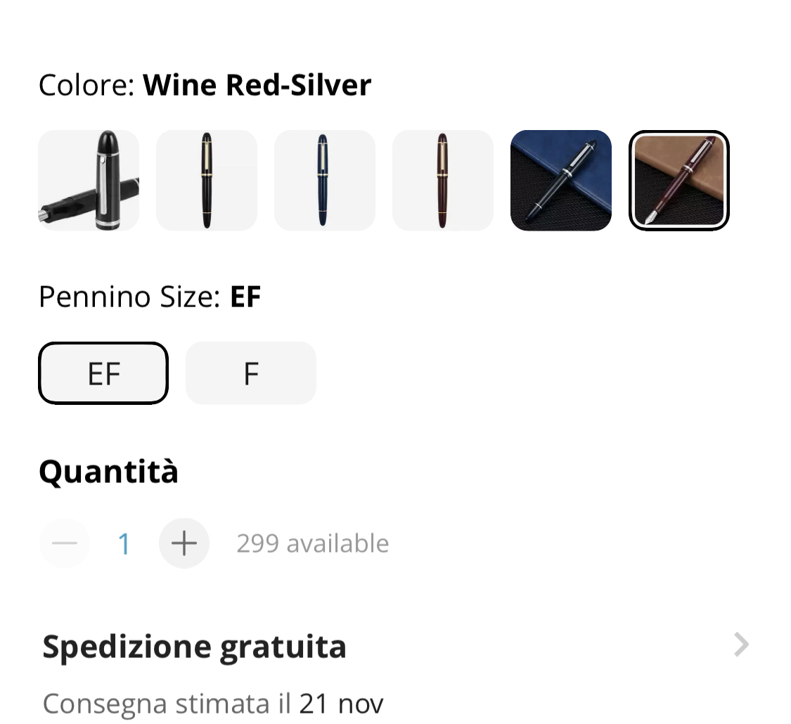 Ricevuta da poco la Jinhao x 159 in nero (devo dire che mi piace) pensavo di prenderla anche in bordeaux ma la trovo solamente con finiture dorate (cosa che preferirei evitare per dubbi sulla tenuta della doratura nel tempo) sapete se viene prodotta in questa colorazione (appunto bordeaux) anche con finiture e pennino acciaio ? Vi ringrazio come sempre