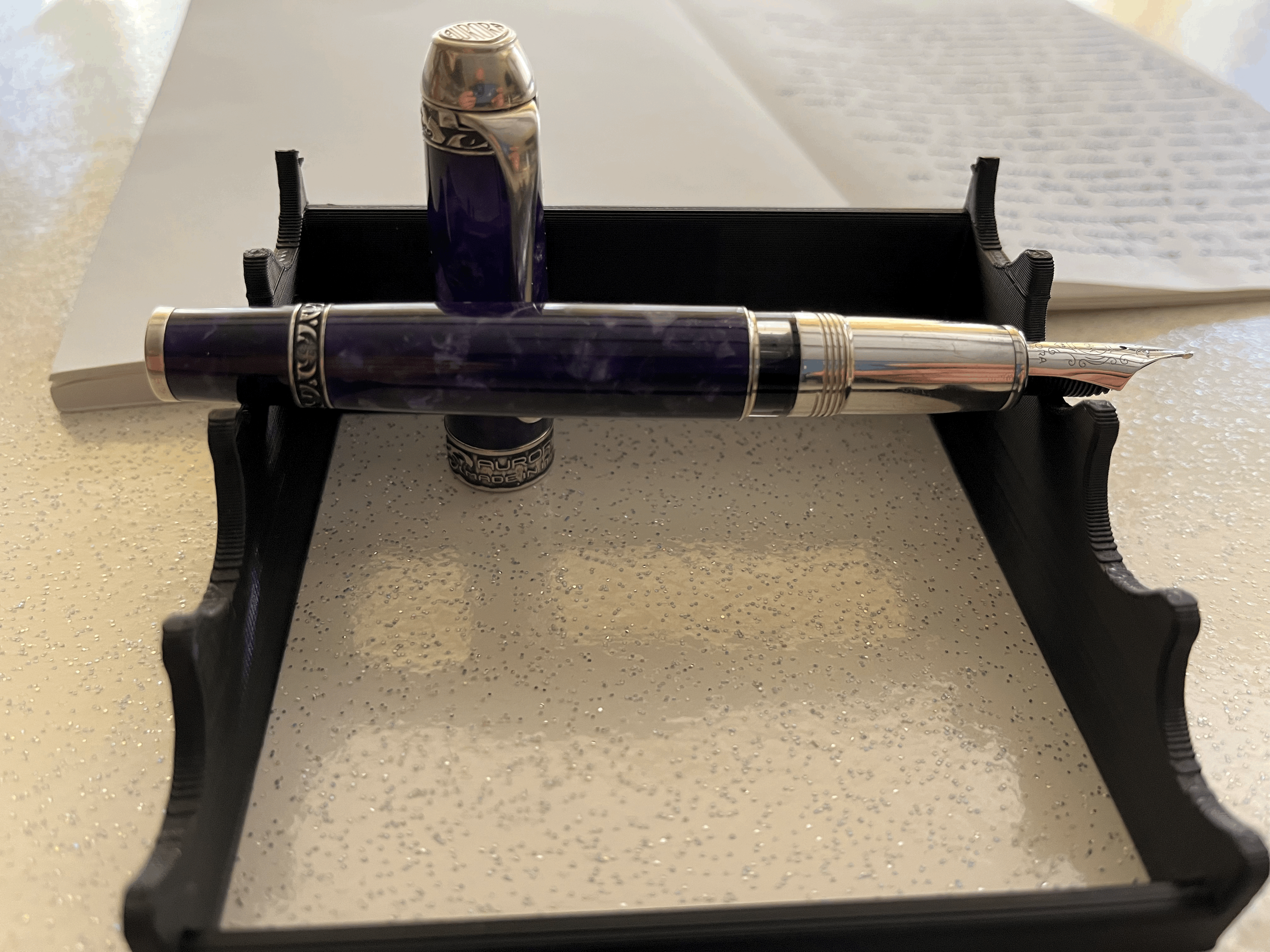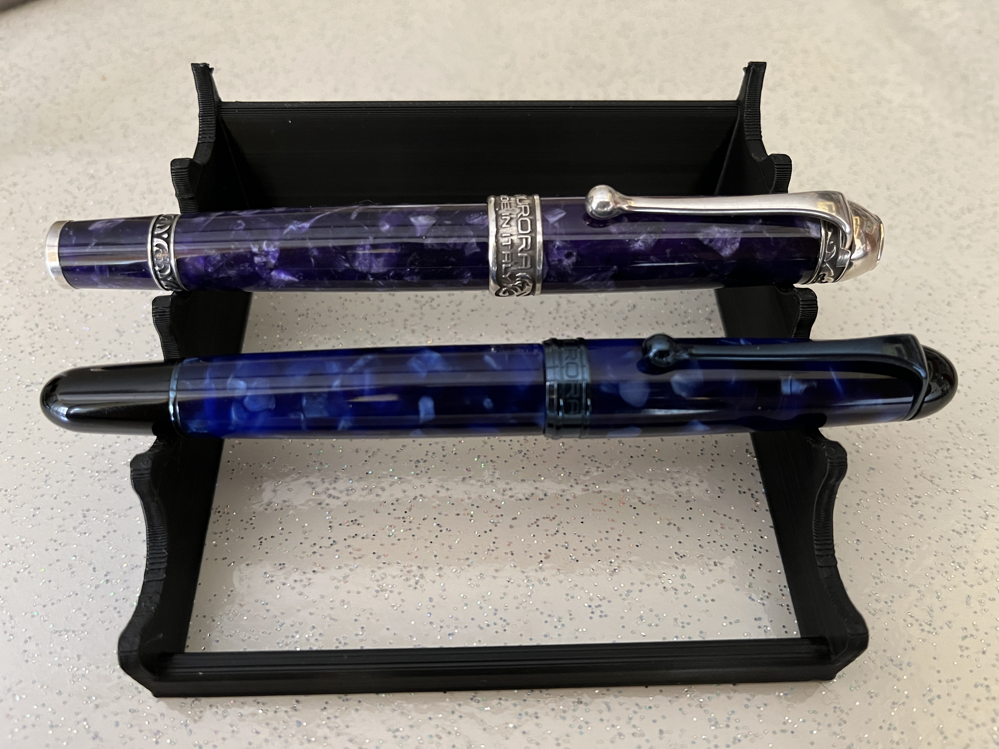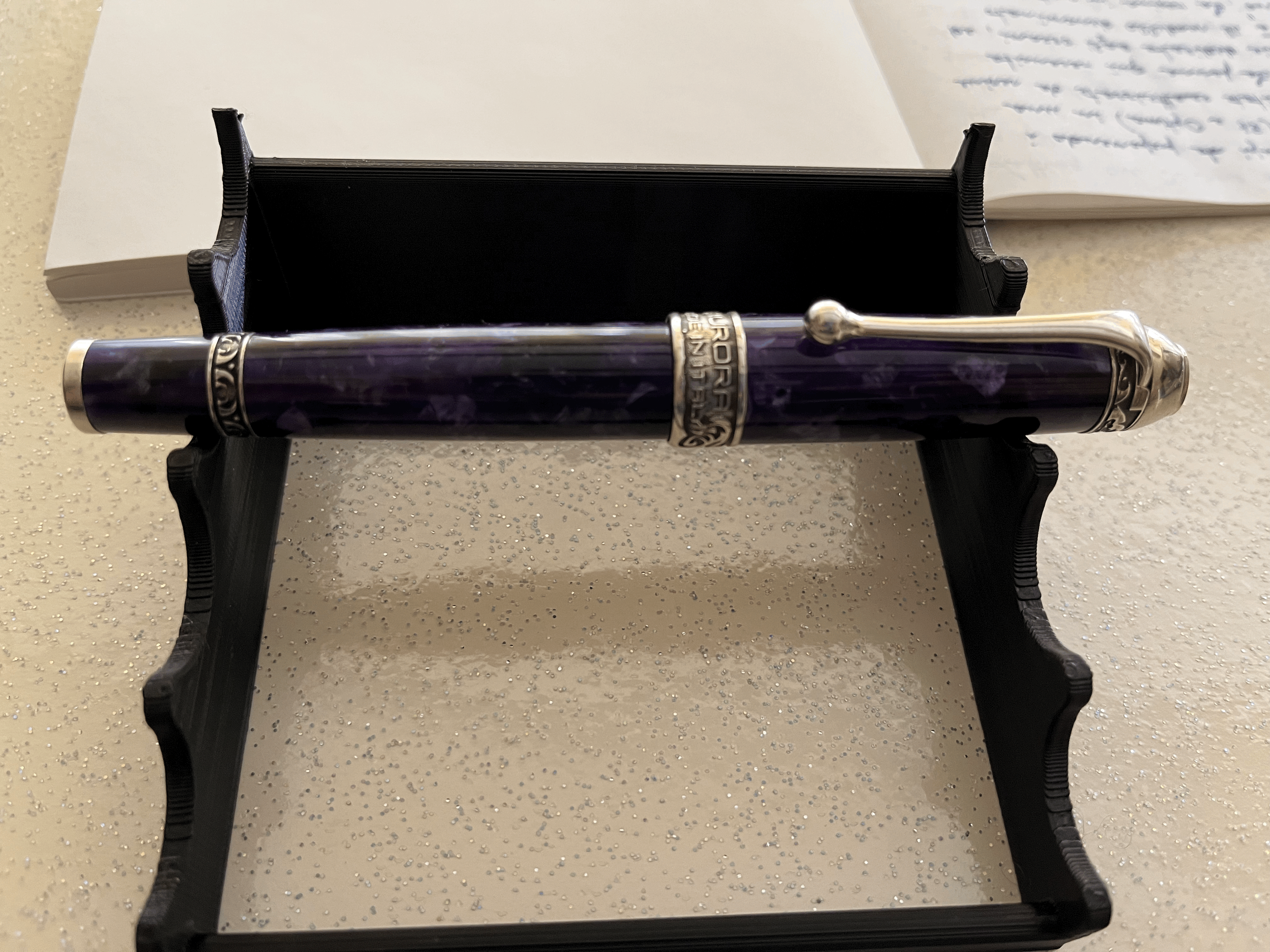penna interessante, in genere non amo molto queste versioni abbellite, in questa però gli ornamenti in argento si abbinano bene al viola scuro quasi indago. Forse non amerei la sezione in metallo (è cromata o anch'essa in argento?).