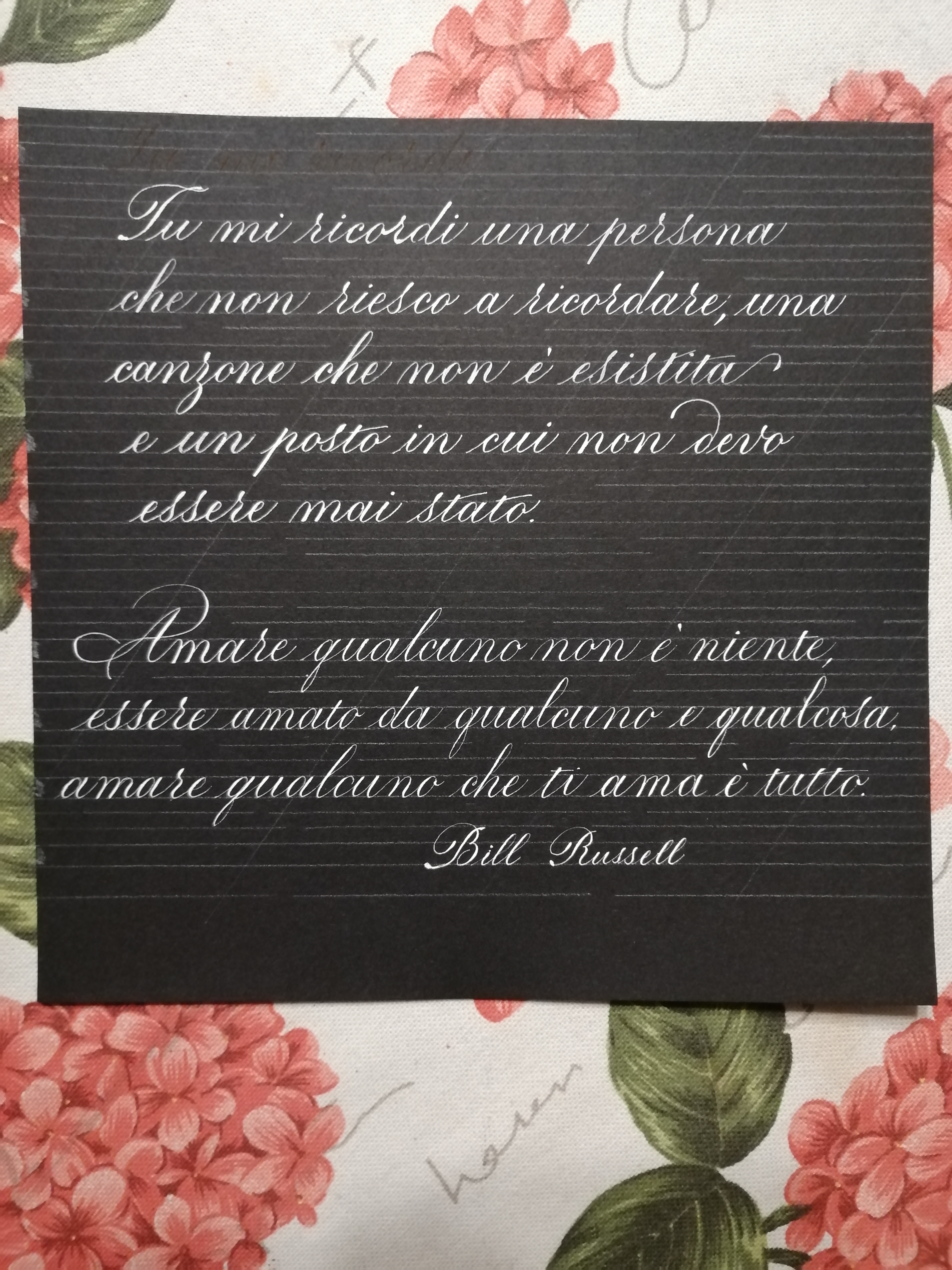 Ogni tanto riprendo in mano il corsivo inglese e per questi esercizi, giusto per complicarmi la vita, ho anche rispolverato l'inchiostro Dr martin's bianco. Come ricordavo capire quanto diluire questo inchiostro é un mistero, ma risolto l'enigma risulta molto coprente. La carta é della Ldl da 135g, non il massimo ma onesta per gli esercizi. Per la prima frase ho usauto pennino Hunt 22, per la seconda Gillot 303. Corpo lettera 4mm.