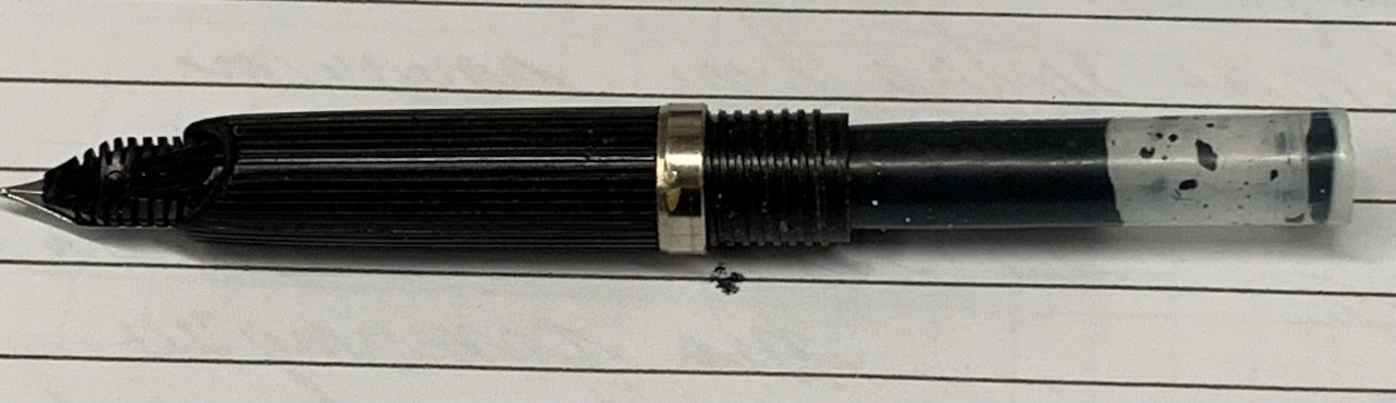 Dopo aver spurgato una quantitá di inchiostro secco ( sputazzando un sacco di pezzettini di roba insolubile) riesce a scrivere con una discreta scorrevolezza (non eccelsa) e flusso magro ma continuo e decente.