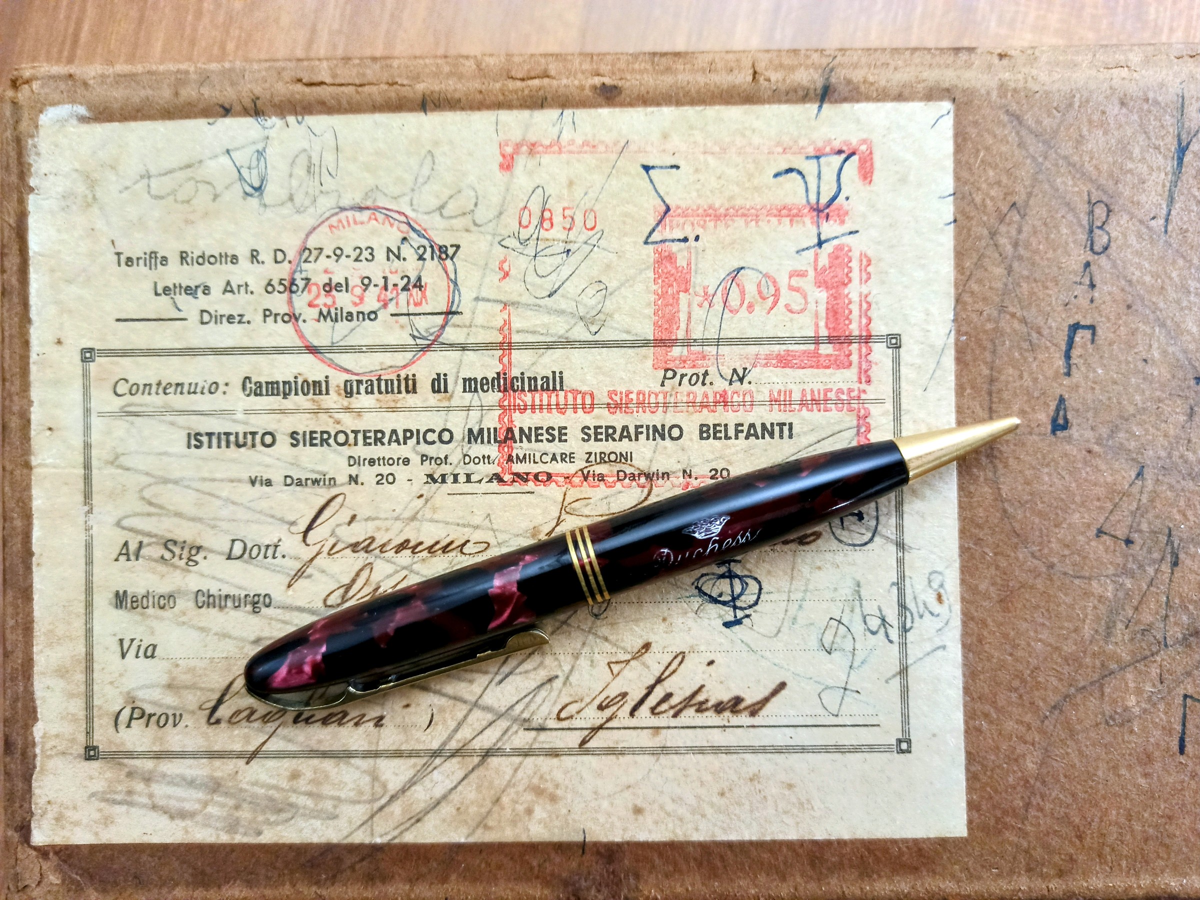 Condivido con voi amici del forum alcune fotografie di un portamine Duchessa da me recentemente acquistato: non tanto per mostrarvi chissà quale rarità, quanto per il curioso contenuto della scatola che l'accompagnava