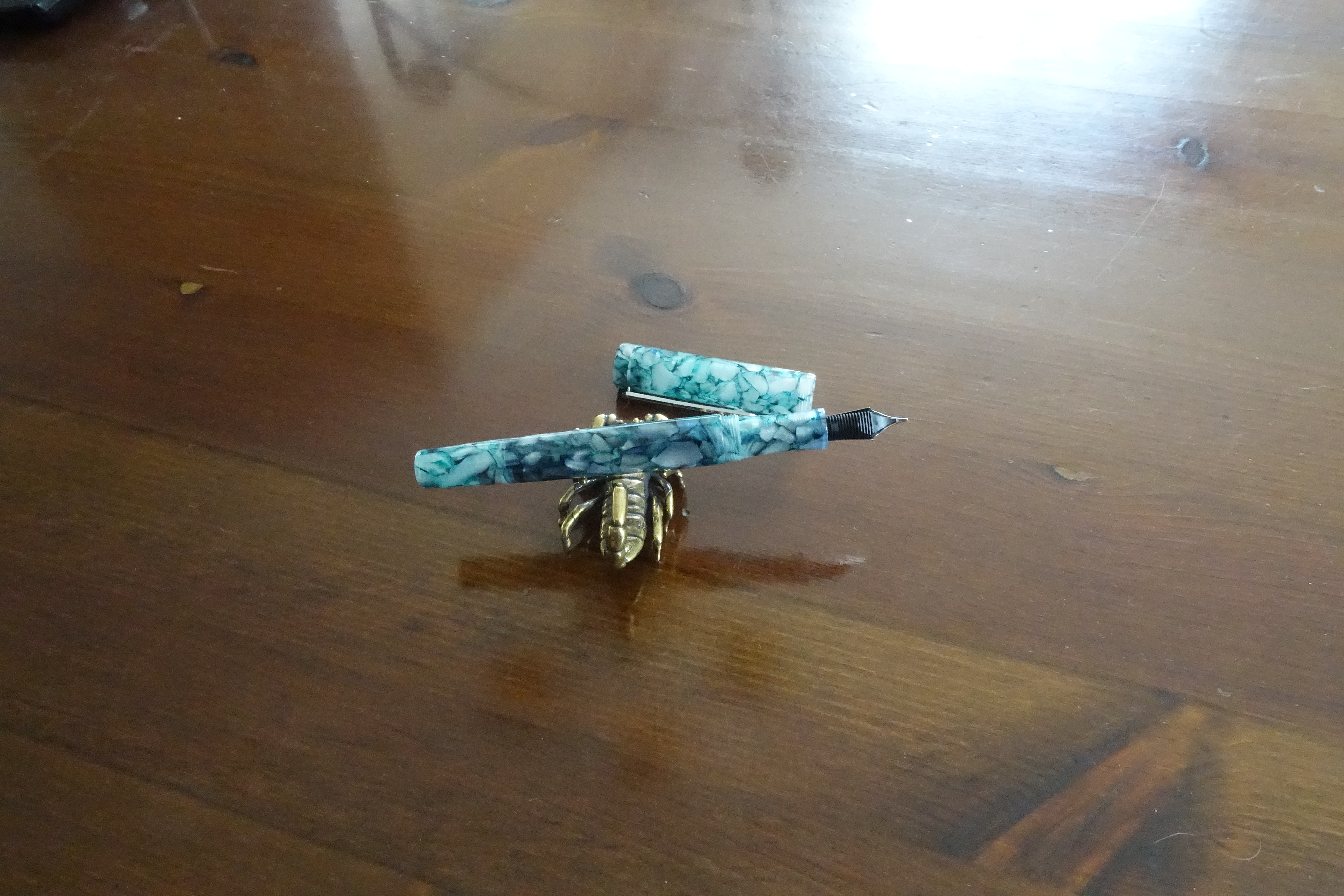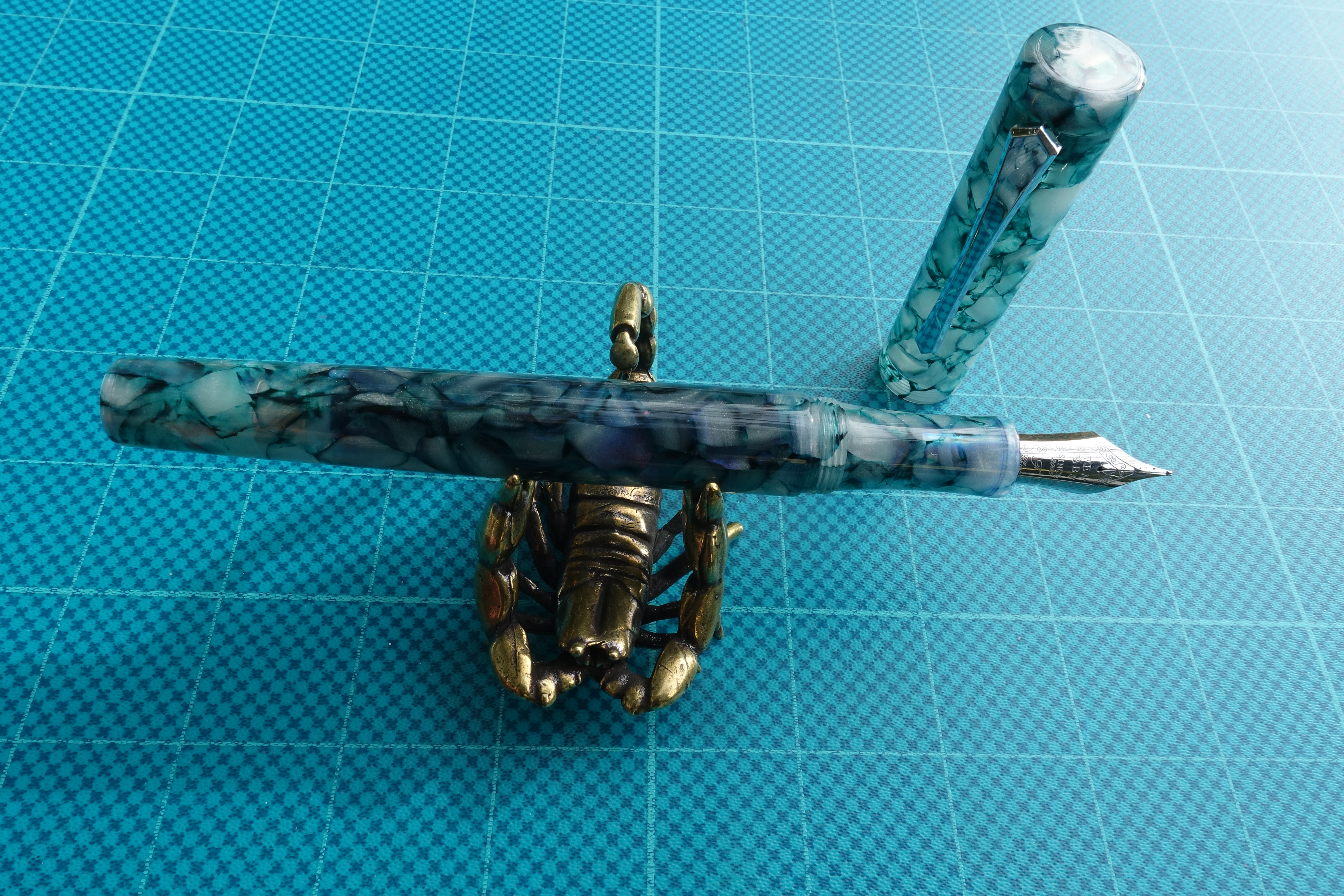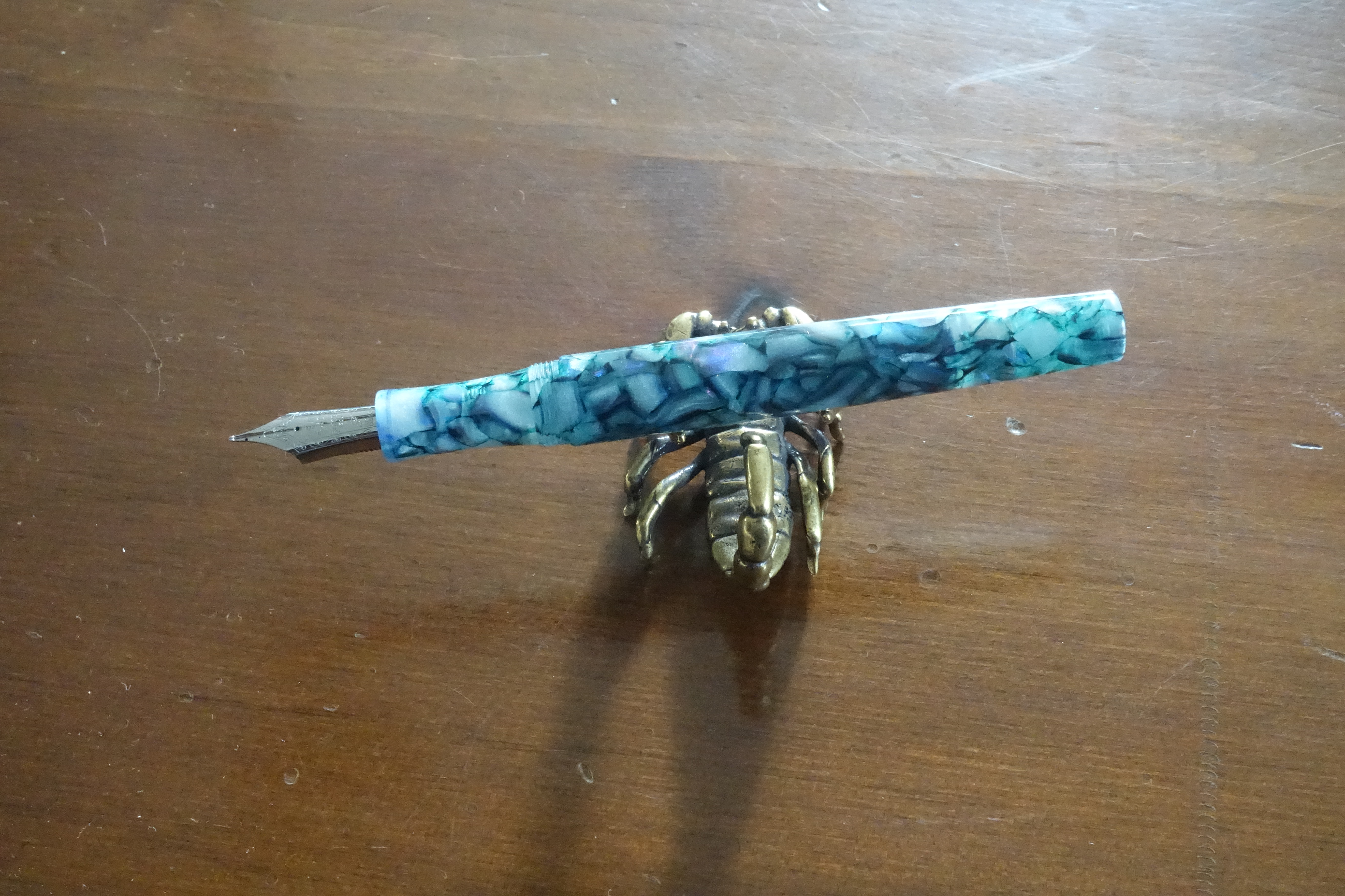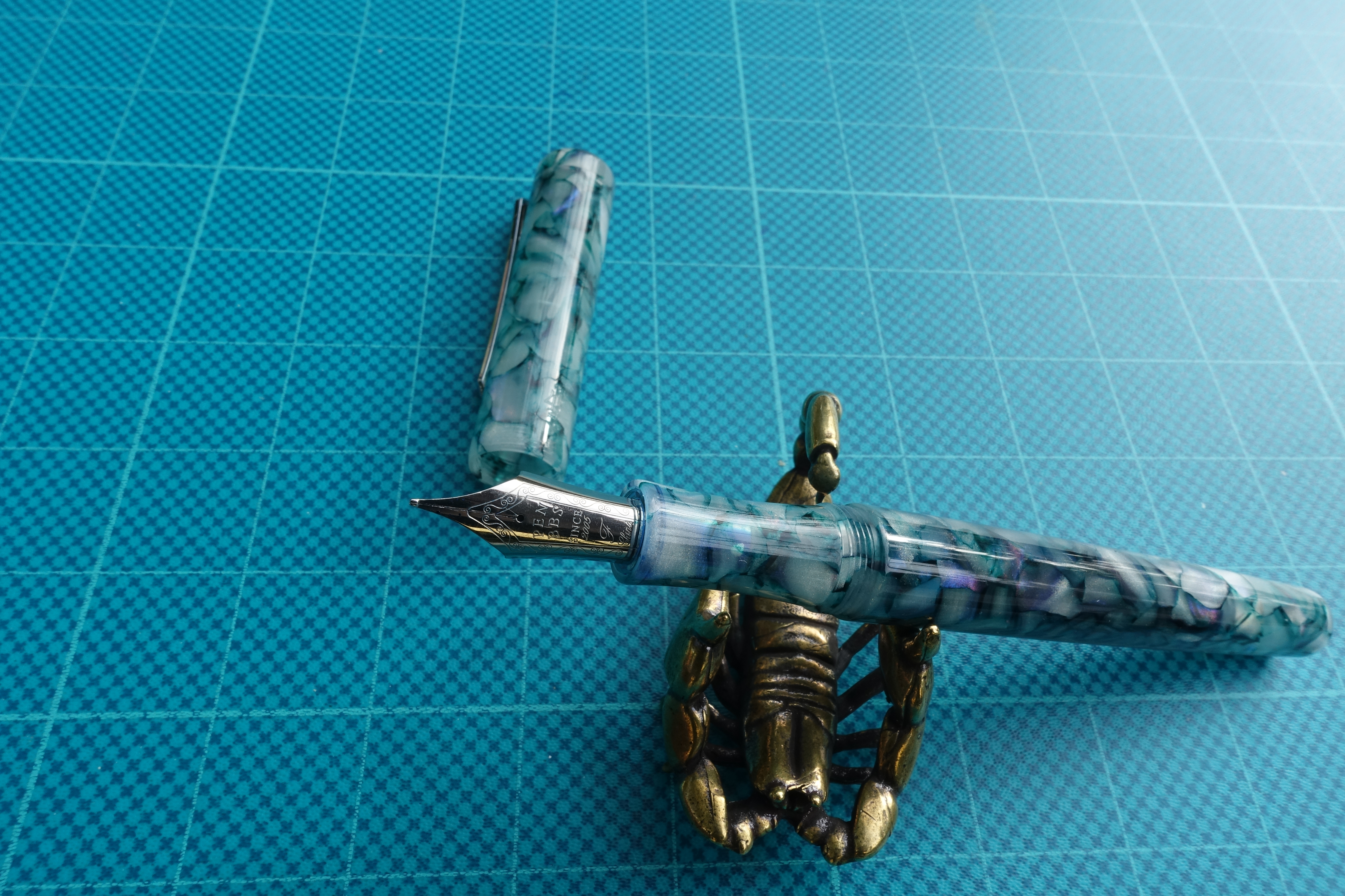 Quello che mi ha spinto all’acquisto è stata la curiosità del particolare sistema di caricamento (per quello che è a mia conoscenza utilizzato solo dalla Piedimonte Pens) e dalla livrea che mi è subito piaciuta, caratterizzata da un acrilico marmorizzato azzurro con riflessi verdi, molto trasparente.