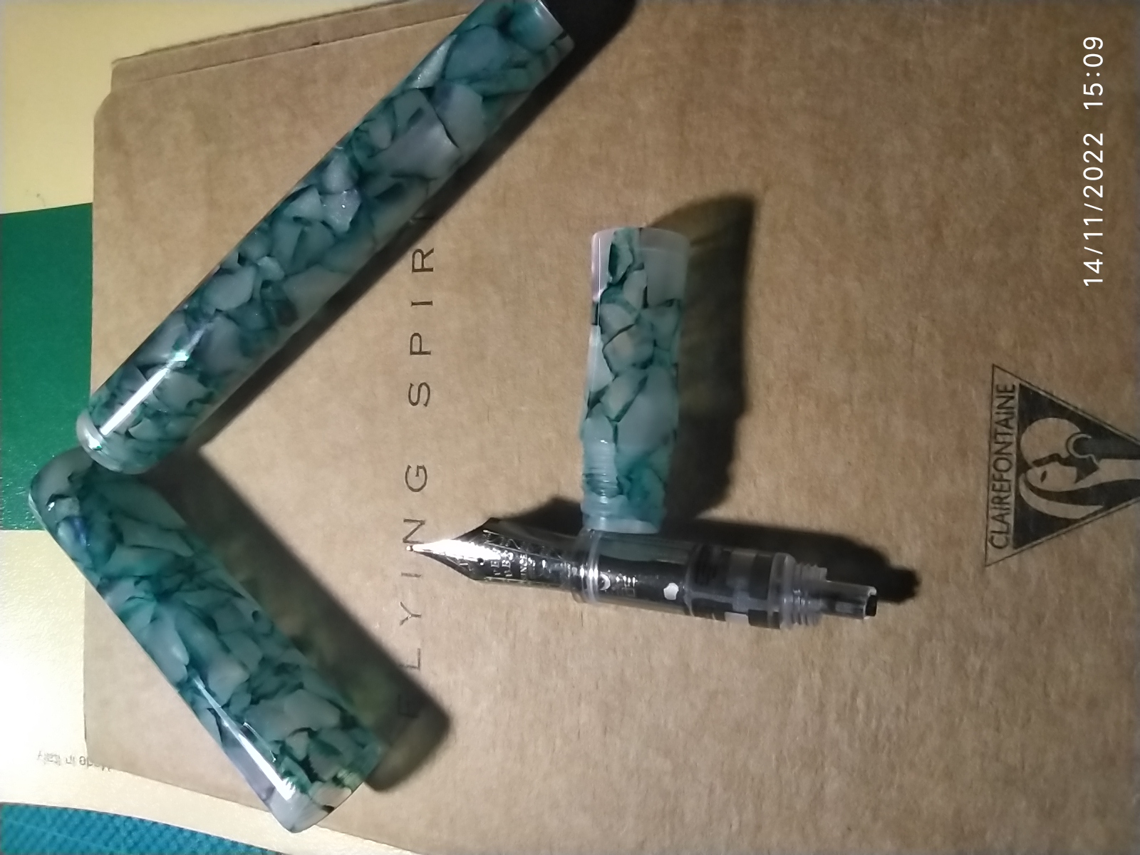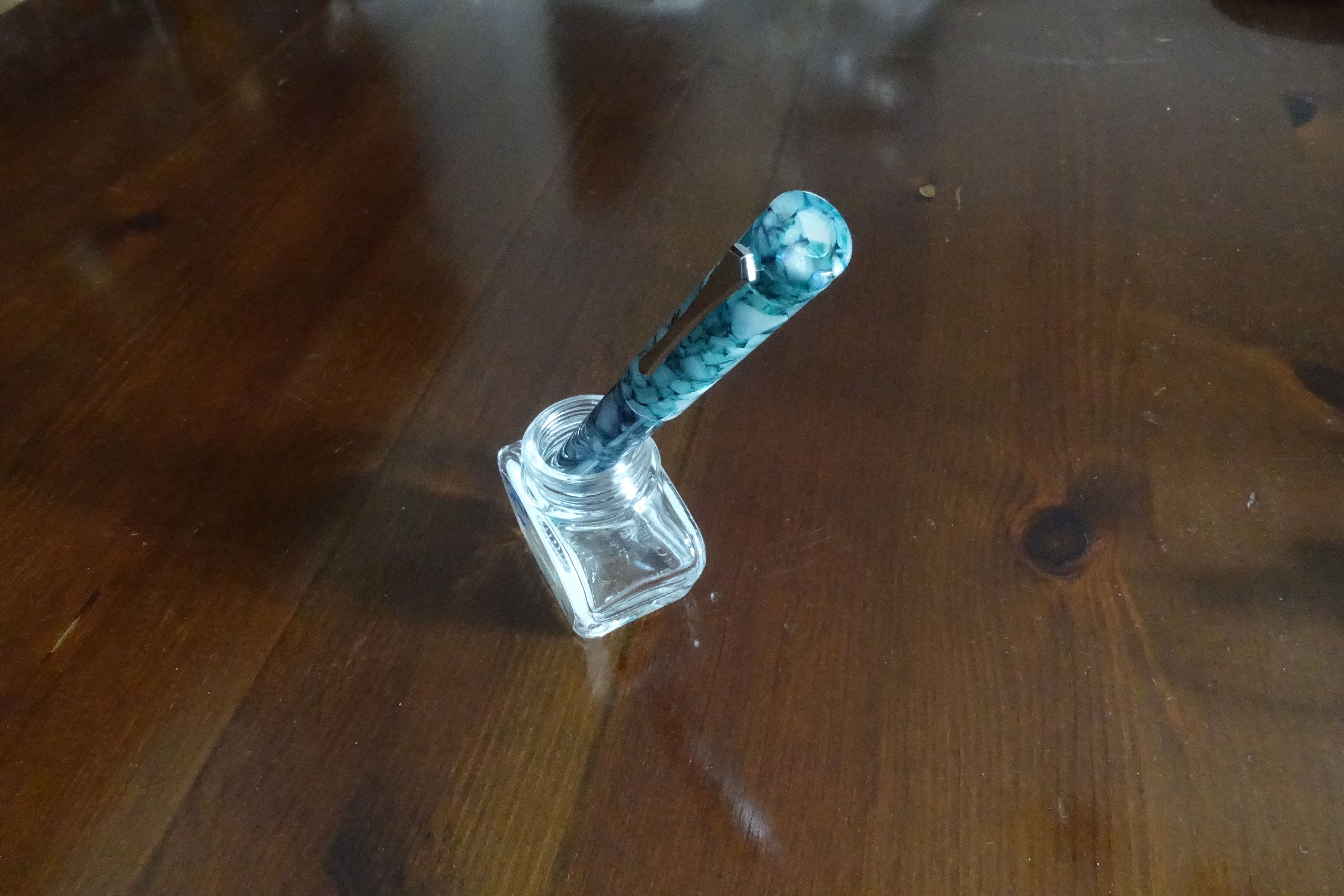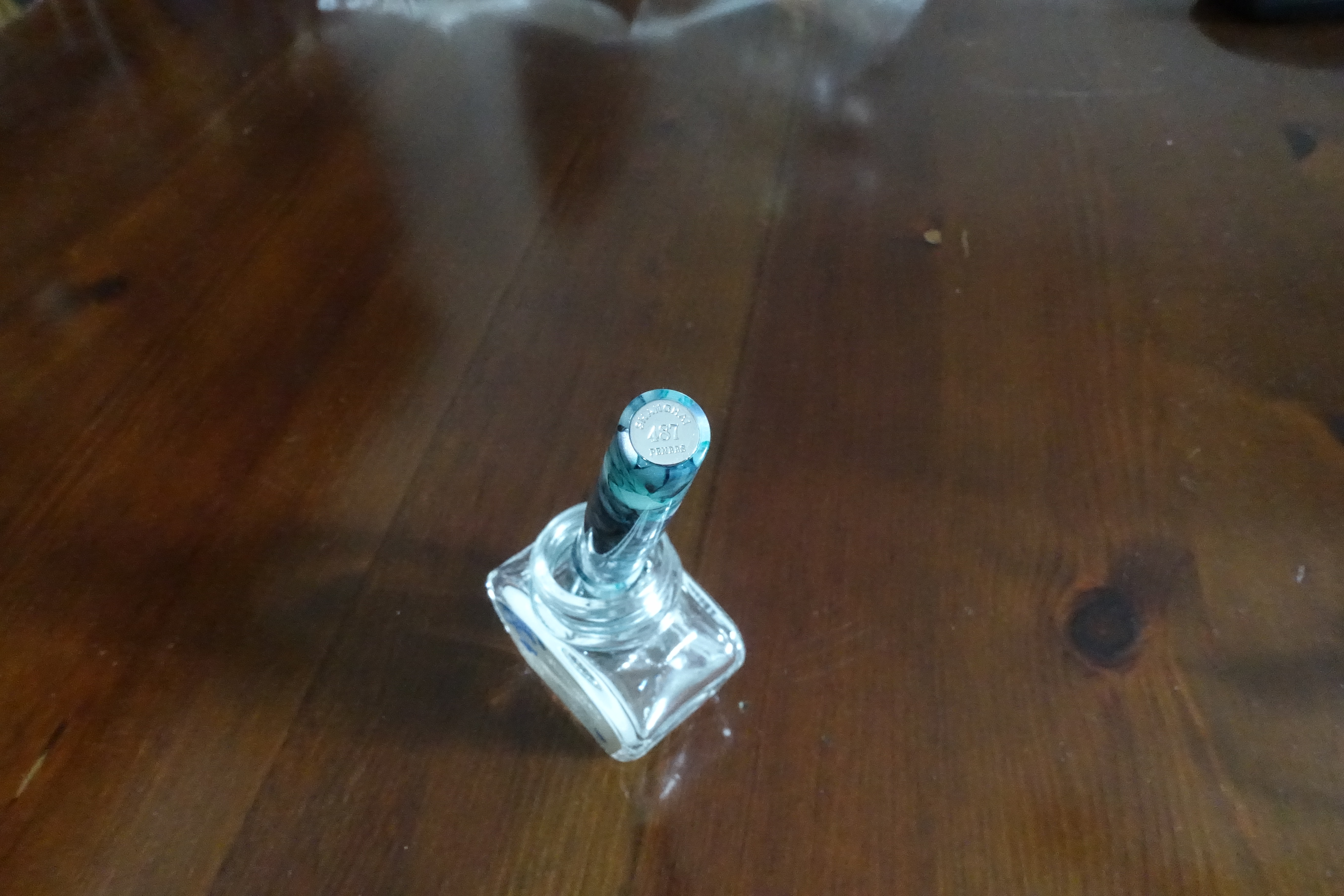 Quello che mi ha spinto all’acquisto è stata la curiosità del particolare sistema di caricamento (per quello che è a mia conoscenza utilizzato solo dalla Piedimonte Pens) e dalla livrea che mi è subito piaciuta, caratterizzata da un acrilico marmorizzato azzurro con riflessi verdi, molto trasparente.