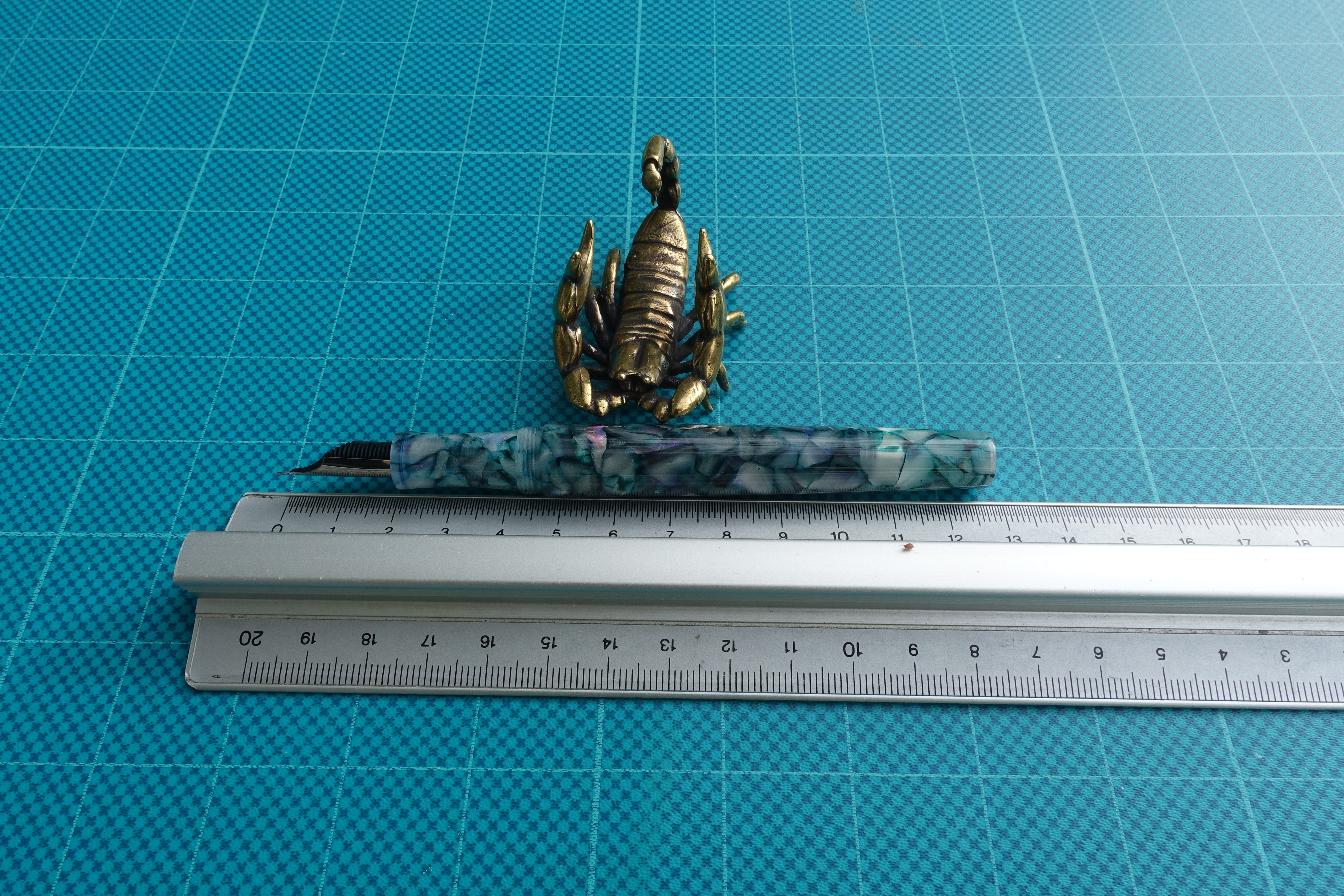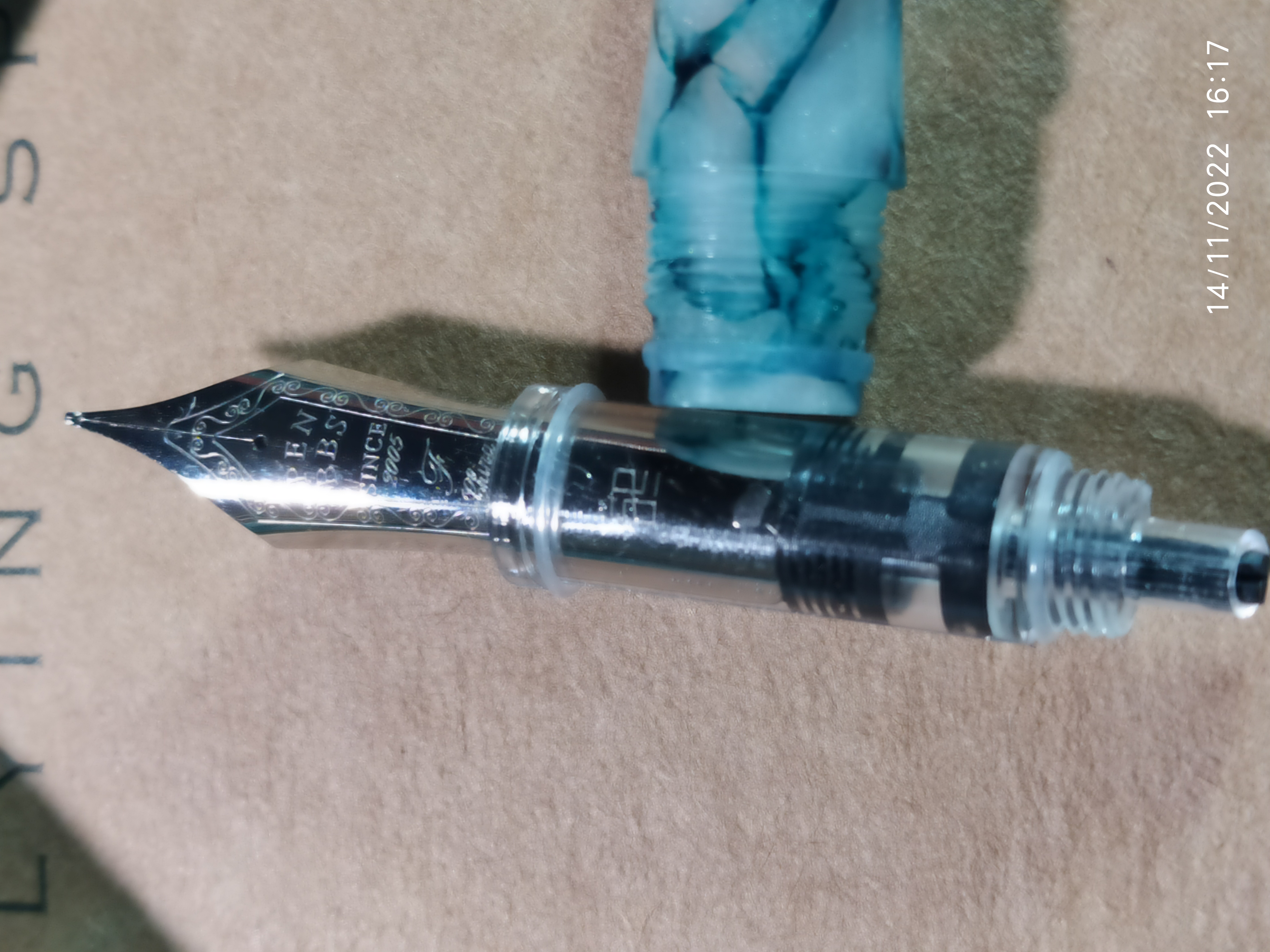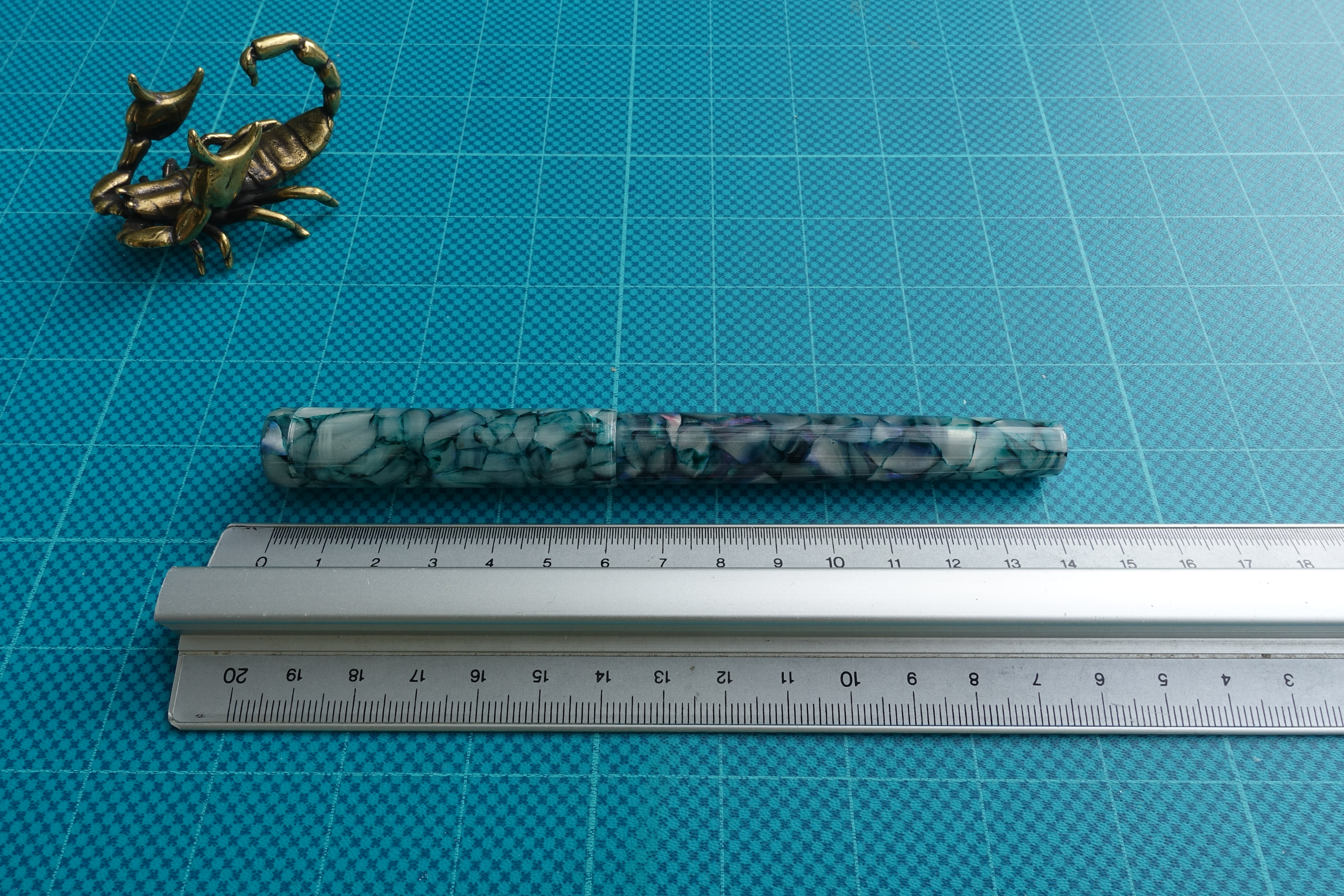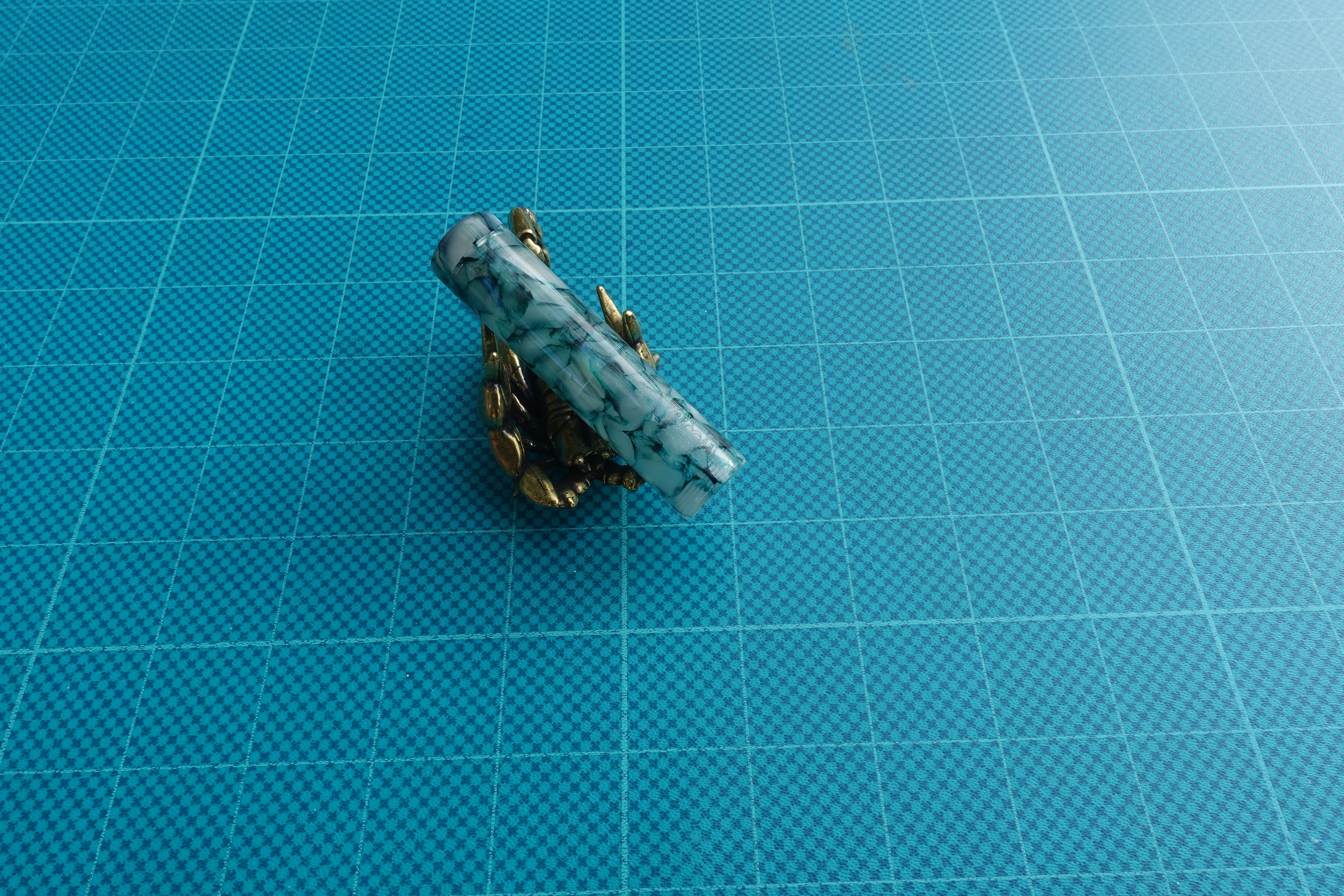 Quello che mi ha spinto all’acquisto è stata la curiosità del particolare sistema di caricamento (per quello che è a mia conoscenza utilizzato solo dalla Piedimonte Pens) e dalla livrea che mi è subito piaciuta, caratterizzata da un acrilico marmorizzato azzurro con riflessi verdi, molto trasparente.