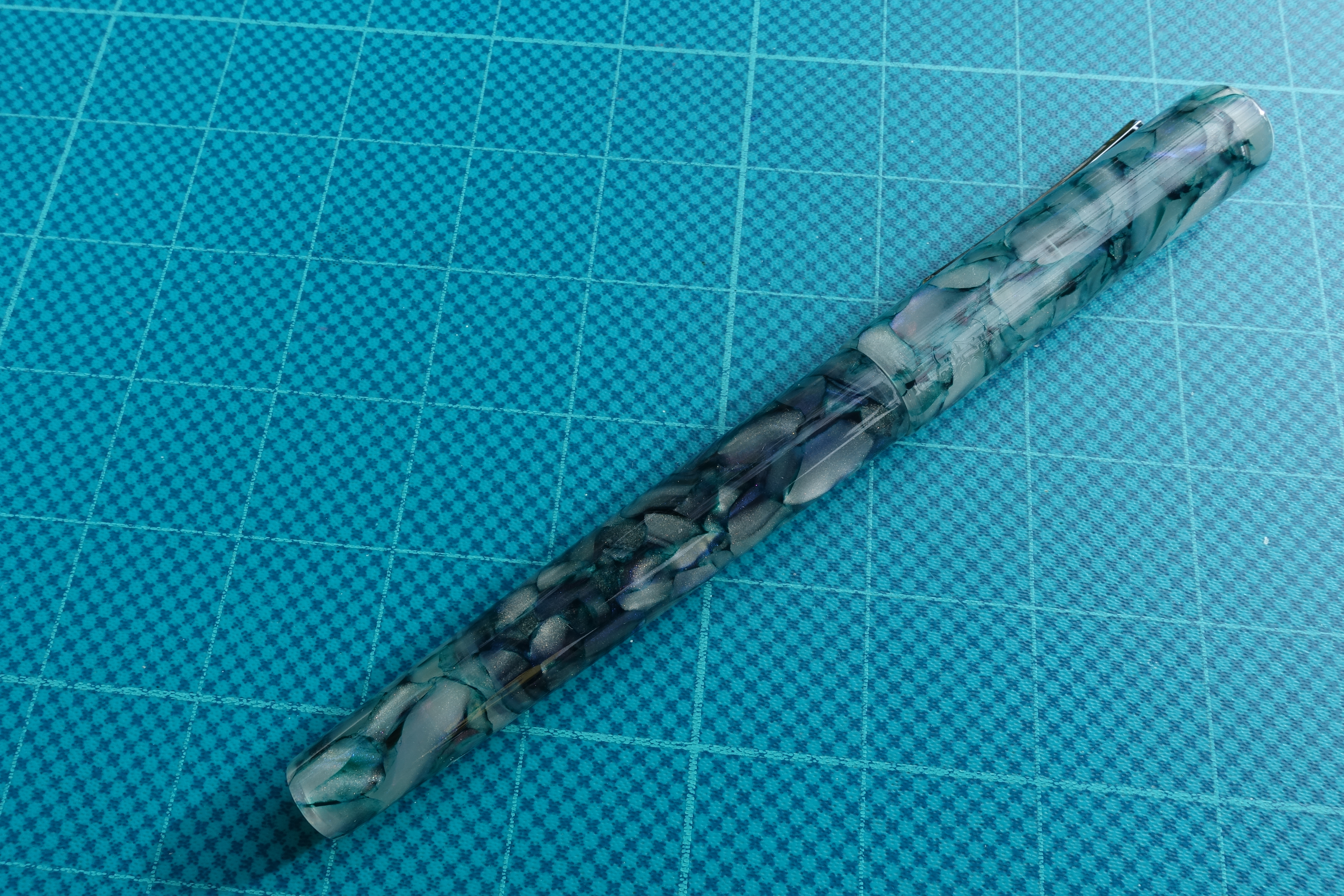 La penna da me acquistata fa parte della serie 487 ed in particolare è il modello “Moonriver”, come detto creato in resina acrilica trasparente marmorizzata azzurro con riflessi verdi. Si presenta con una manifattura minimalista e nel contempo funzionale e rifinita (basti pensare che in totale la penna è composta da soli 14 pezzi).