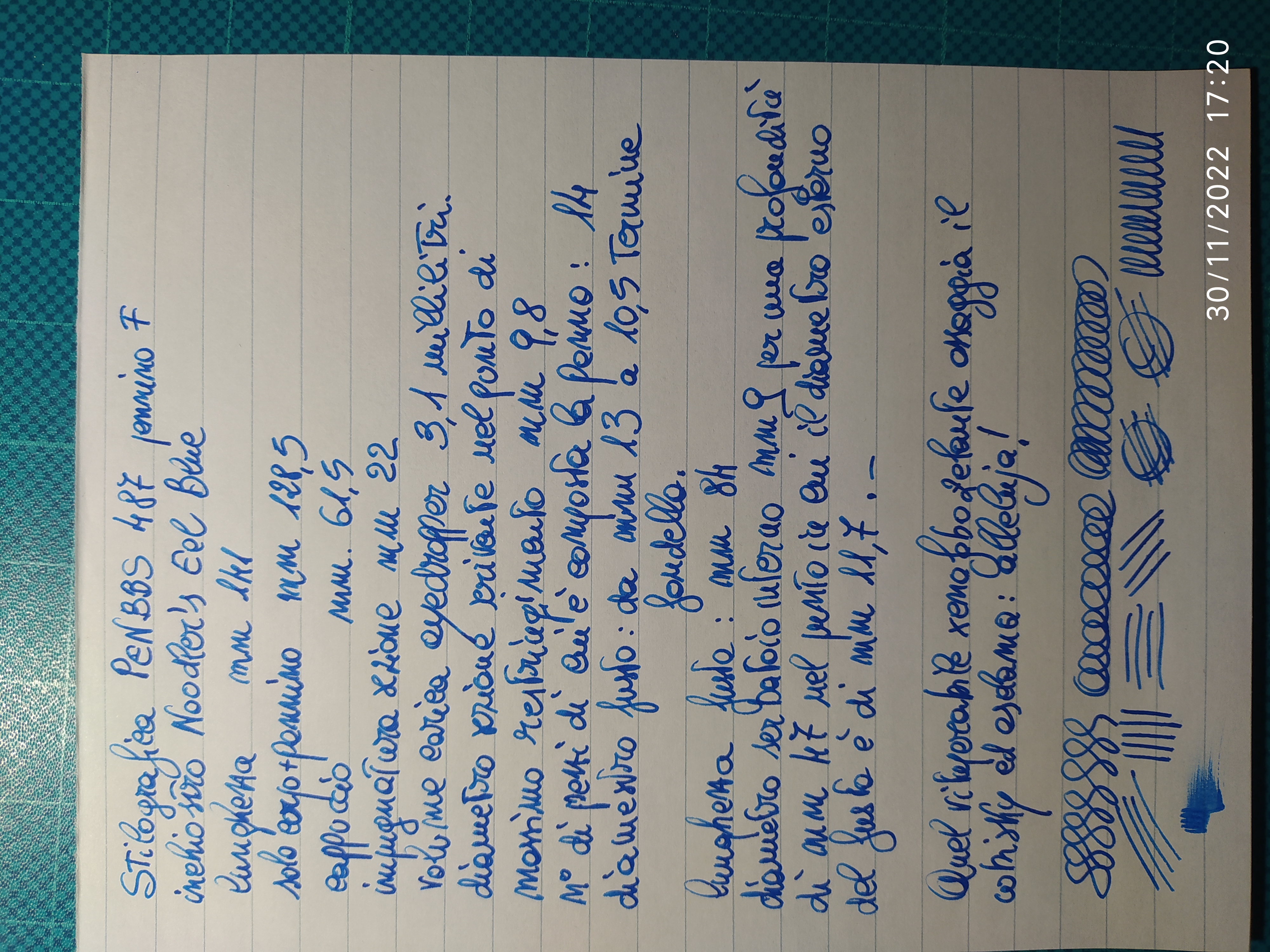 Il pennino, di taglia 6 (mm. di diametro) e lungo mm. 22 (dalla volata della sezione scrivente), con tratto Fine, è in acciaio monocromo, arabescato sull’intero perimetro che racchiude l’incisione del marchio di fabbrica, l’anno di fondazione, il grado di tratto e la nazione d’origine. Non sono in grado di dire se sia prodotto da fonte esterna e poi brandizzato oppure fatto da PENBBS. Il conduttore è in ABS. Il tratto di scrittura del pennino è Fine certamente più europeo che orientale: inizialmente con un flusso molto magro (sembra sia una costante per i pennini provenienti dalla Cina) tanto che l’ho dovuto manipolare per renderlo con un flusso umido più confacente alle mie preferenze.