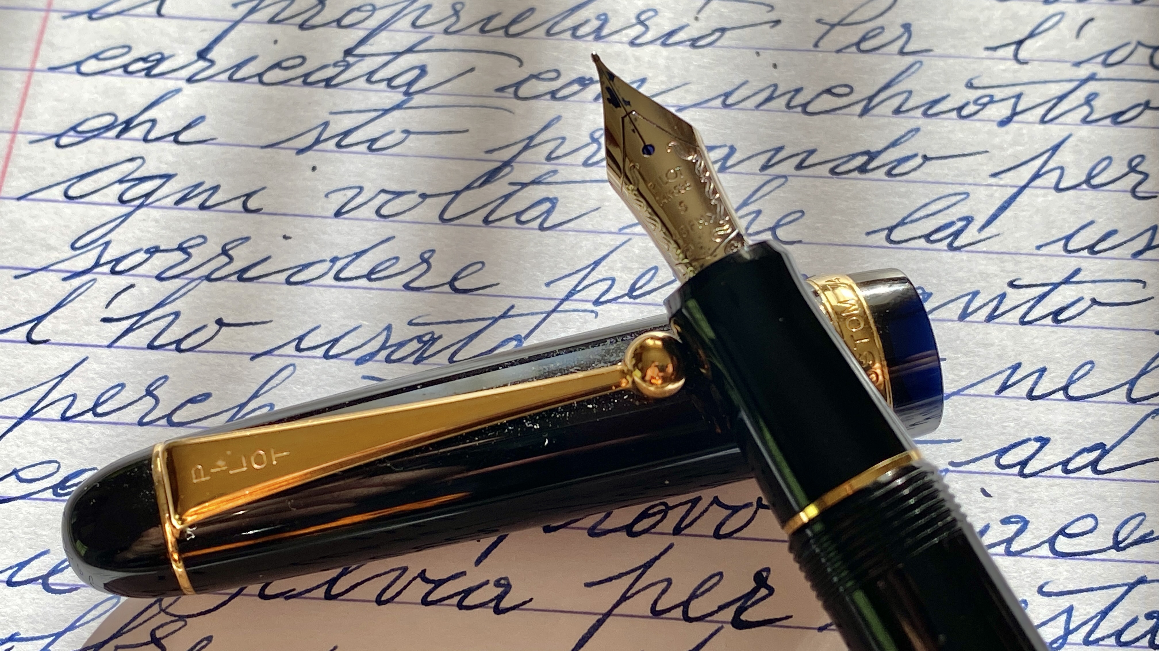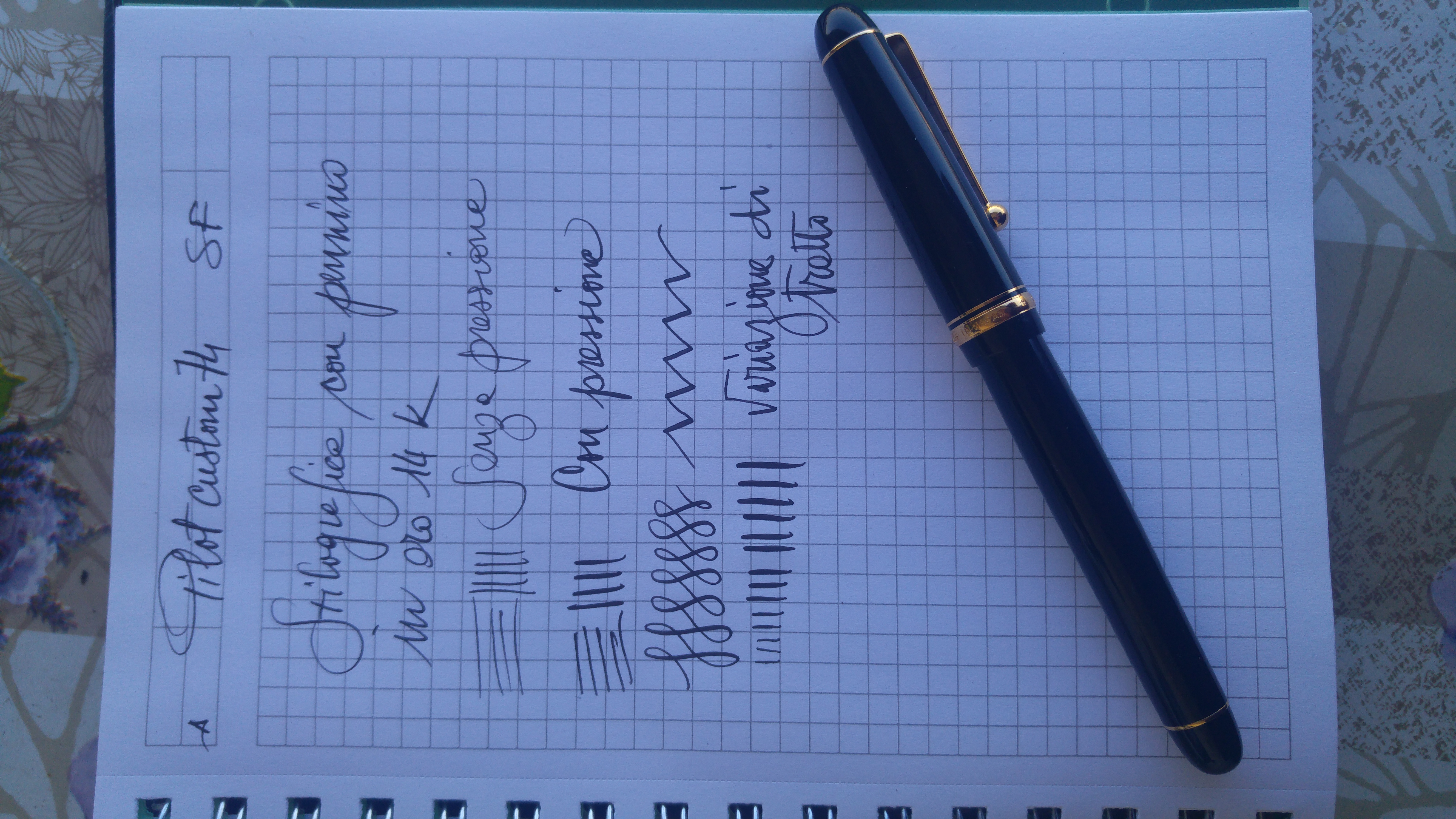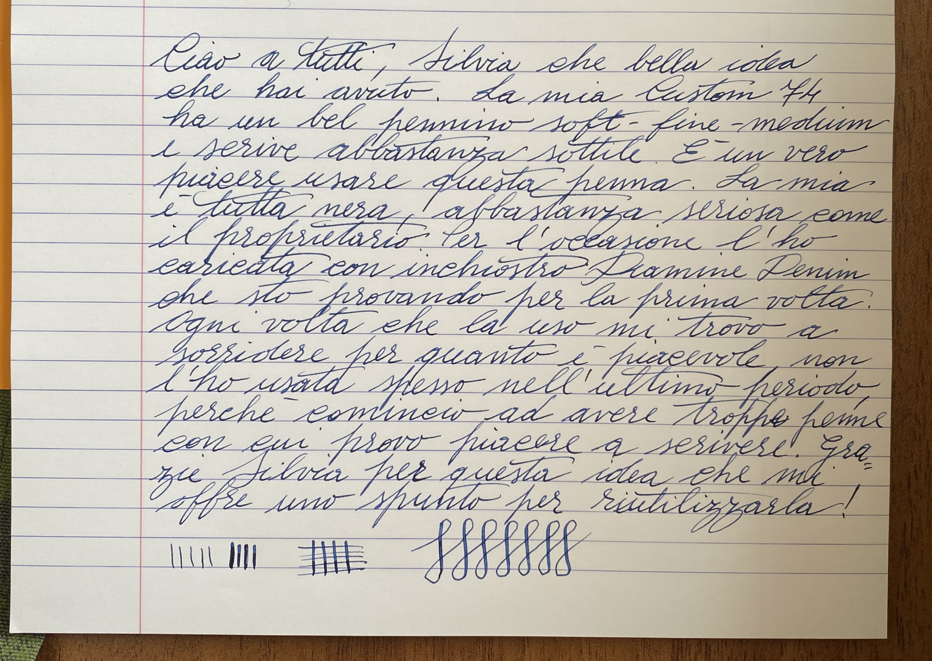 Ciao a tutti, Silvia che bella idea che hai avuto. La mia Custom 74 ha un bel pennino soft-fine-medium e scrive abbastanza sottile. È un vero piacere usare questa penna. La mia è tutta nera, abbastanza seriosa come il proprietario. Per l’occasione l’ho caricata con inchiostro Diamine Denim che sto provando per la prima volta. Ogni volta che la uso mi trovo a sorridere per quanto è piacevole, non l’ho usata spesso nell’ultimo periodo perché comincio ad avere troppe penne con cui provo piacere a scrivere. Grazie Silvia per questa idea che mi offre uno spunto per riutilizzarla.
