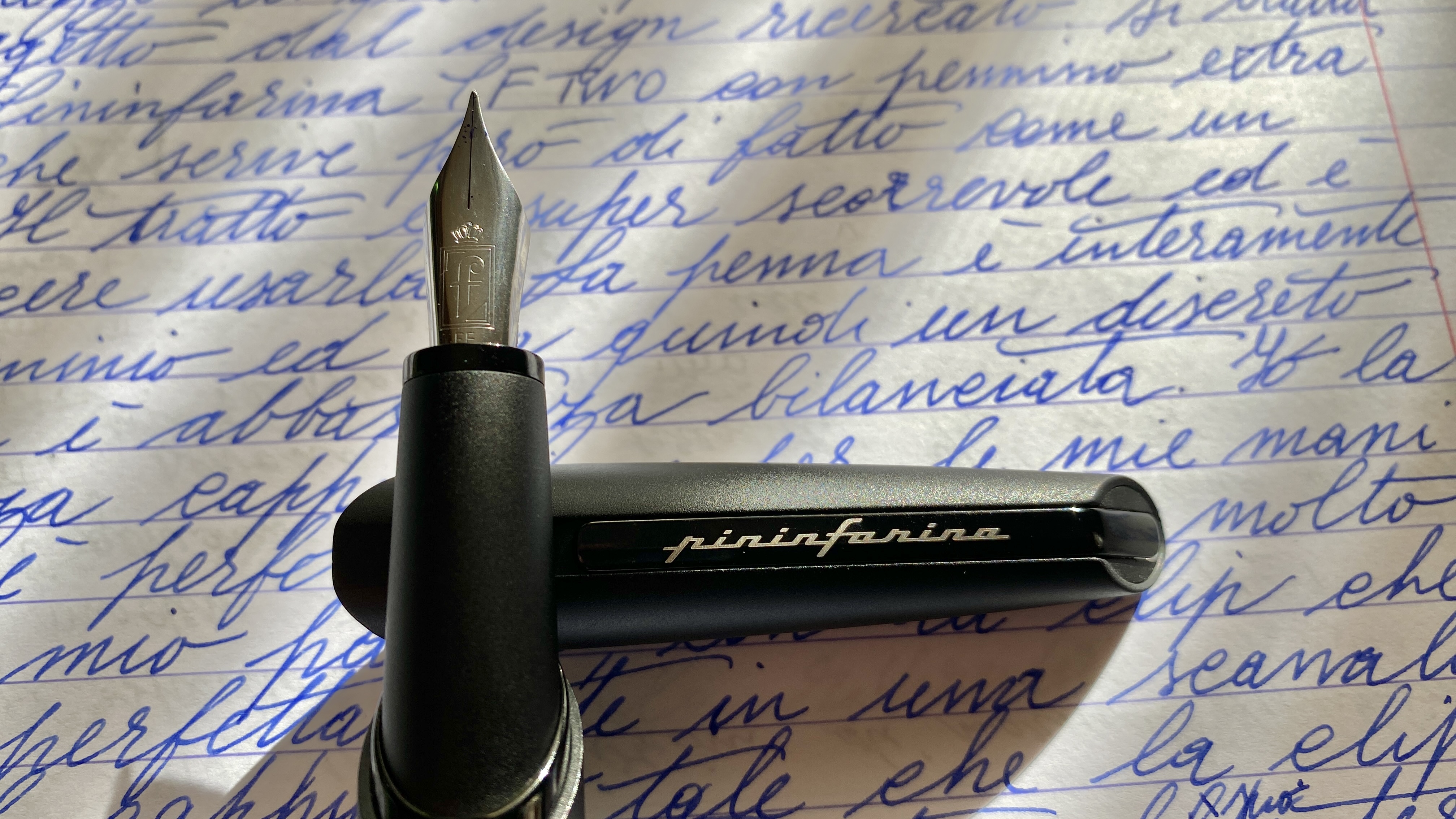 Ciao a tutti, di seguito le mie impressioni di utilizzo di questa penna che è anche un oggetto dal design ricercato. Si tratta della Pininfarina PF TWO con pennino extra fine che scrive però di fatto come un fine. Il tratto è super scorrevole ed è un piacere usarla. La penna è interamente d’alluminio ed ha quindi un discreto peso ma è abbastanza bilanciata. Io la uso senza cappuccio e per le mie mani medie è perfetta. Ha un design molto bello a mio parere con la clip che risiede perfettamente in una scanalatura nel cappuccio tale che si inserisca al suo interno senza sporgere nemmeno di un millimetro. La sezione è anch’essa d’alluminio satinato, non è il massimo per il grip ma non risulta comunque scivolosa, vedremo in estate. La confezione è in linea con l’immagine della penna e contiene una cartuccia, che sto usando adesso, e un converter a vite. Da quello che ho letto e sentito sembra che la penna abbia un pennino Jowo con alimentatore Schmidt che compensa gli sbalzi di pressione. Il pennino comunque è personalizzato con il logo dell’azienda ed è privo di foro di sfiato.