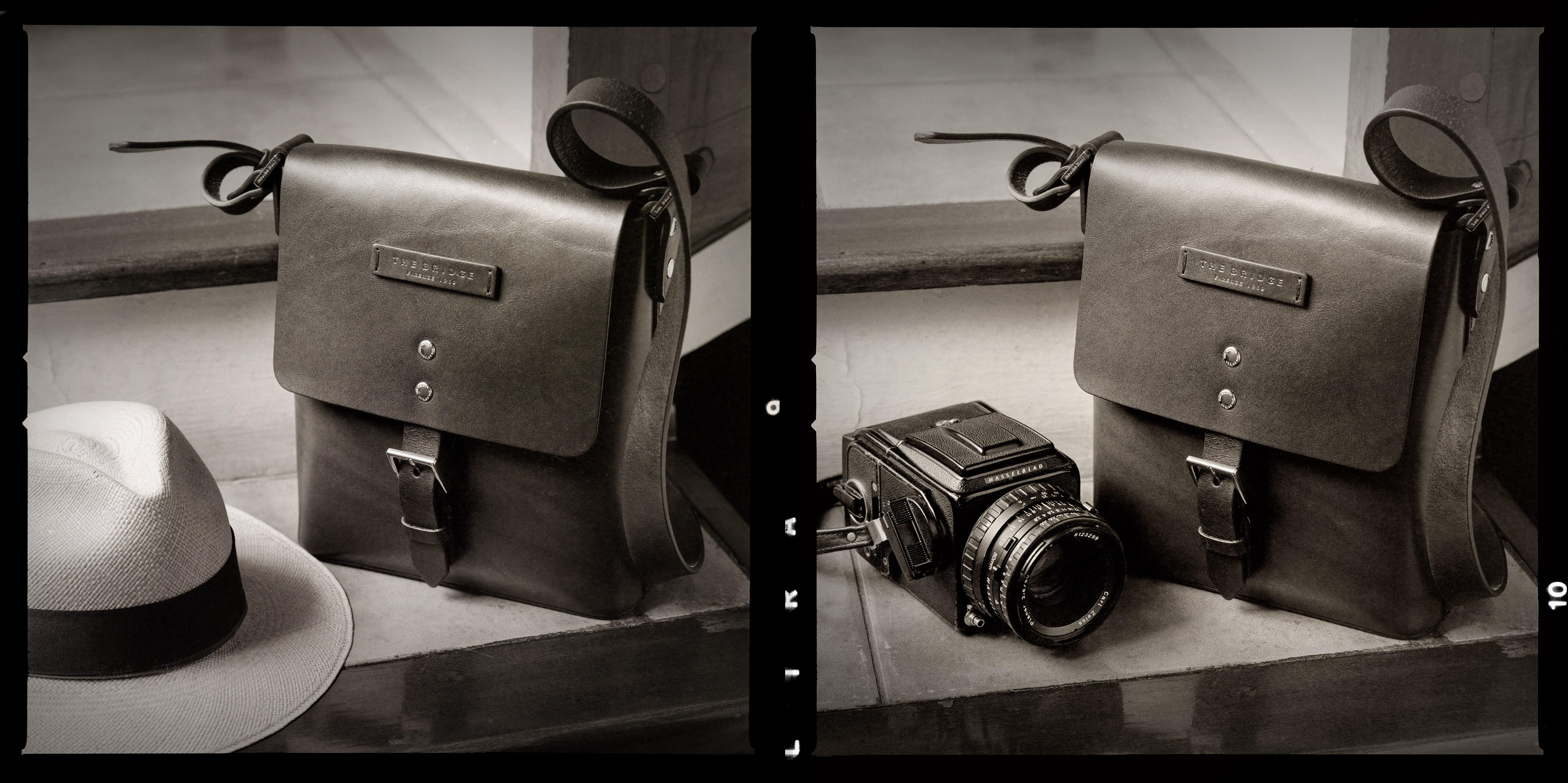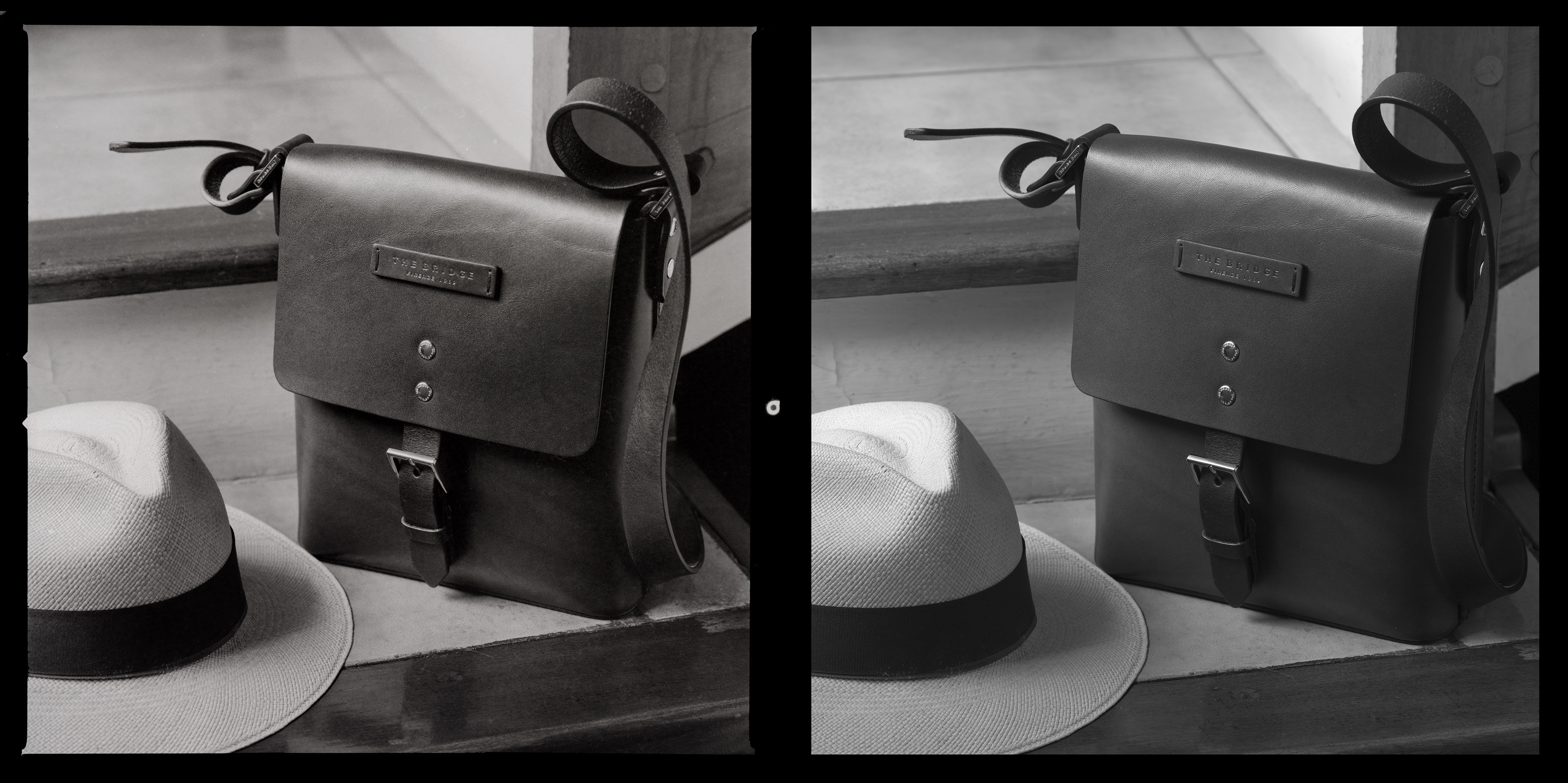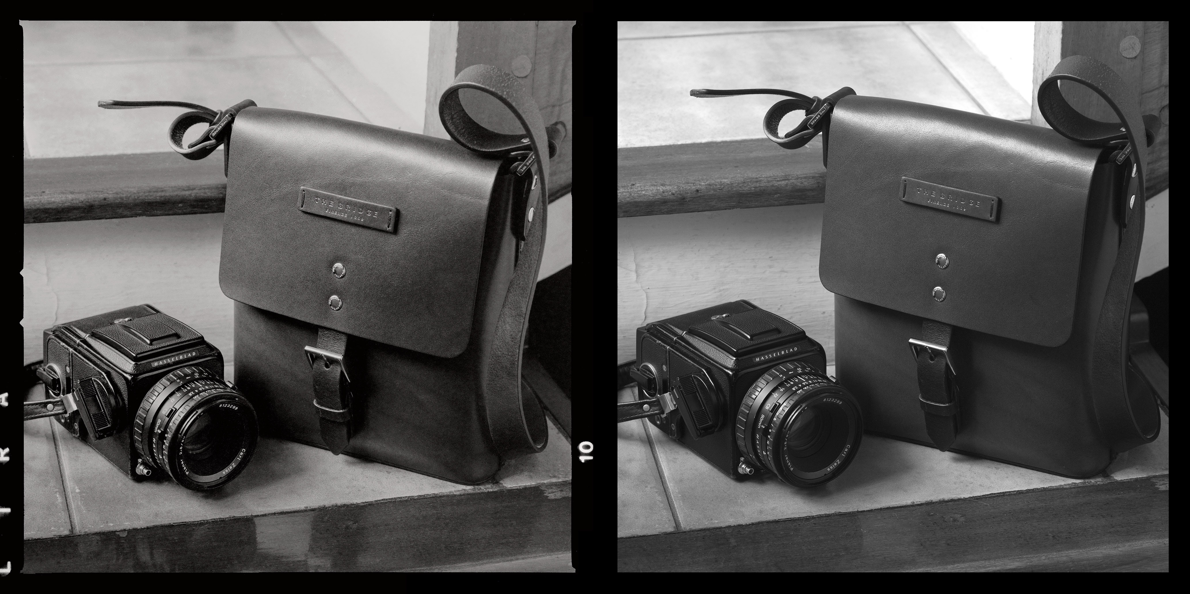 Qui ho utilizzato lo stesso obiettivo, uno Zeiss Makro-Planar 135 mm su tubo variabile, quasi al massimo ingrandimento possibile. La foto di sinistra é fatta con una Hasselblad 501CM su pellicola in bianco e nero (56x56 mm) Fomapan da 100 ISO. La foto di destra é fatta con la Hasselblad H5D sul suo sensore da 50MP (36.7 x 49.1 mm, poi tagliato a 36.7 x 36.7 mm, pari a circa 38MP), anch’esso esposto a 100ISO per un confronto più equo. Entrambe le coppie di immagini (borsa e cappello, borsa e fotocamera) sono esposte a f/13 per 2” (appena un poco di più nella foto su pellicola, per compensare il maggior ingrandimento). La pellicola é stata sviluppata in Ilfosol-3, diluizione 1+14, 20.5 gradi, per 7’30”. L’immagine sulla pellicola é stata poi fotografata con la Hasselblad H5D e invertita a positiva: qui è cosí come “esce” dalla fotocamera. L’immagine del sensore é stata esportata direttamente da Phocus in formato TIFF è convertita in bianco/nero senza aggiustamenti.