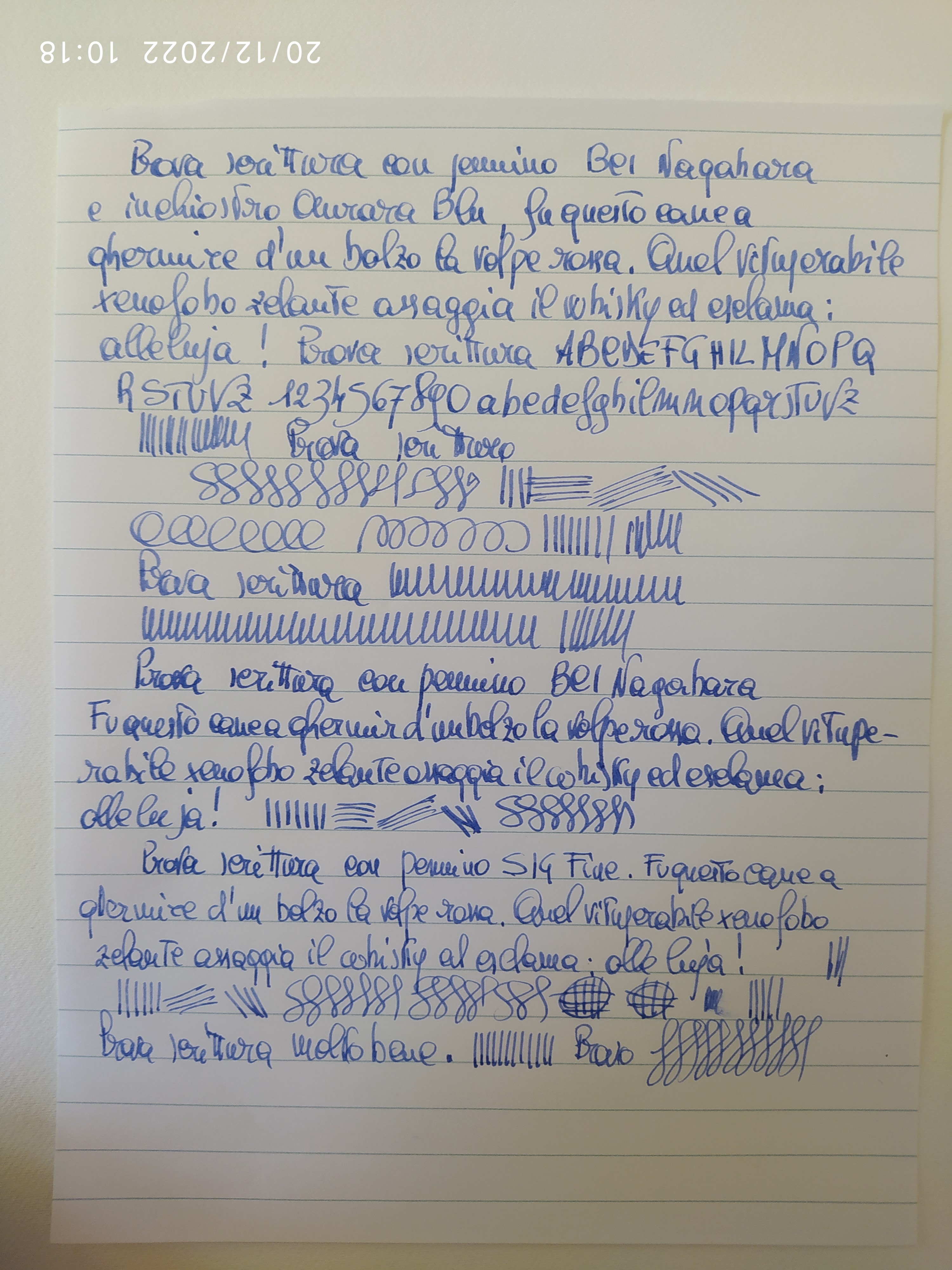 Vorrei precisare il mio concetto su questi pennini: sono in sostanza degli Italici (Stub per come la vedo io è solo una denominazione commerciale, sempre Italico si tratta seppur più addomesticato) e come tale si comportano sebbene concedano una maggiore “familiarità”. Io certamente non sono un calligrafo ed il primo approccio mi ha lasciato un po' perplesso, soprattutto il S.I.G. . Non sono pennini per scritture veloci e nervose perché, almeno io, in tale procedura è facile che si esca dal loro angolo di applicazione ottimale (non ricordo il termine esatto in inglese!) e quindi il pennino inizia a grattare sulla carta, soprattutto nel tratti ascendenti e a sinistrogiro . Secondo notizie attinte in rete il range di angolo ottimale entro il quale si può usare il B.C.I. è di circa 20° che diventano 15° per il S.I.G. F a fronte dei 40° circa per un pennino normale in gradazione M. Però una volta individuata l’esatta postura la scrittura regala una piacevolezza non eguagliabile dai normali pennini.