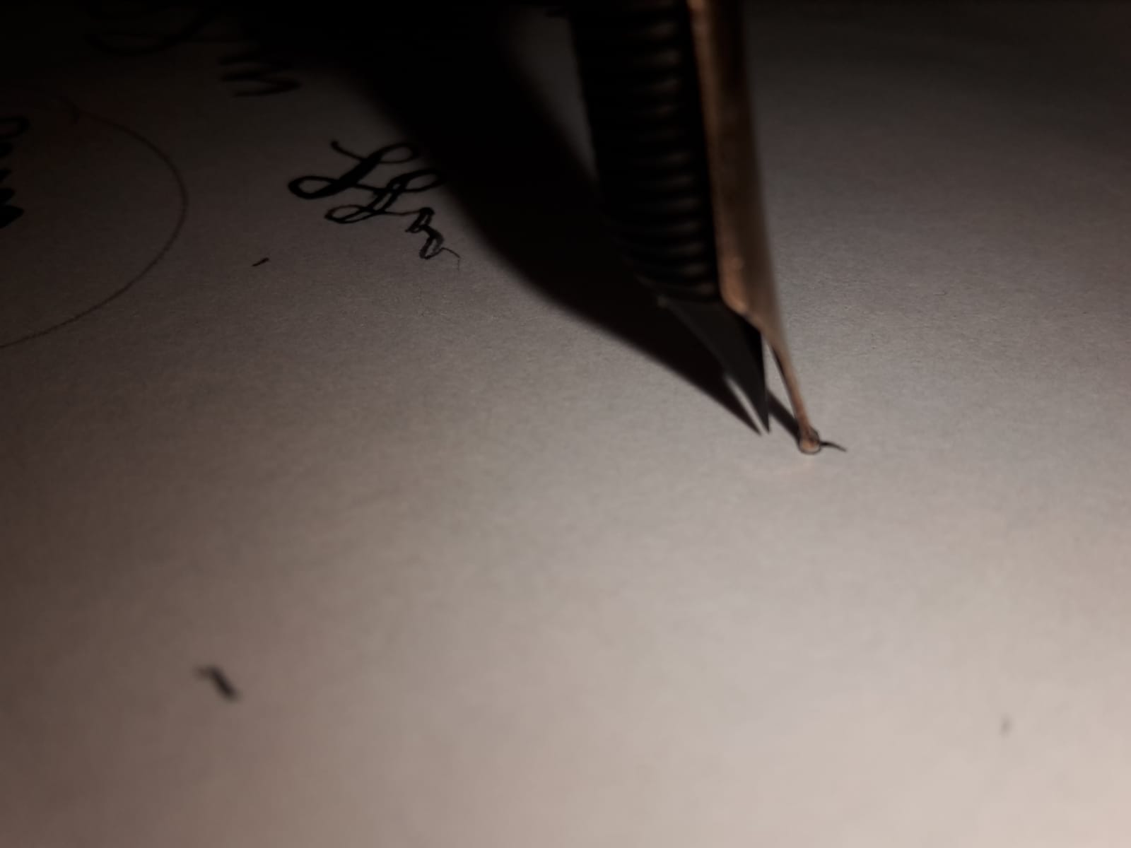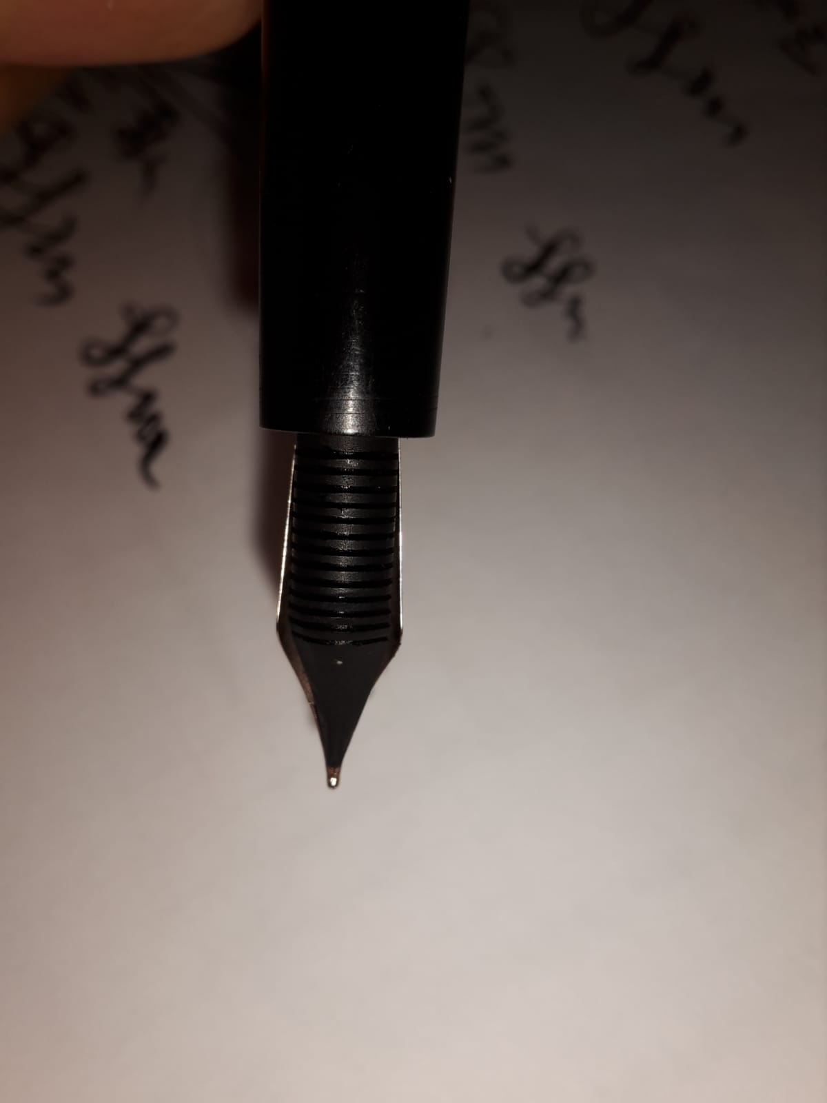 La penna è estremamente scorrevole e il flusso d’inchiostro del conduttore abbondante, quando vado a scrivere normalmente. Tuttavia, nell’istante in cui premo per modulare il tratto, l’inflessione dei due rebbi fa sì che la parte terminale del pennino (e quindi appunto i rebbi) si stacchi dalla punta del conduttore; di conseguenza l’inchiostro non raggiunge il penino e quindi sul foglio si formano i due binari paralleli finché poi la penna non scrive più. Premendo, dopo, il pennino col conduttore, la penna riprende a scrivere come sempre, ma il problema torna a sorgere nell’istante della modulazione.