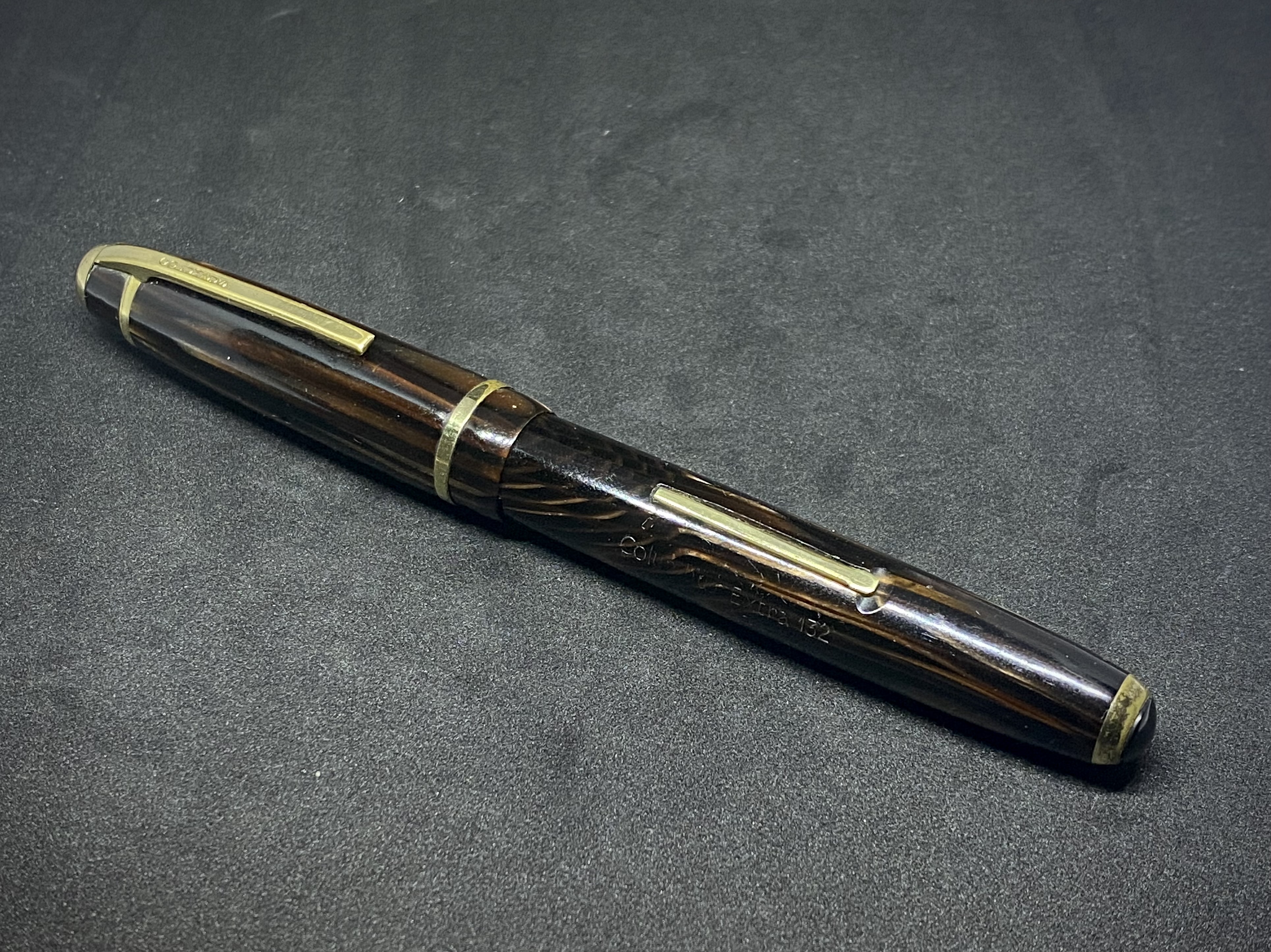 Questa che vi mostro è una Columbus Extra 132 in celluloide Arco Marrone ritrovata in un mercatino un mesetto fa. La penna ha avuto solo bisogno di un nuovo sacchetto ed una leggera lucidata per tornare in pista. Premetto che non sono un maniaco della lucidatura, a meno di graffi profondi o danni che necessitano di una riparazione, di norma mi limito ad una passata con un panno e un po' di Sidol sulle parti metalliche per togliere tracce di ossidazione e ad una leggera passata di Iosso sul resto della penna. Evito di rimuovere le meritate cicatrici e segni del tempo, per me fanno parte della storia della penna e le rendono persino onore!