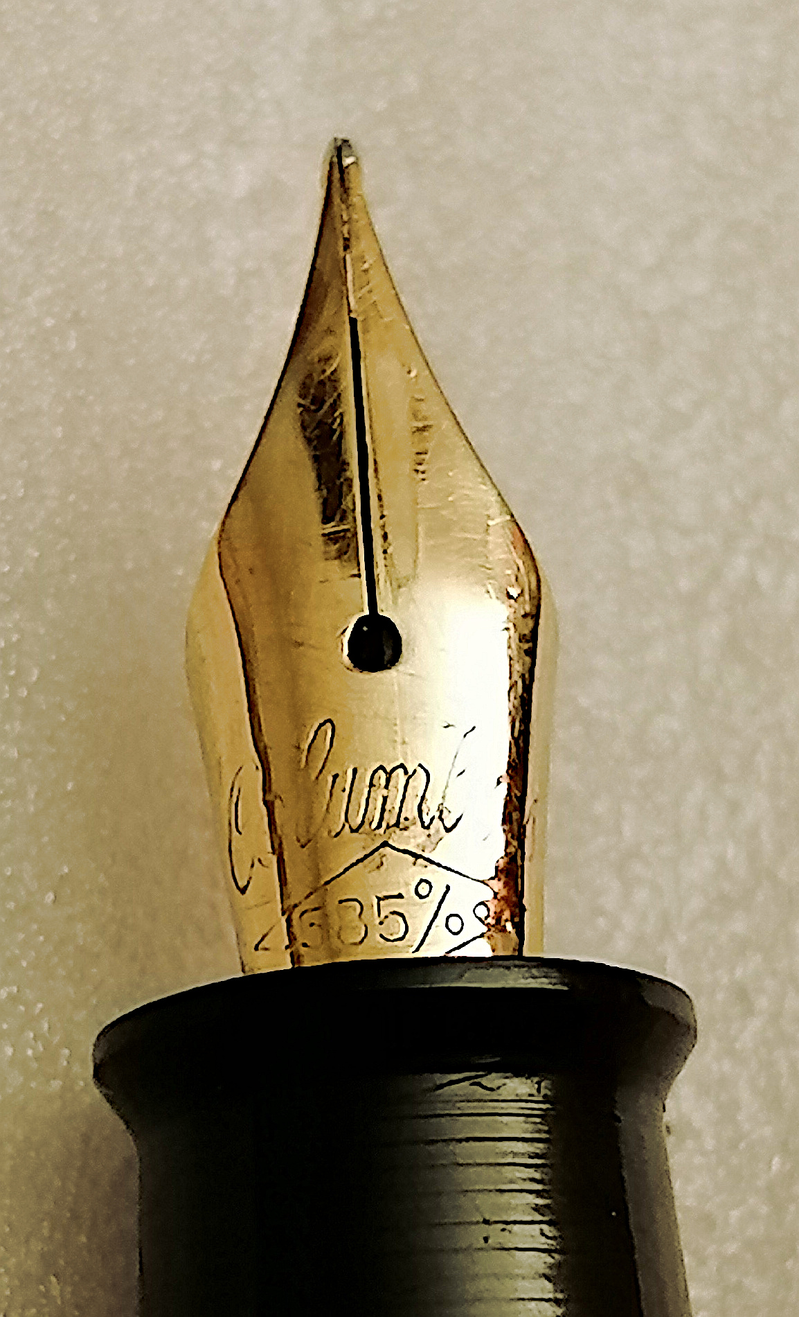 Il pennino è l'originale Columbus di produzione italiana iniziata nei primi anni del 1930. Precedentemente, invece, i pennini venivano importati dalla Germania. Su questo pennino troviamo inciso Columbus in corsivo e il titolo dell'oro, 585, in un rombo. Molto raffinato anche il design del conduttore in ebanite, alla base del quale troviamo una fascia centrale tra le due file di alette, con un solco inciso, un po' a ricordare i conduttori SkySlope di Montblanc. Del resto, agli albori del marchio Columbus, la produzione ebbe una forte influenza dalla produzione tedesca, in particolare di Montblanc, a cui si ispirava per le sue prime safety pen.