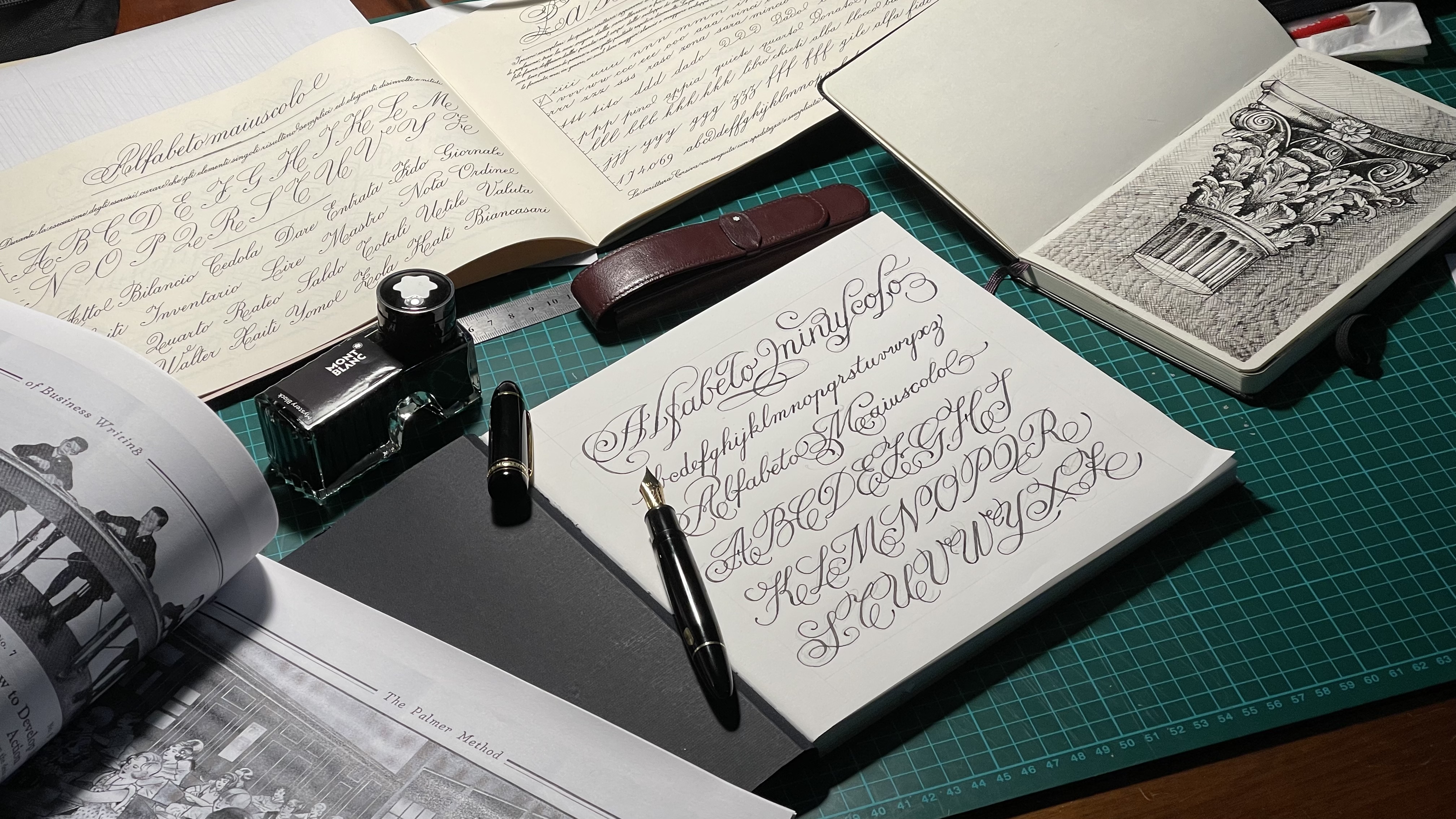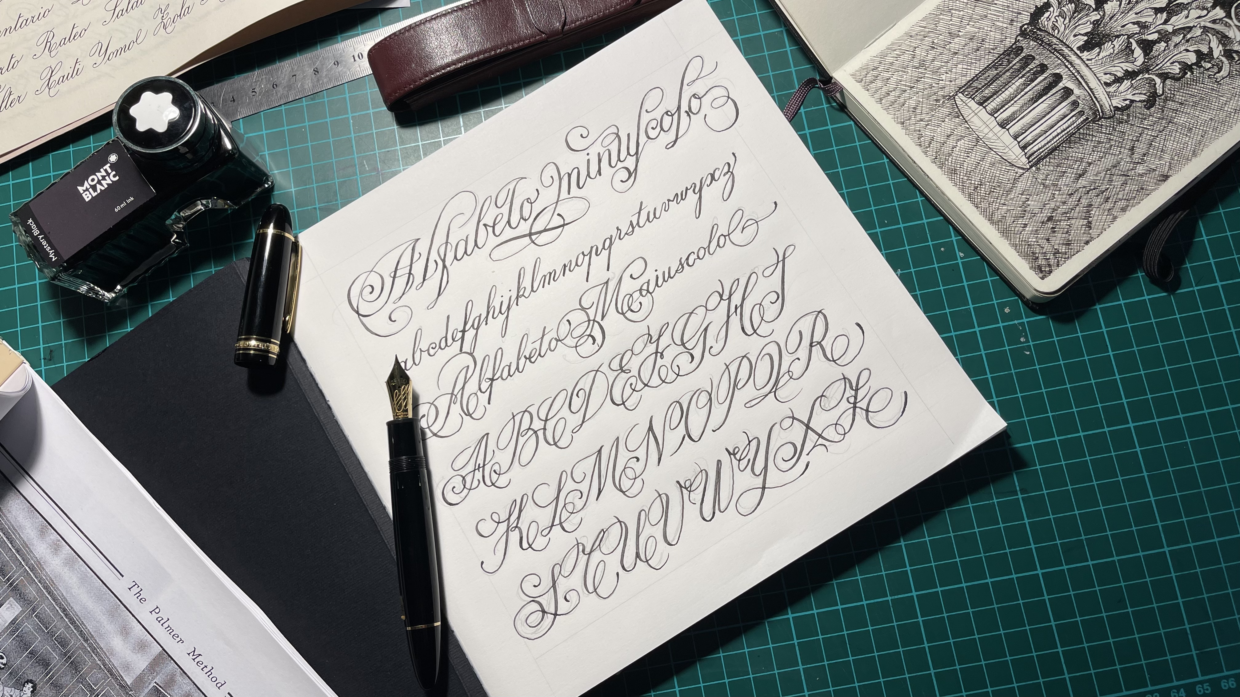 In foto una piccola tavola realizzata da me usando il corsivo inglese ed una montblanc 149 calligraphy , inchiostro nero montblanc e fogli Fabriano .