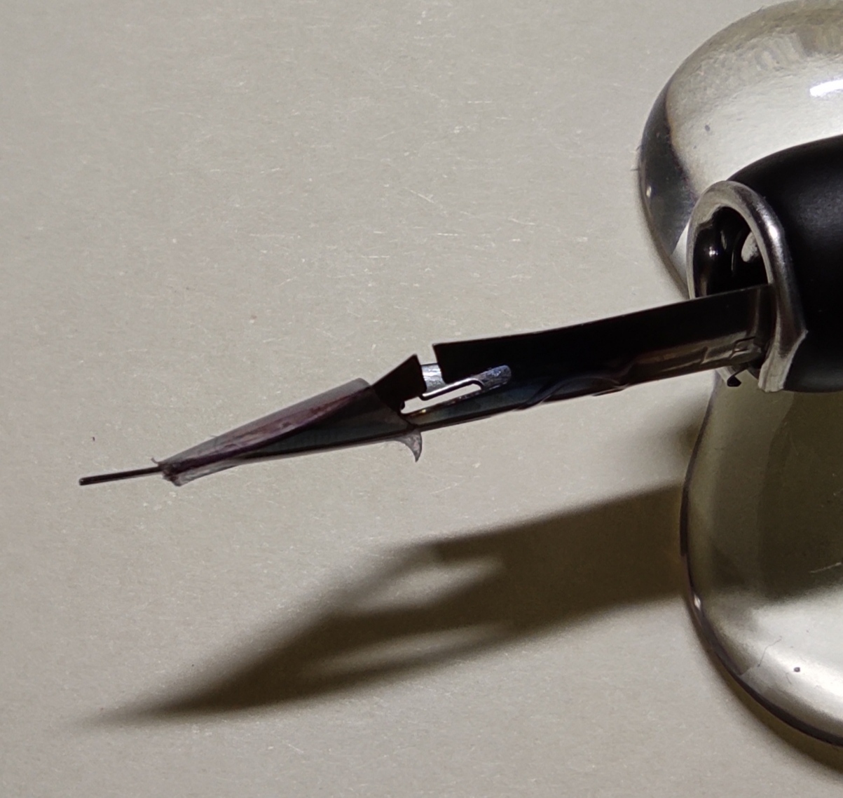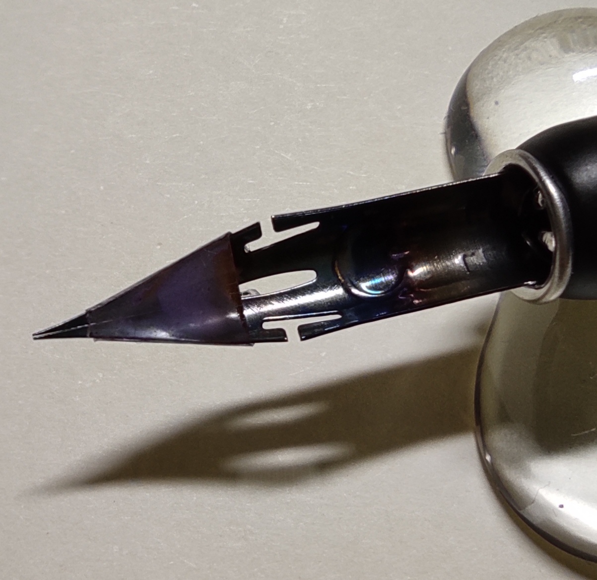 la scarsa utilità degli inchiostri stilografici mi ha indispettito, ma mi ha anche fatto aguzzar l'ingegno. Mi sono costruito così una sorta di alimentatore/serbatoio di nastro adesivo da applicare sotto il pennino. Con un po' di pratica sono riuscito a tagliare e posizionare opportunamente il nastro in modo da lasciare il pennino (Leonardt G,in foto, e Leonardt #40) libero di aprirsi. Questo trucchetto non solo rende gli inchiostri stilografici più usabili, ma rende più facile anche l'uso di tutti gli altri colori: c'è più margine (in entrambi i sensi, verso il denso e verso l'acquoso) con le tempere e gli acquerelli e ovviamente passa molto più tempo tra intingimenti successivi.