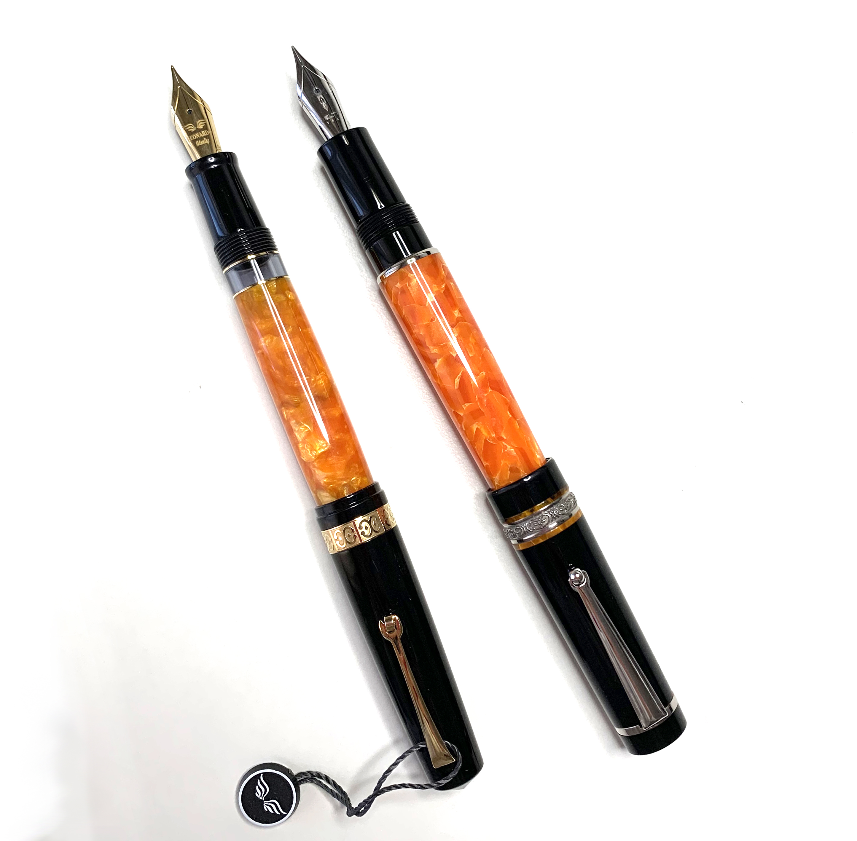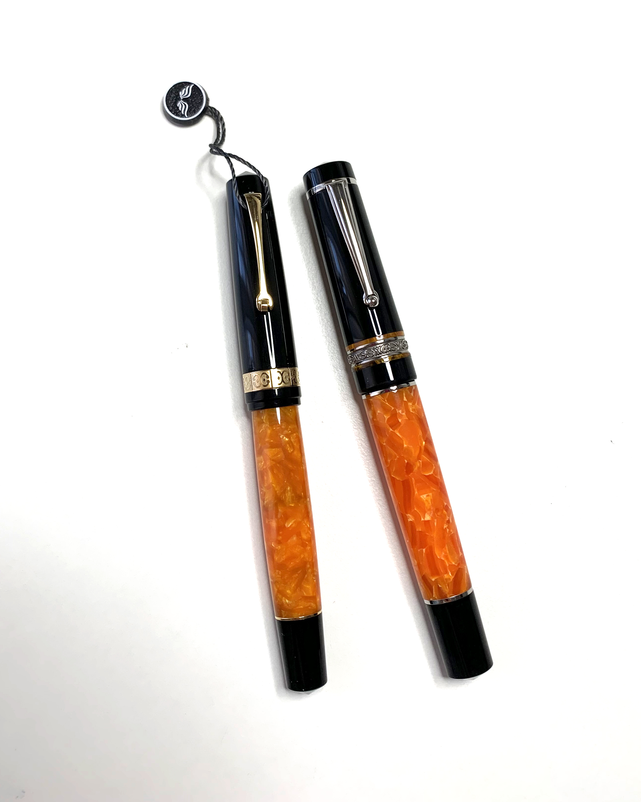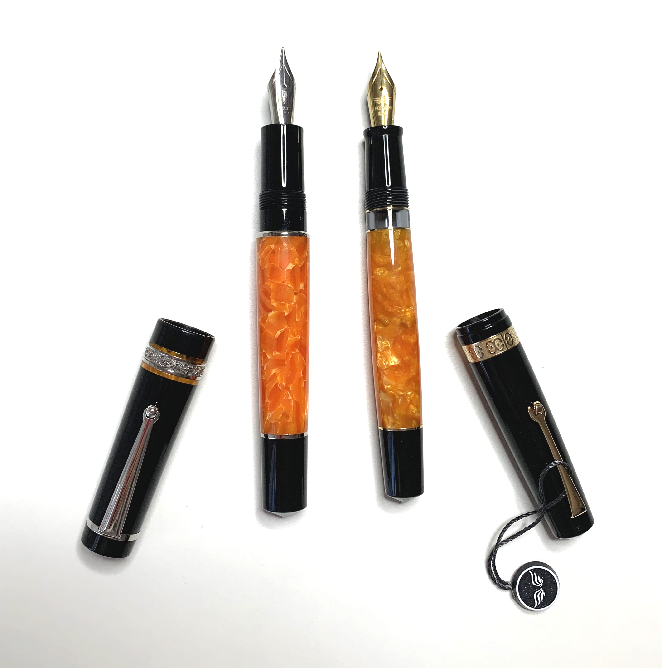 Entrambe con cappuccio e impugnatura nera, e fusto arancio vivace marmorizzato.