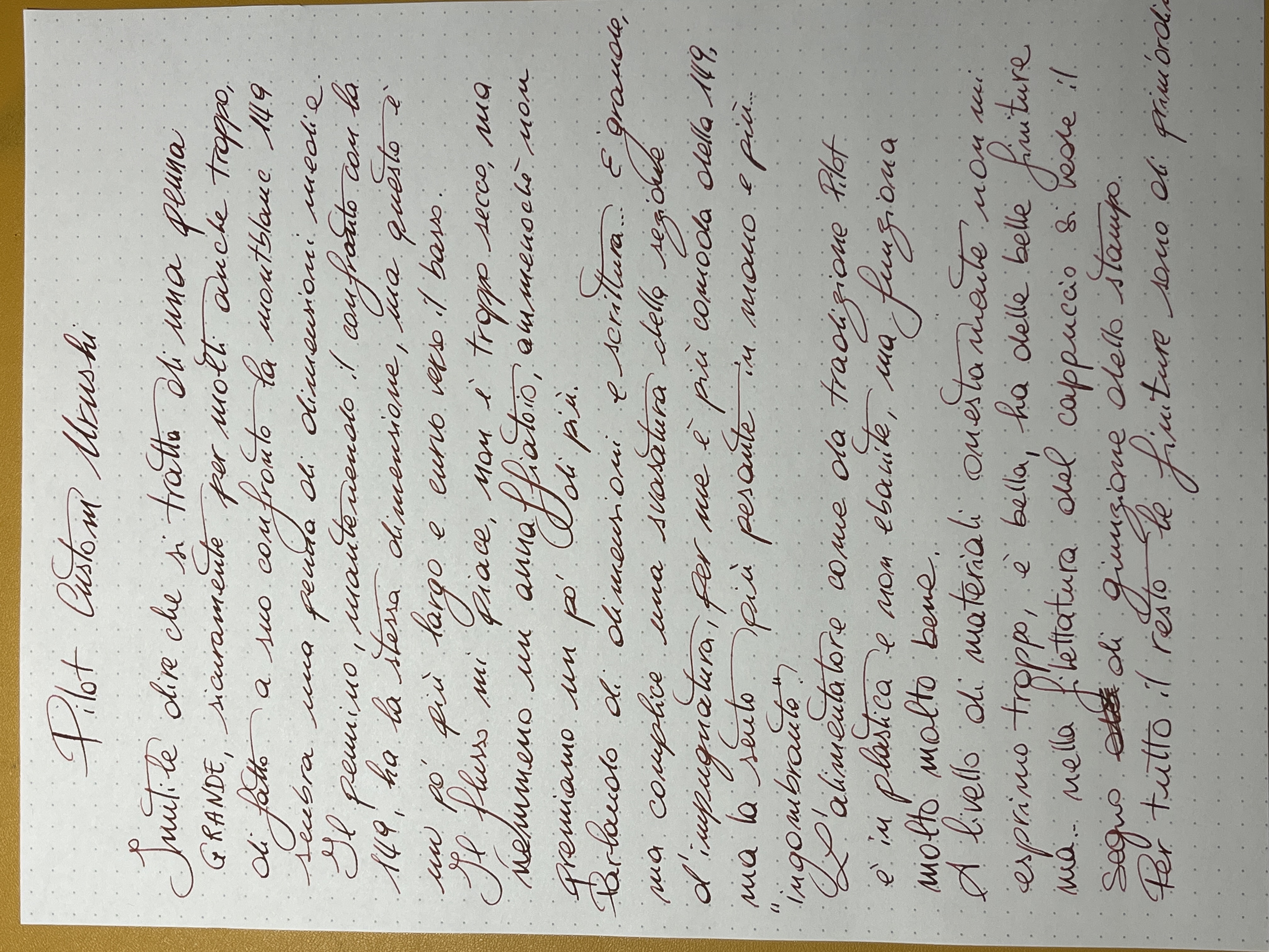 Questa è la mia prova scritta della mia custom urushi con pennino M, cel’ho da un mesetto ormai, e ha di fatto monopolizzato le mia attenzioni, secondo me una penna da provare e, se le dimensioni (di mani per usarla, e portafogli per acquistarla) lo permettono, da avere.