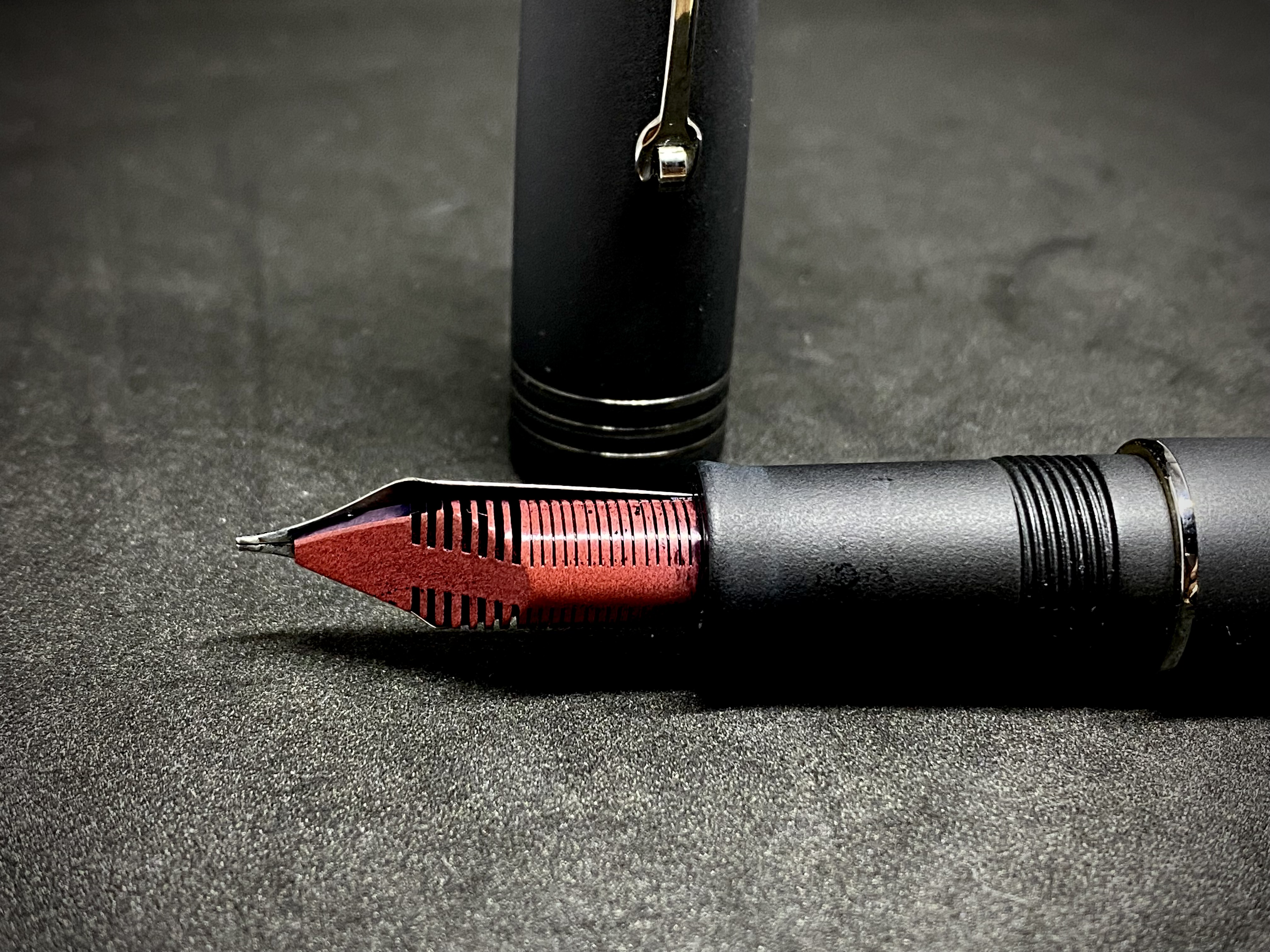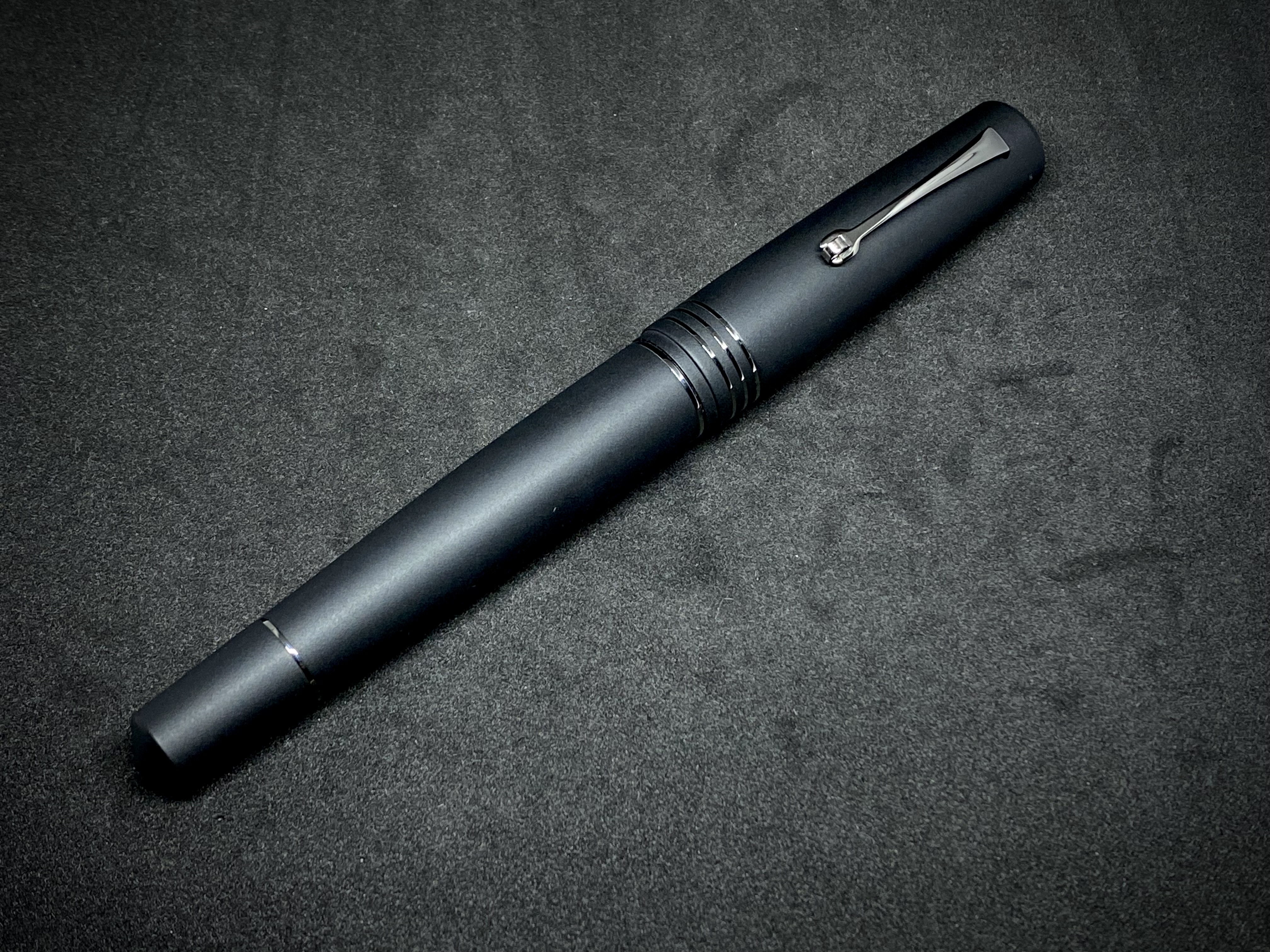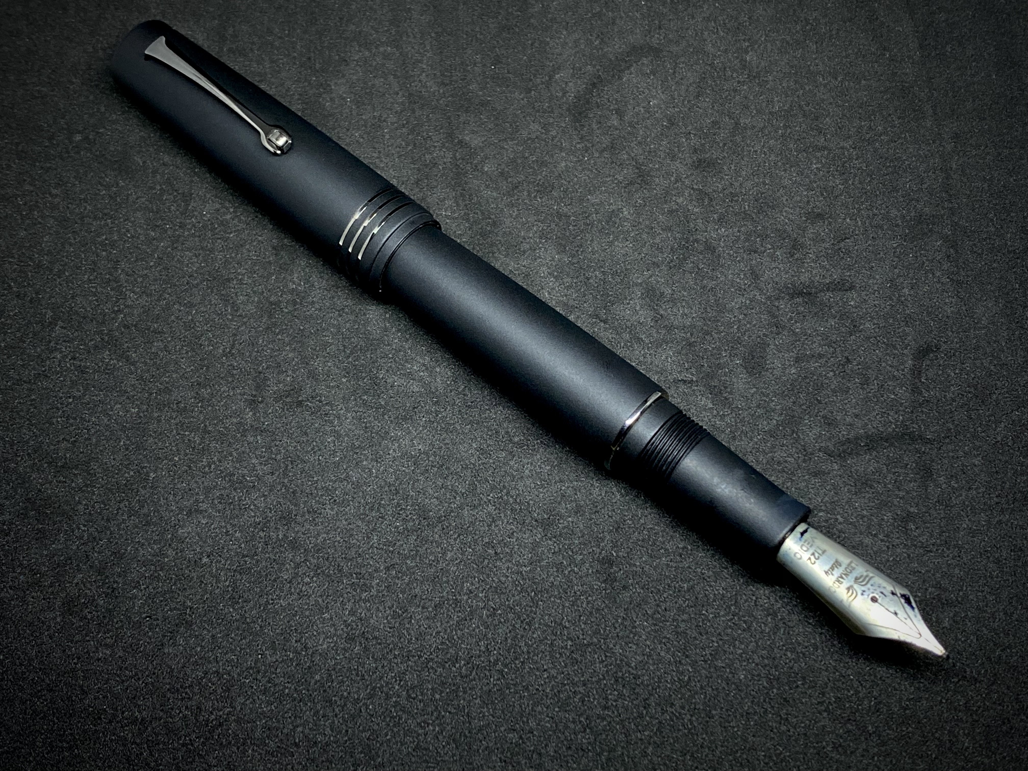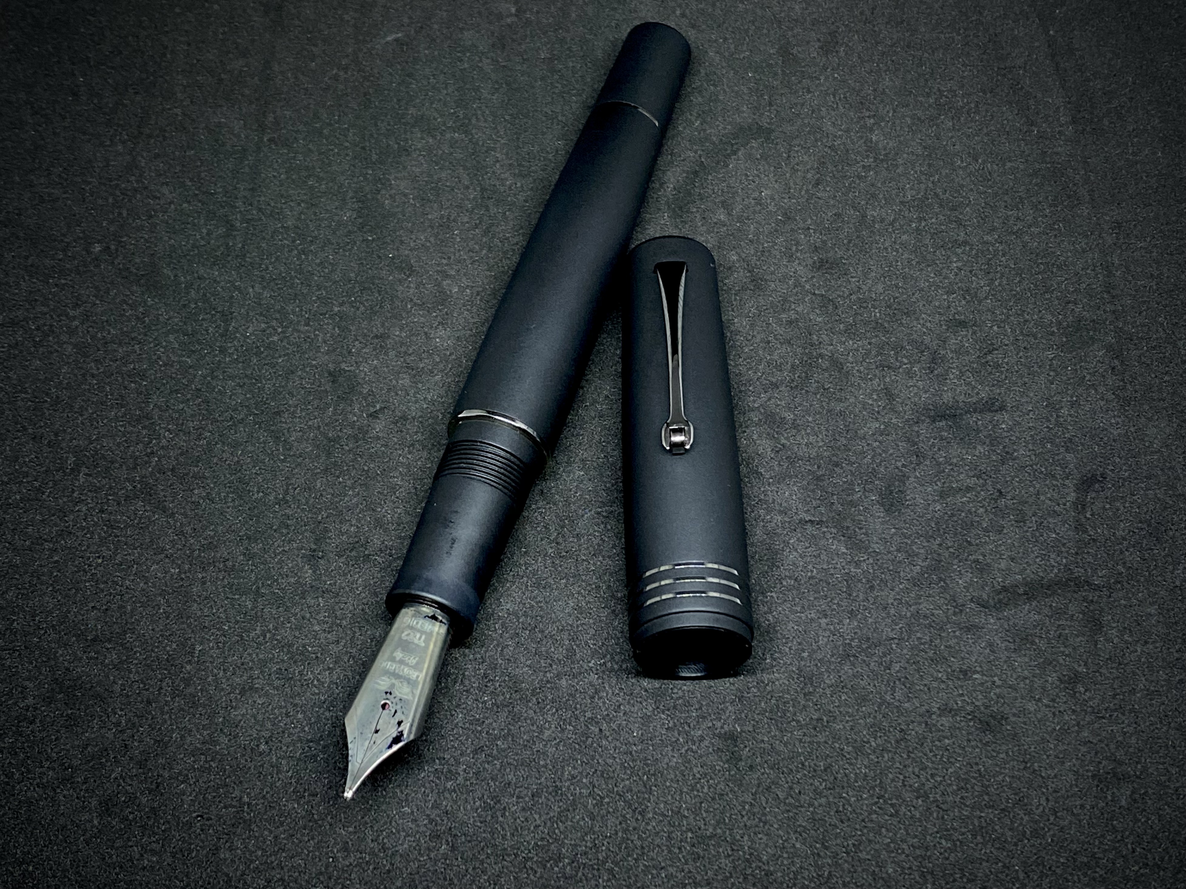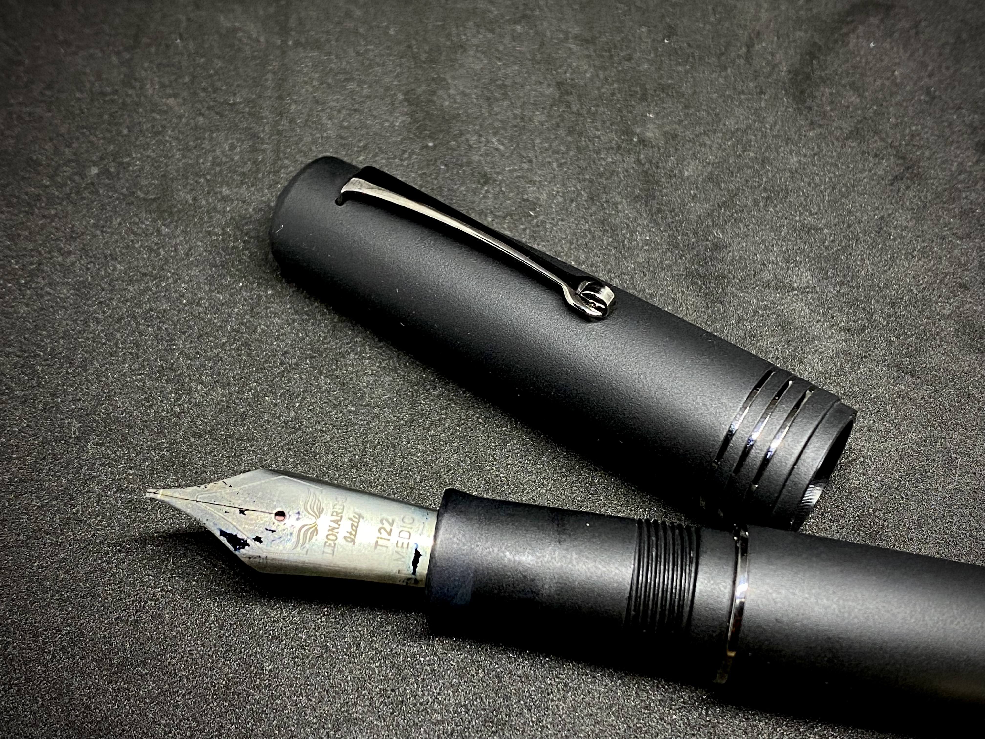 Quella che vi presento è un esemplare unico, realizzata in resina nera opaca con finiture ruteniate e che monta un pennino in titanio #8, recente introduzione di Leonardo, ad oggi solo nella sua offerta delle special editions.