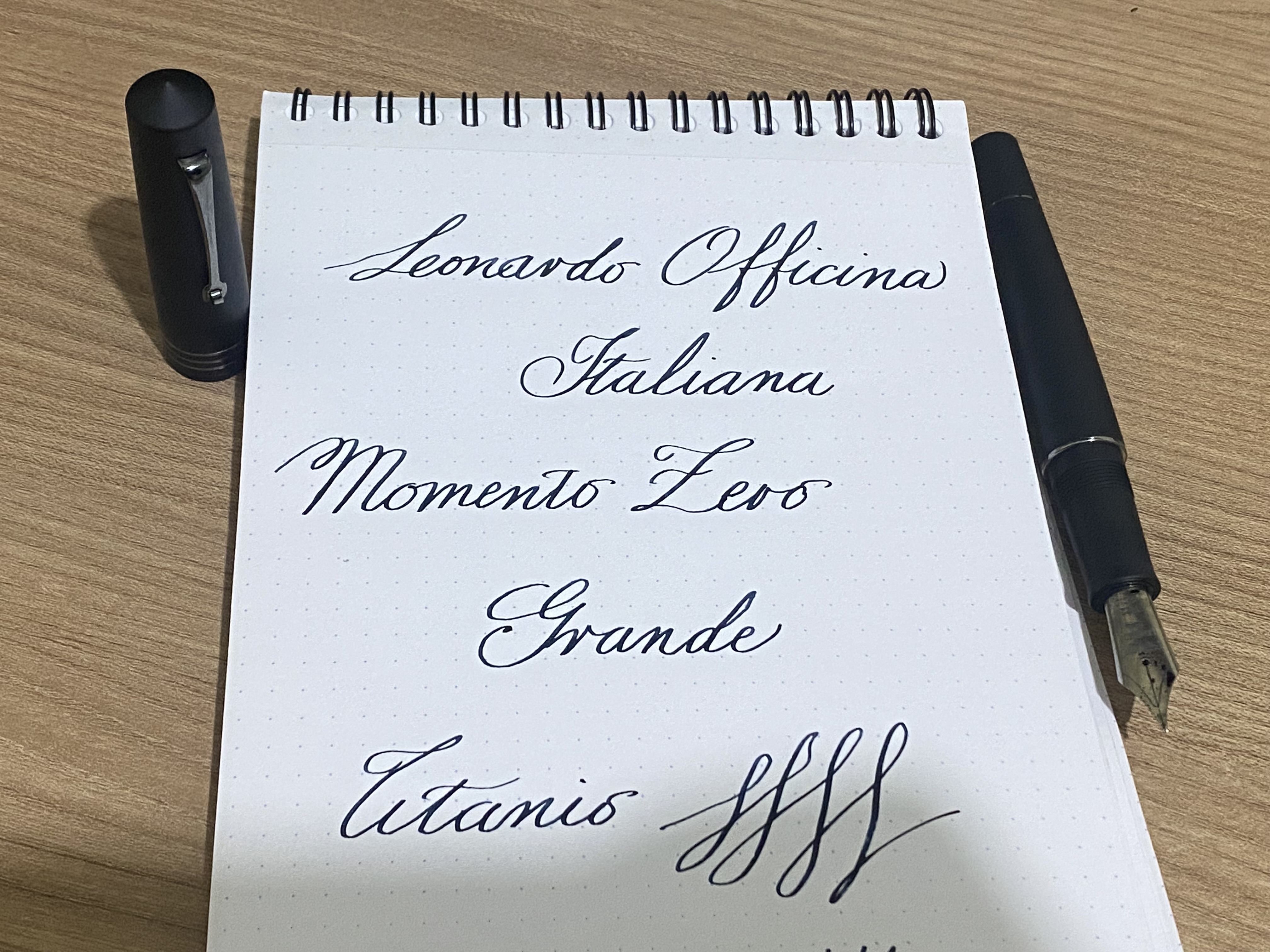 Un tedesco di razza perché non perde un colpo, è affidabile, preciso e pronto a scrivere anche se lasciamo la penna sul tavolo aperta per cinque minuti, ha un feedback perfetto, si sente quel tanto che serve a sentirlo scorrere sulla carta ma non infastidisce. Napoletano perché è morbido, un po truffaldino in quanto ci fa credere di essere un pennino flessibile ma non lo è, ed è generoso e pronto a dare gioia e vita anche agli inchiostri più noiosi. Il taglio CSI realizzato da Leonardo oramai non ha nulla da invidiare ai più blasonati nibmeister coi nomi orientali, sembra avere un suo sweet spot ma scrive sempre e comunque, lo si sente solo meno piacevole quando non siamo nella sua posizione preferita, tuttavia quasi guida la mano a metterlo sul binario suo in modo da dare il meglio di se. La variazione di tratto non è impressionante essendo su base M, reputo che se realizzato su base B (o Largo come da incisione Leonardo) possa offrire qualcosa di più.