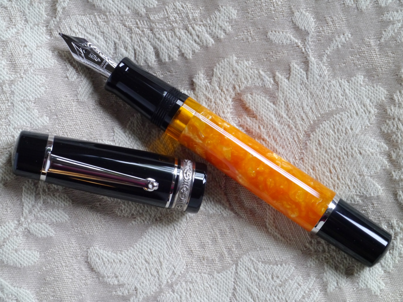 Ti consiglio la Dolcevita pistone o stantuffo, che dir si voglia (in realtà un converter 'affogato' di ottima costruzione), corpo arancione, fondello e cappuccio neri, finiture rodiate. Auguri per la ricerca.