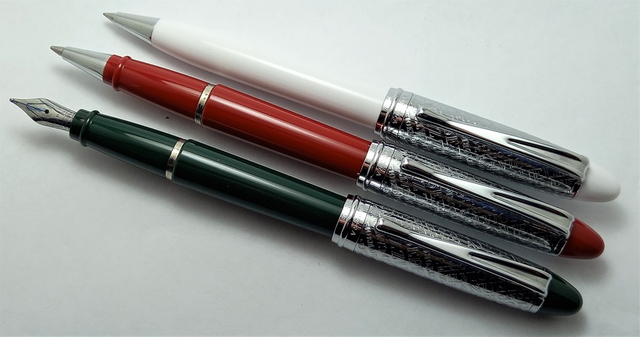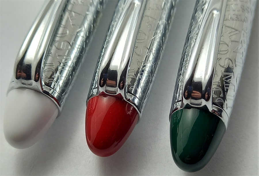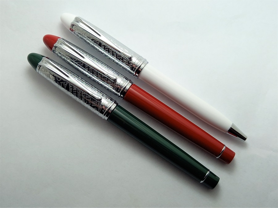I fusti degli strumenti di scrittura hanno i colori nazionali italiani, mentre i nomi dei padri fondatori dell'Italia sono incisi su ciascuno dei cappucci cromati.