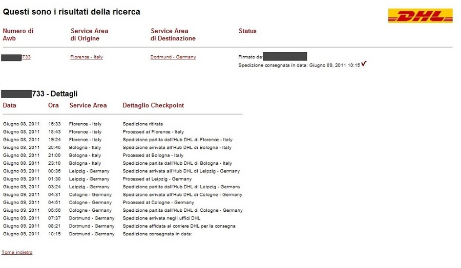 Dopo che il pacco è stato consegnato allo spedizioniere DHL a Firenze, ci sono volute solo 17 ore e 42 minuti prima che Monika e io potessimo tenerlo tra le mani qui a Dortmund.