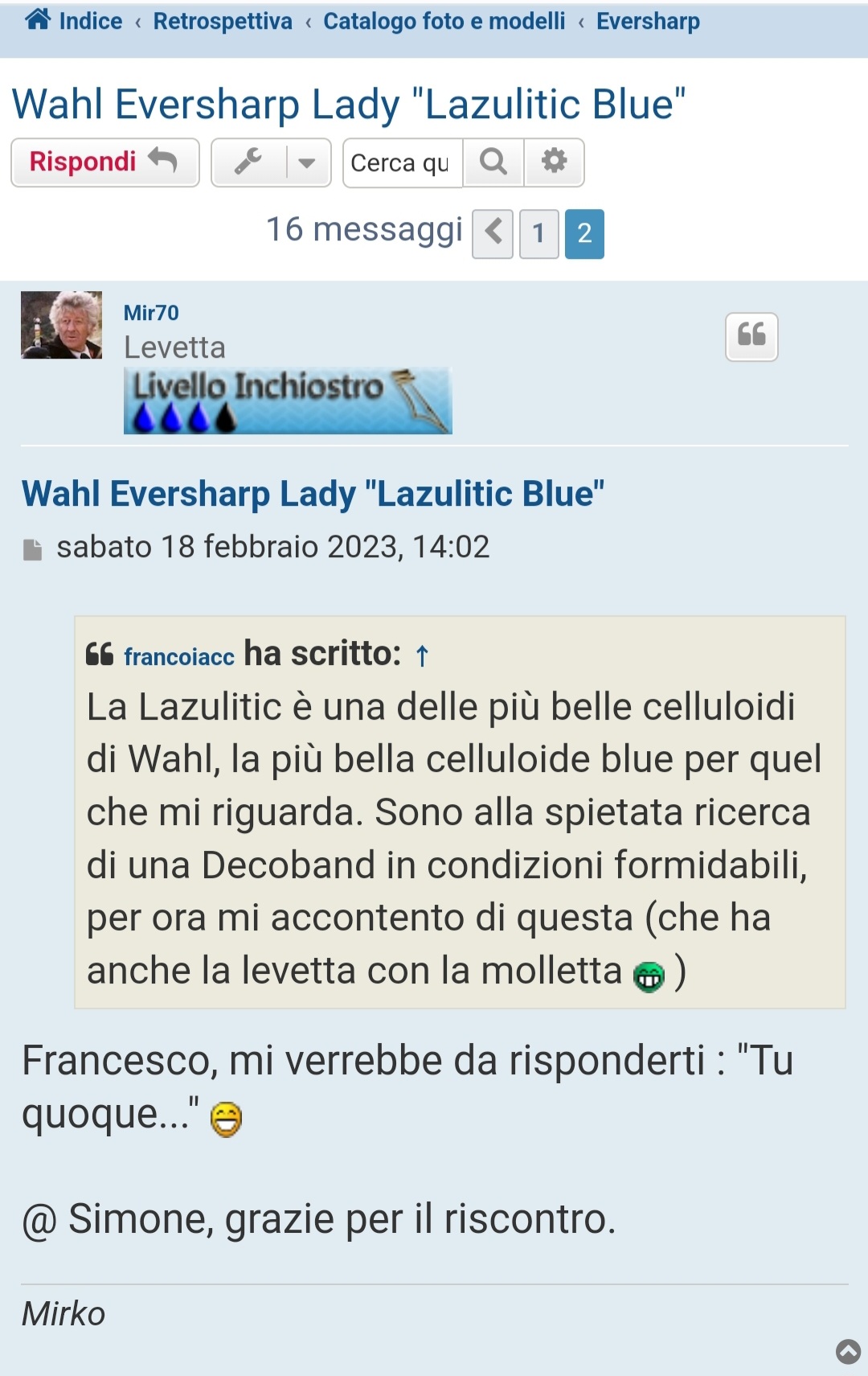 francoiacc ha scritto: martedì 28 febbraio 2023, 9:13 Caro Giorgio, nel ringraziarti per aver mostrato il mio oggetto del desiderio ti faccio presente che sei stato particolarmente cattivo... ora mi aspettano notti insonni fin quando riuscirò quantomeno a trovare la stilografica Lazulitic Blue in condizioni più che decorose (peraltro 50 anni non ce li ho!)...
