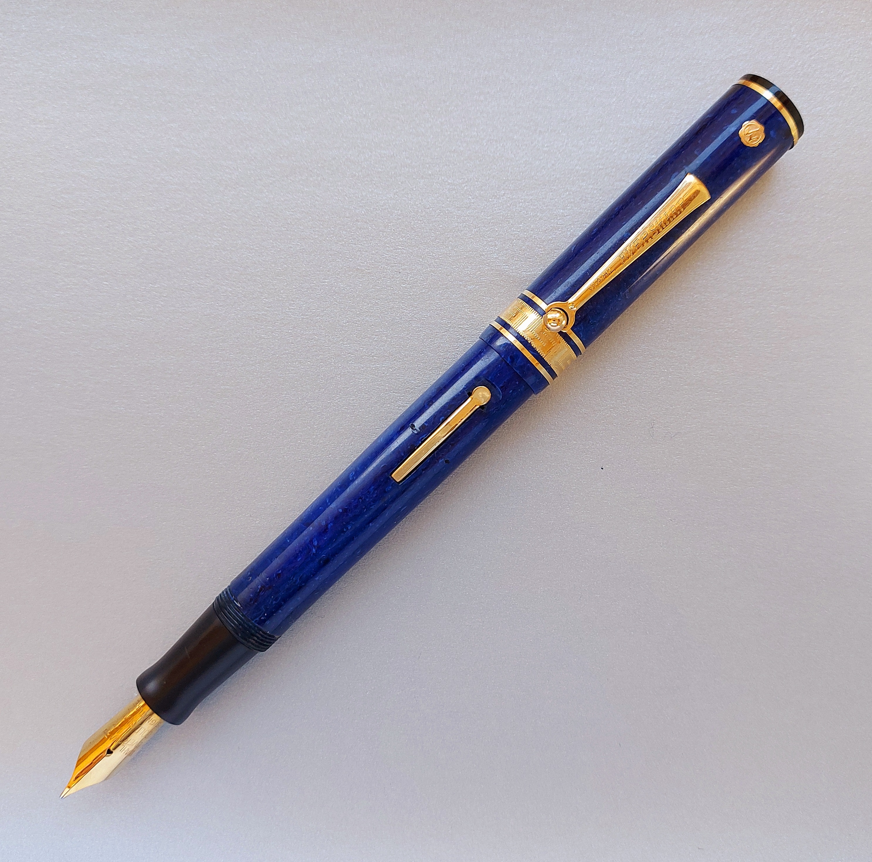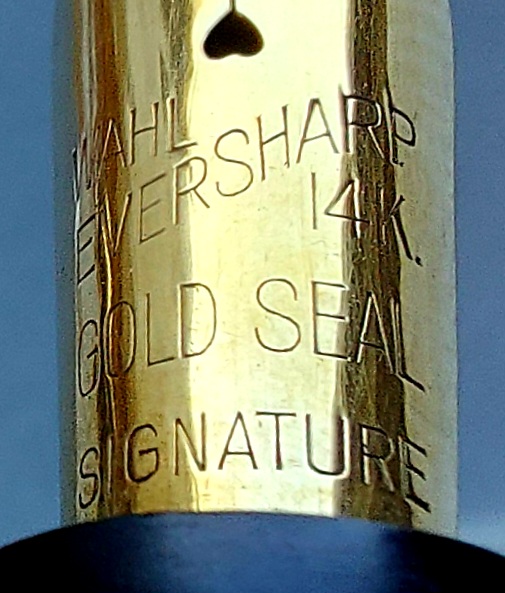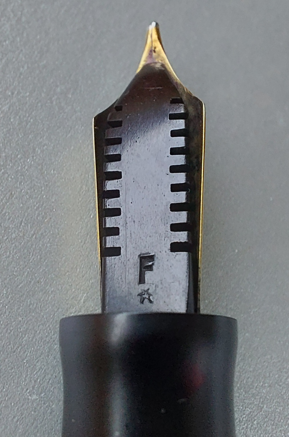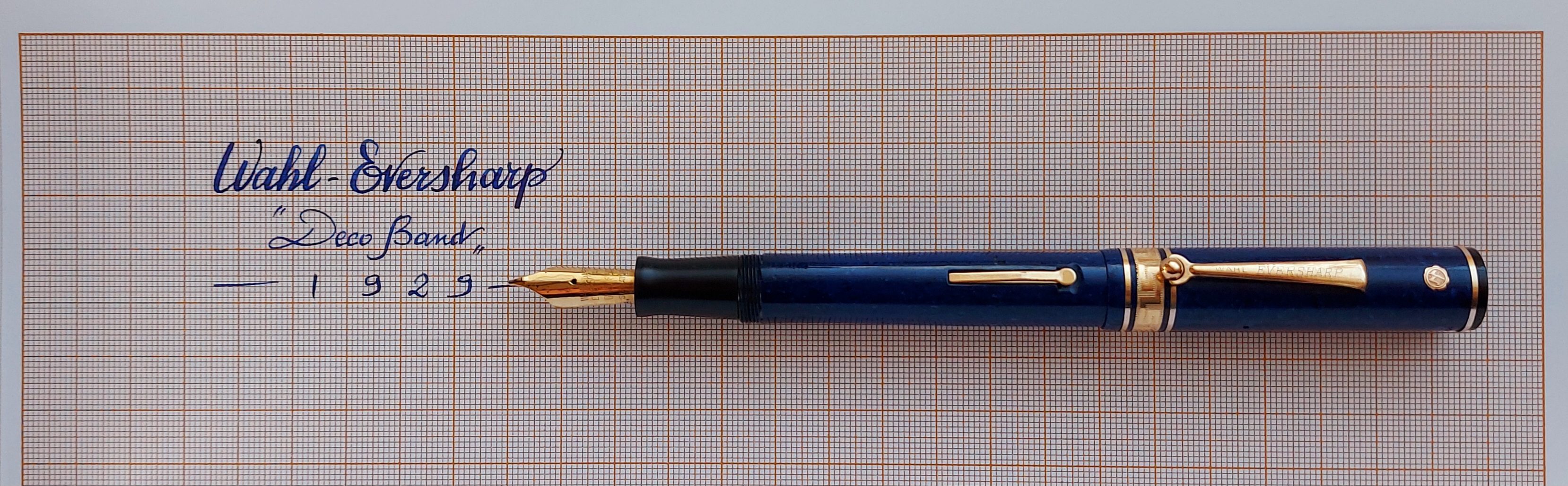 Non avrei aperto un argomento ad hoc per recensire una penna che comunque avevo già mostrato diverse volte (anche per presentare delle pubblicità)… Inoltre, questo modello (che i collezionisti hanno battezzato “Deco Band” in assenza di una denominazione commerciale specifica del Produttore) è stato commentato ovunque, da decenni, ad abundantiam: il nostro formidabile Wiki già riporta una completa introduzione alla linea, incardinata nella presentazione della Marca, ad opera di Simone Piccardi :clap: (https://www.fountainpen.it/Gold_Seal_Personal_Point), e sul Forum diverse “Deco Band” in altre colorazioni sono state documentate (ancora di recente Francesco ha commentato approfonditamente due esemplari notevoli :thumbup: : viewtopic.php?t=28960 e viewtopic.php?t=29114), mentre in rete si possono reperire le trattazioni dei massimi esperti internazionali, oltre ad interessanti discussioni tra appassionati sui maggiori forum americani…