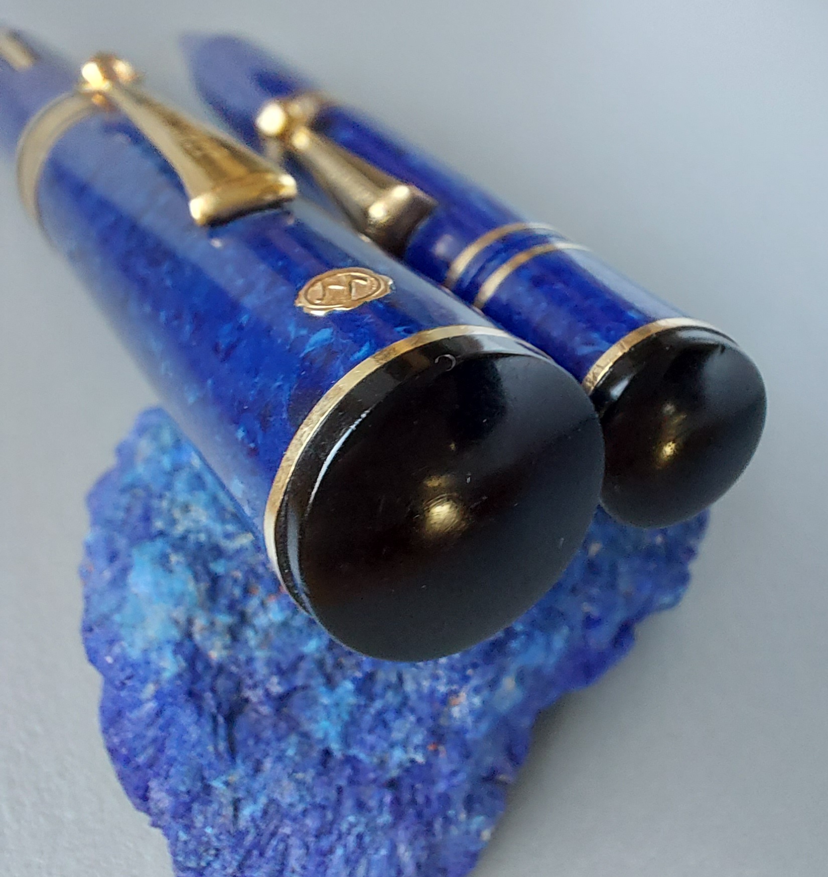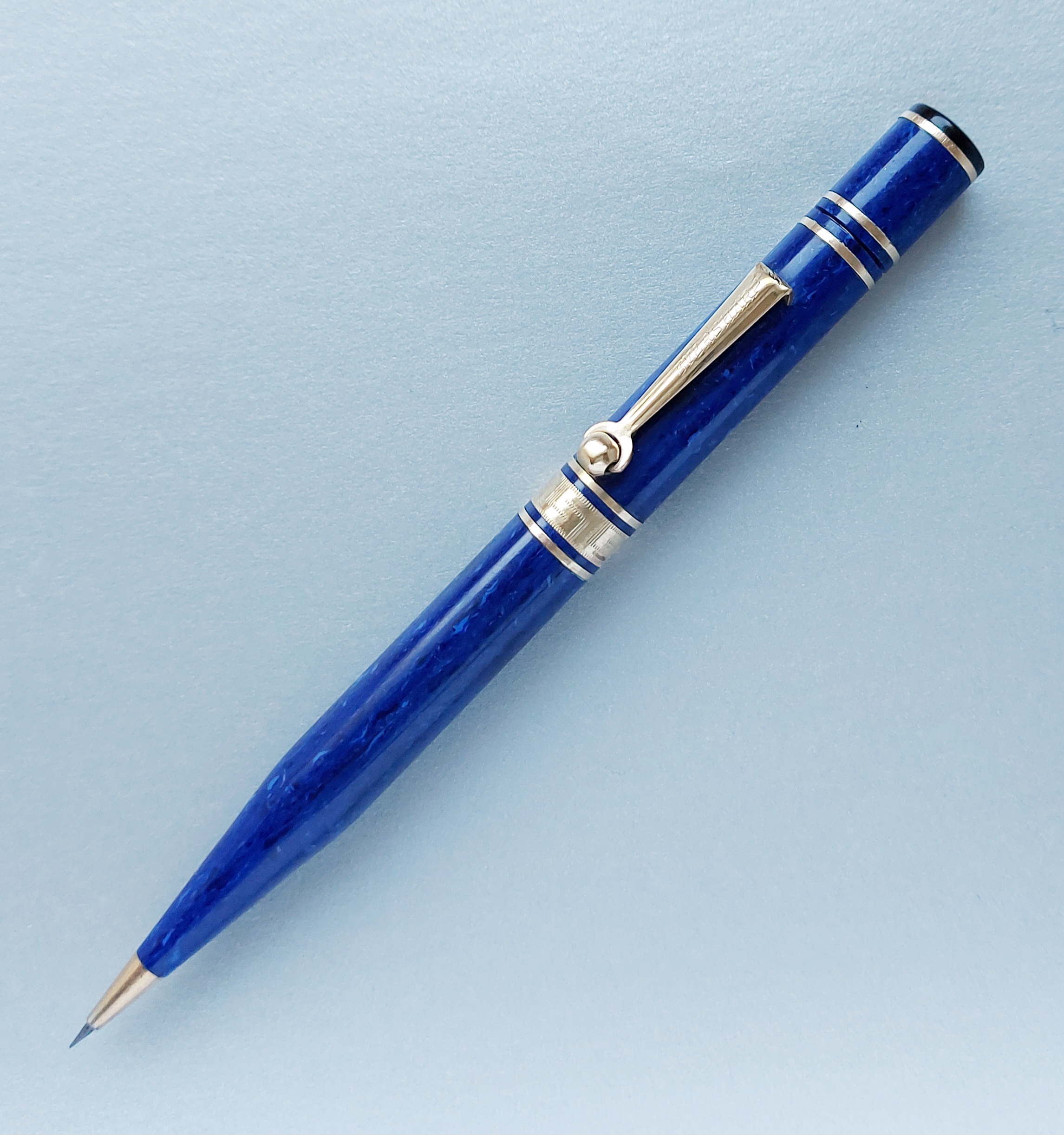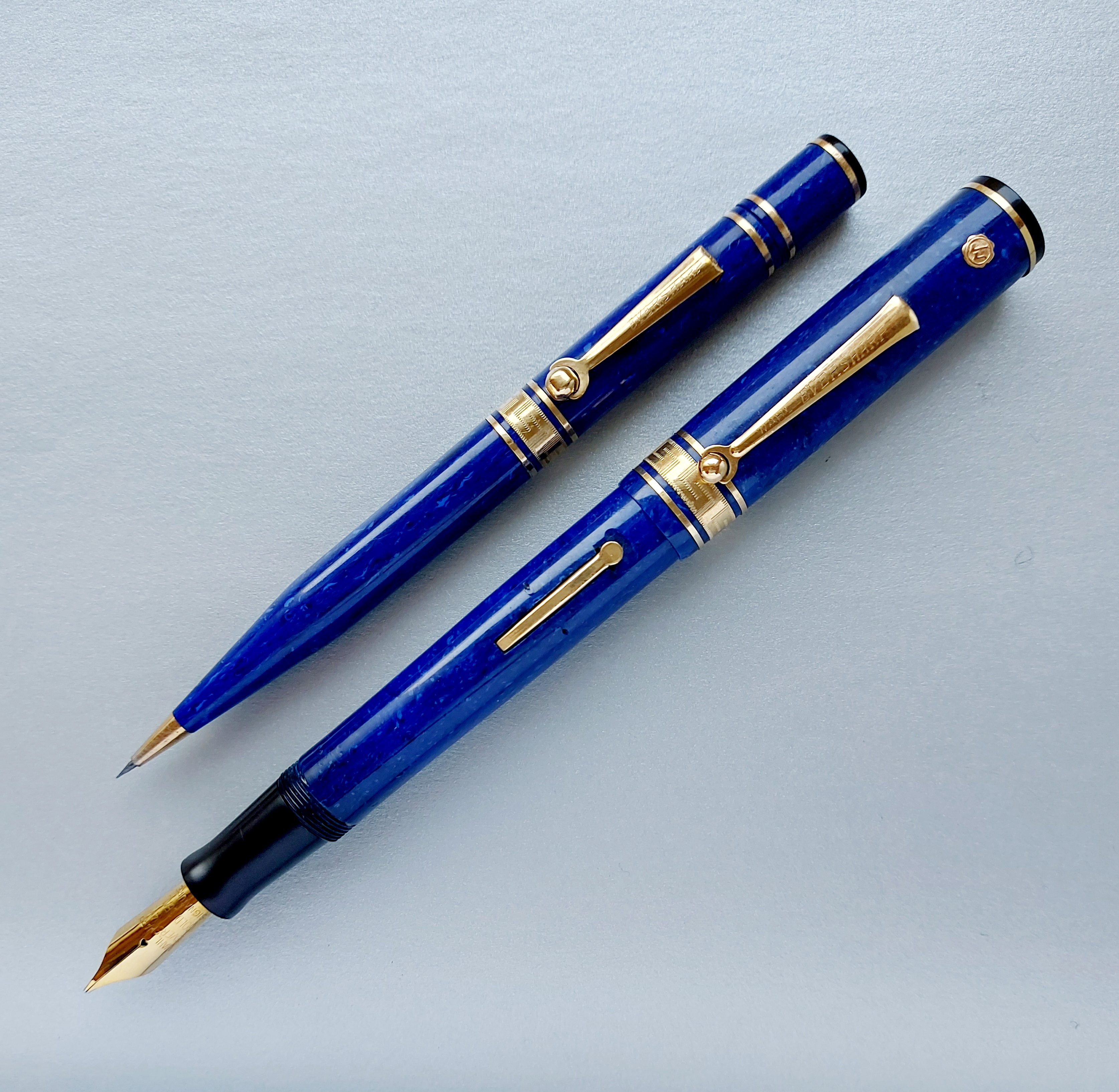WAHL-EVERSHARP PERSONAL POINT “DECO BAND” COMBINATION SET nel colore LAZULITIC BLUE [Fountain pen No. 8611C ⎯ Pencil No. 4211C] IN BOX, in celluloide tornita dal pieno, con estremità in celluloide nera, parti metalliche a vista laminate oro; la stilografica con cappuccio a vite, pennino Wahl-Eversharp in oro 14 carati, caricamento a levetta; la matita meccanica con funzione “propel” impiega mine da 1.1 mm. Produzione U.S.A., anno 1928-1929.