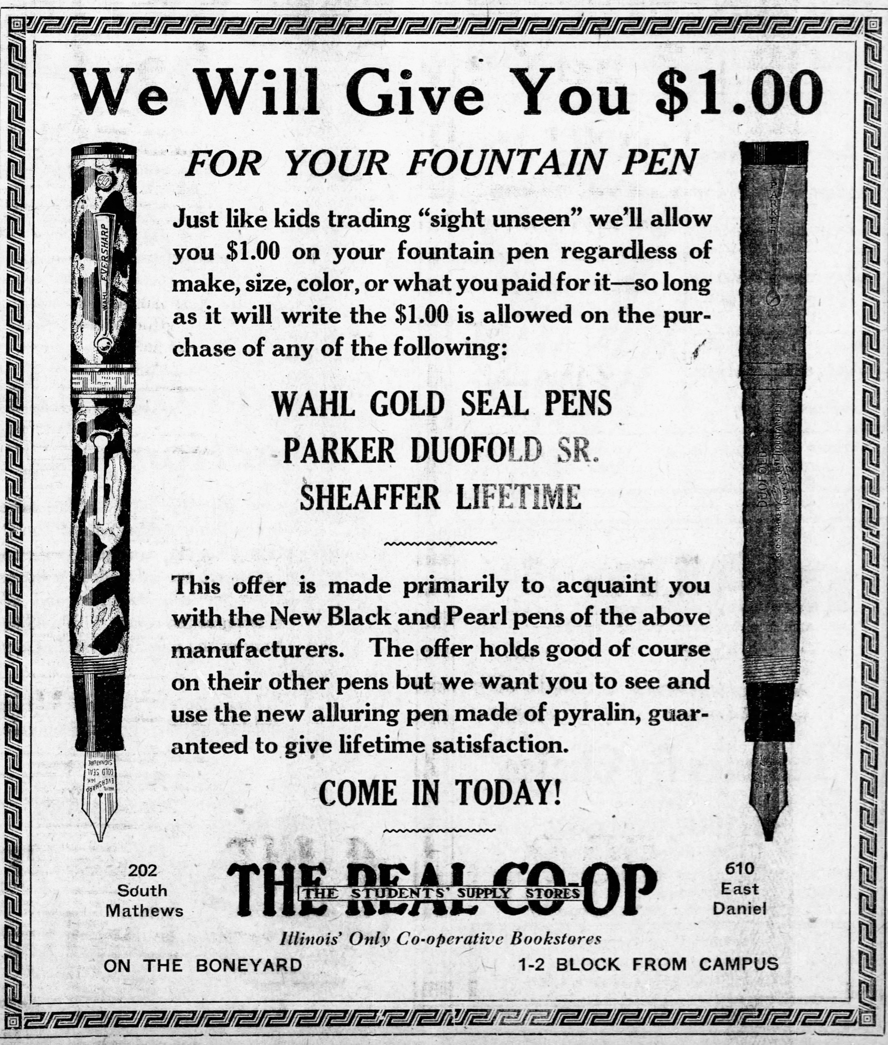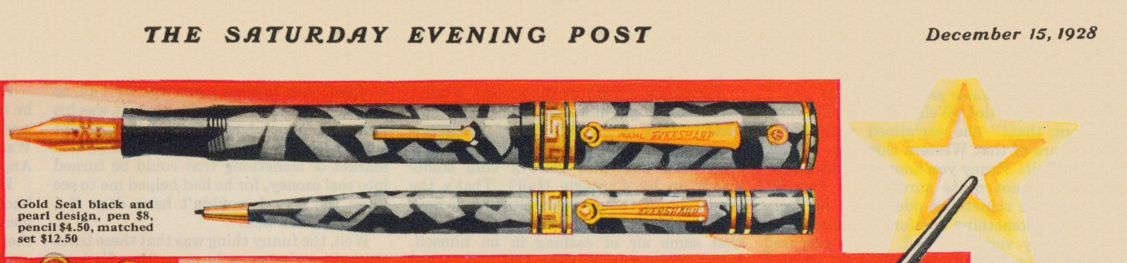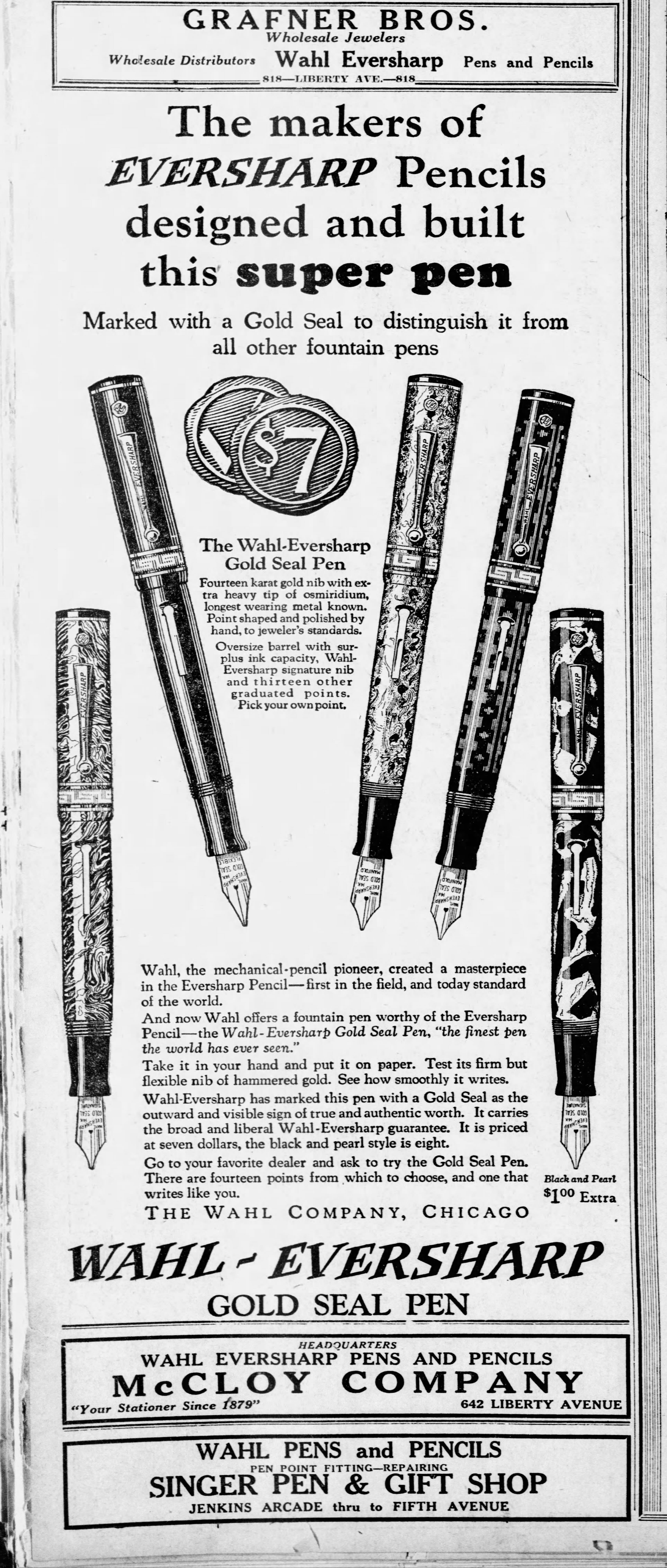 La primissima notizia del modello che ho potuto rinvenire è del settembre 1928, su un quotidiano della città universitaria di Champaign-Urbana, nelle vicinanze del “quartier generale” della Wahl Co. a Chicago, in una probabile vendita/test promozionale, dove la nuova “Gold Seal Pen” si trova al fianco della Parker De Luxe e della Sheaffer Lifetime, tutte nella allora molto desiderabile colorazione Black&Pearl.
