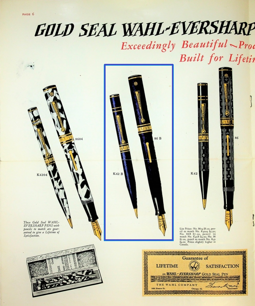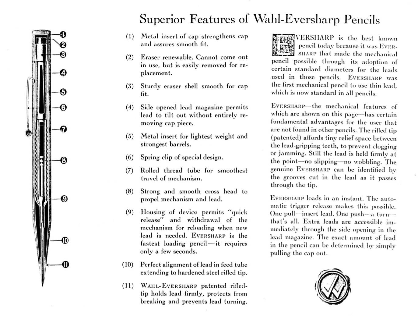Dunque, almeno all’inizio della produzione nel 1928 (presumibilmente per non sprecare l’opportunità di utilizzare costose clip già bell’e fatte) la Casa mise in vendita sia penne che matite che riportavano sui fermagli i due nomi “disgiunti”, ossia con stampigliatura solo “WAHL PEN” per la stilografica e solo “EVERSHARP” per la matita.