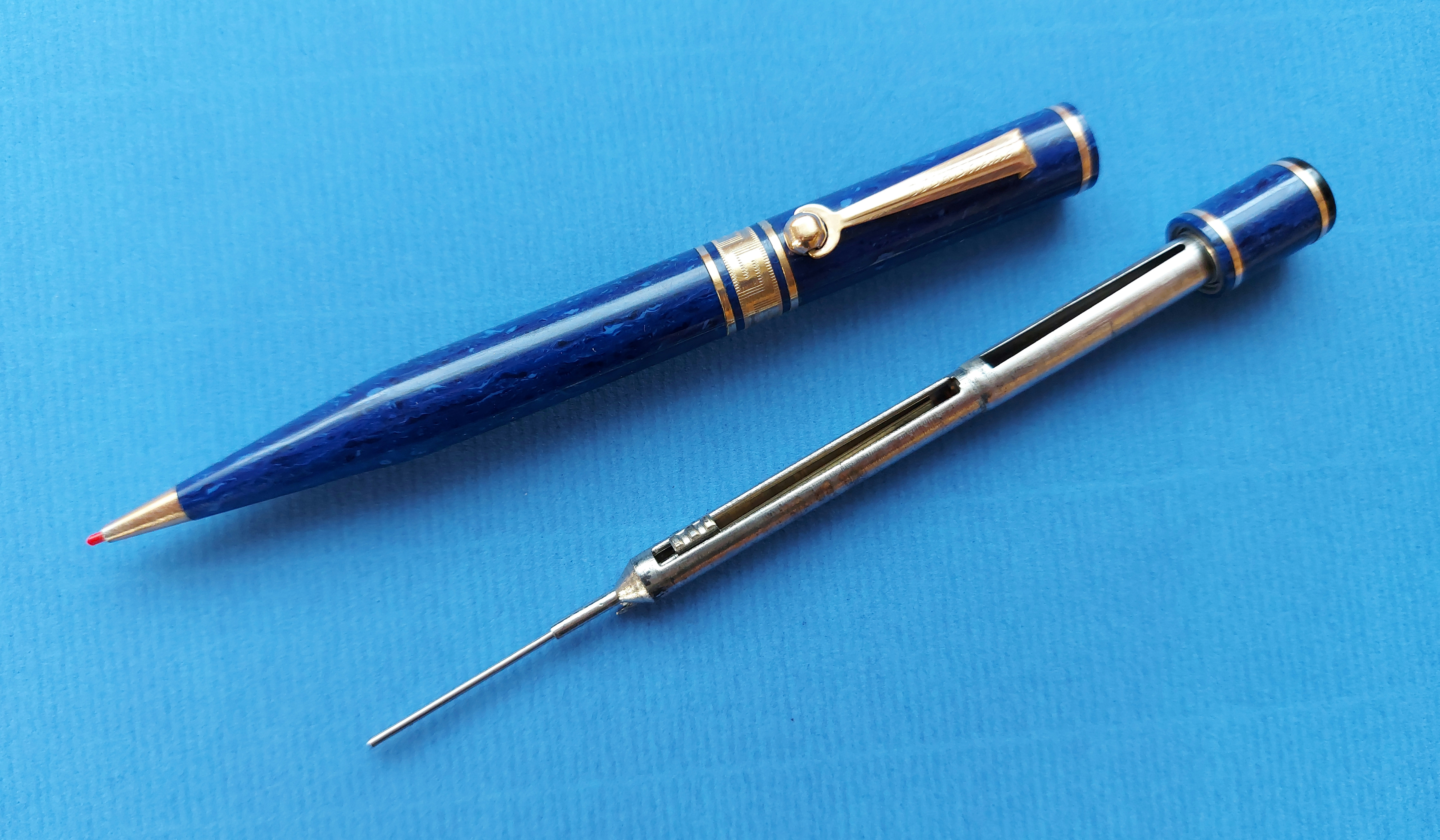 Tutto ciò premesso, l’occasione mi è sembrata assolutamente propizia per mostrarvi, insieme ad una stilografica ammirata e desiderata, anche la matita meccanica coordinata (decisamente “poco comune”), entrambe custodite nella scatolina più bella ed originale tra quelle dedicate al set completo (questa sì davvero “rara”), nei pochissimi anni di produzione del modello. Ci ho messo quasi un lustro a completare questo SET, pezzo dopo pezzo. Nell’ordine: stilografica, matita, scatolina.