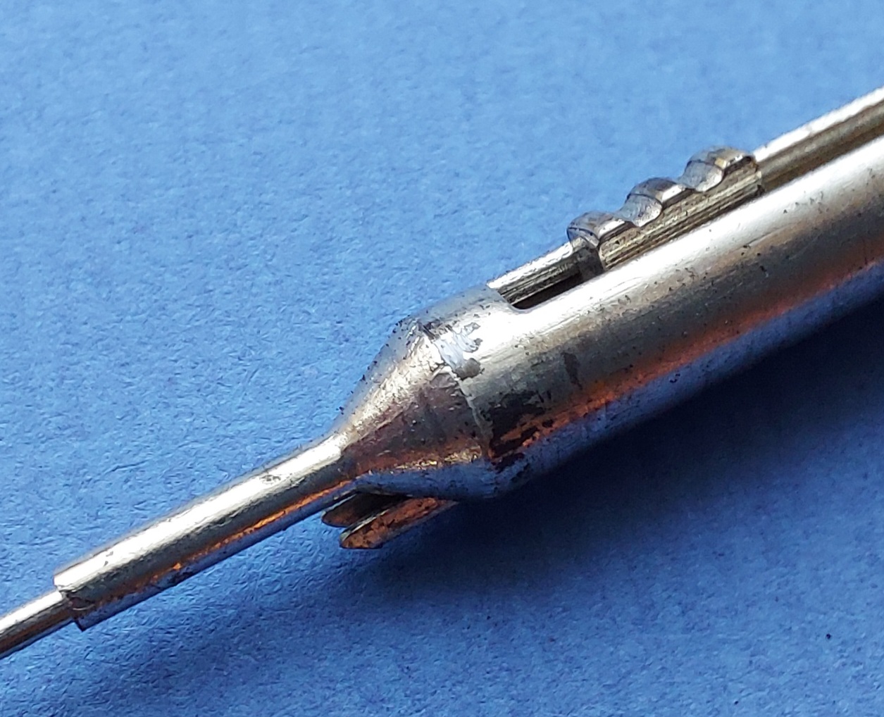 La lunghezza del fermaglio nella mia stilografica è di 3,5 cm mentre nella matita è di 3 cm: nei cataloghi e nelle pubblicità la lunghezza della clip della matita rispetto a quella della penna è…molto variabile, e la larghezza non apprezzabile correttamente: in ogni caso, direi che vi fu una tendenza a restringere ed allungare tutta la sezione triangolare discendente nel passaggio dal vecchio al nuovo fermaglio col doppio nome. Ma è senza dubbio la “rotellina” (roller clip) che mostra una differenza (piccola eppure) sostanziale: infatti, la “rotellina” della clip sulla matita meccanica (ereditata dalla linea deluxe precedente) è ancora (massicciamente) “cilindrica”, per divenire invece perfettamente “sferica”, oltre che di dimensioni minori, sulla stilografica (e si riducono in proporzione anche le dimensioni della “mezzaluna” che contiene la rotellina stessa), in un processo di snellimento che rese nel giro di pochi mesi il design più filante su tutte le clip marchiate WAHL EVERSHARP.