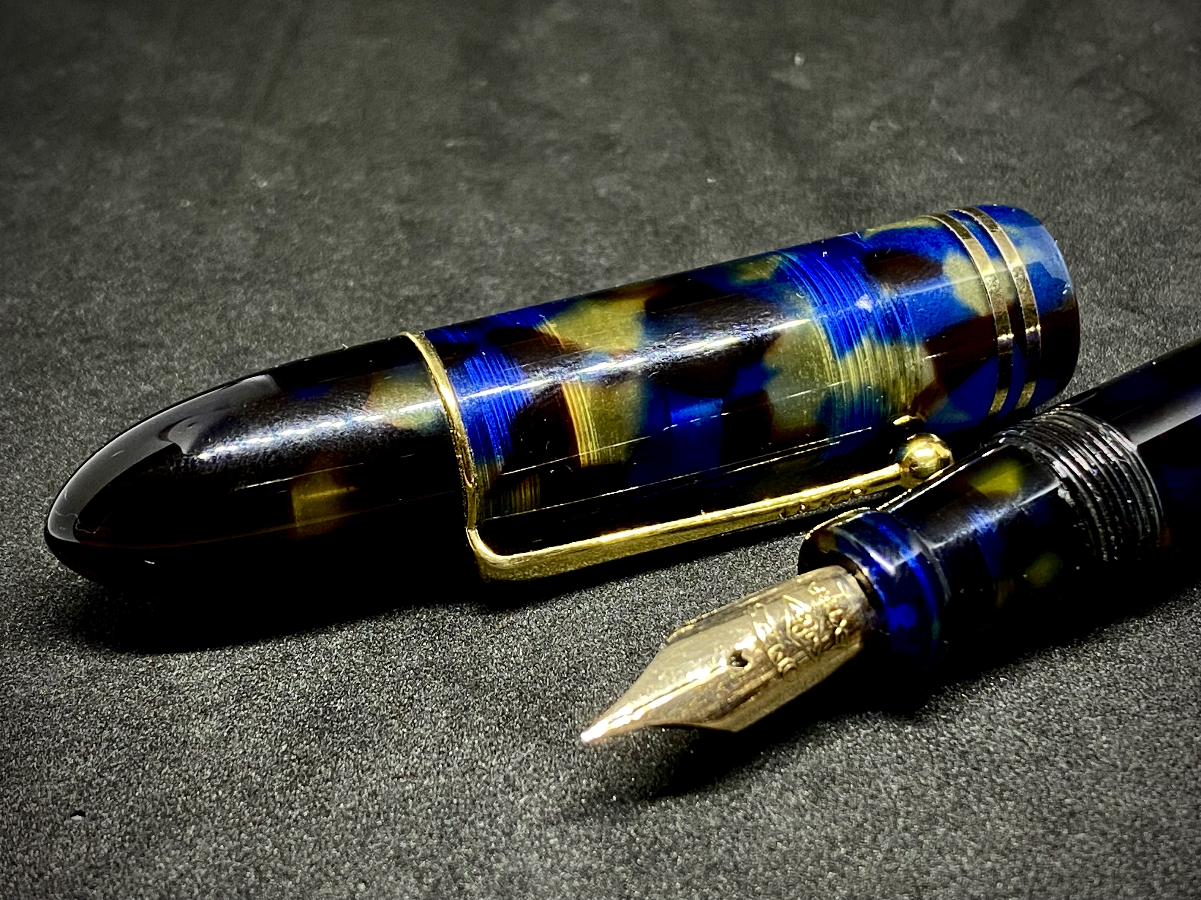 La penna è in acetato di cellulosa, un materiale di quelli che secondo me o si amano o si odiano per la sua particolare colorazione. Io ovviamente l’ho amato subito, il cosiddetto colpo di fulmine; è un materiale che mi ricorda le celluloidi Extra Lucens di Omas, un materiale che presenta delle semi-trasparenze che vanno dal blu all’ambra con una predominanza di blue. La profondità di questa celluloide moderna è impressionante, si vedono le diverse tonalità di colore galleggiare, una sopra l’altra. A prima vista da’ quasi una sensazione di fragilità, ma una volta impugnata ci si rende conto di avere tra le dita una penna solida e di ottima fattura
