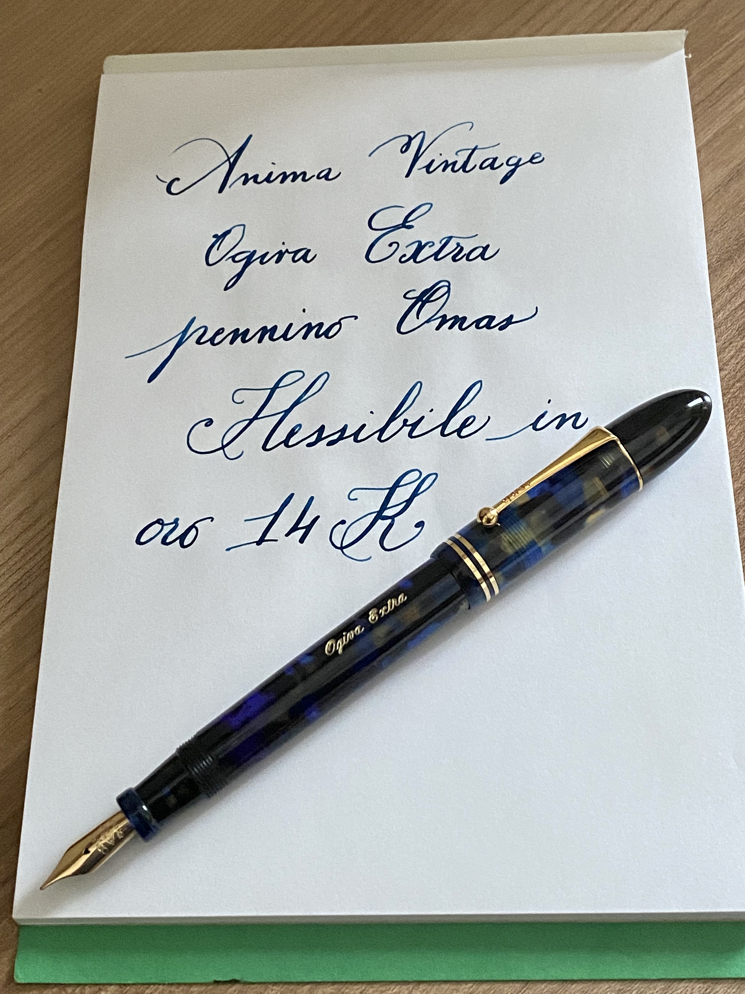 E così, galeotto fu l’ultimo pen show, organizzato durante uno dei raduni del Circolo, in cui abbiamo avuto il piacere di ospitare Letizia, mi sono lasciato irretire da una Ogiva Extra, una Anima Vintage ispirata alle vecchie Omas ma che fa l’occhiolino alle produzioni americane di inizio ‘900, ovviamente il pennino è proprio uno di quei pennini Omas anni ‘40 seriamente flessibile.