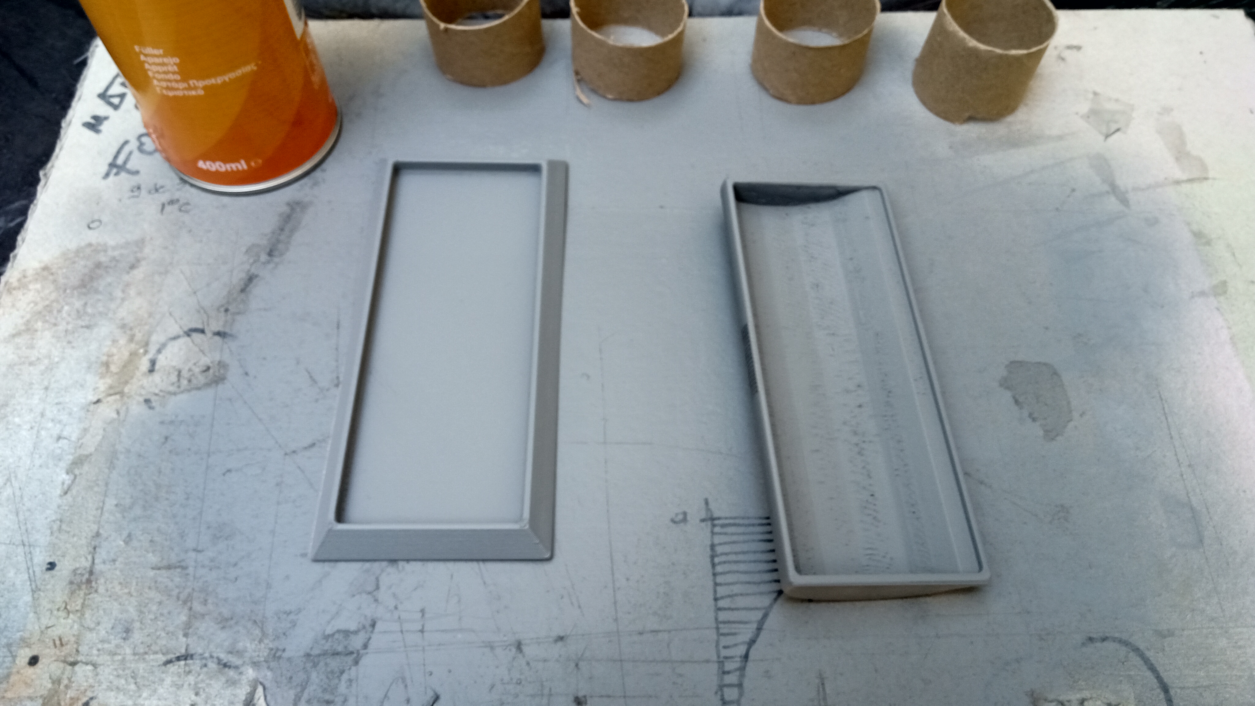 e allo stesso modo, dopo liscia carteggiatura, verrà verniciata di grigio metallizzato la base, alla quale sono stati precedentemente posizionati gli inserti per le cerniere...