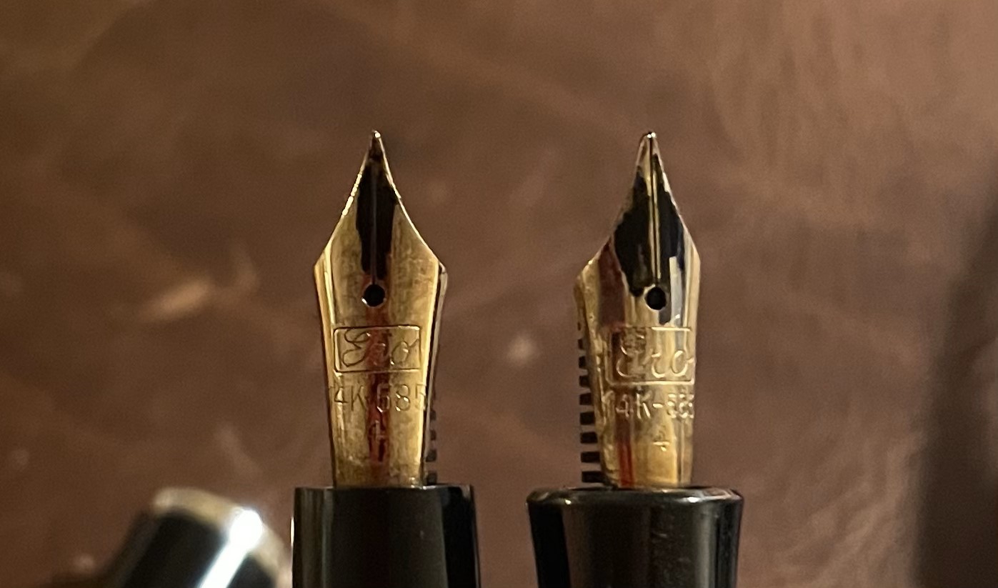 Infatti, manco a dirlo la penna scrive benone. Caricata con il Noodler's X-feather, il tratto è un F sicuro e certo, arriva a raddoppiarsi e oltre senza sforzo e con naturalezza, morbido scorrevole e... strano: molto flessuoso... Pare un poco alzarsi se premi, pare piegarsi non solo nella prima parte dei rebbi, ma fino alla metà del pennino. Da' una sensazione di "mollezza" a usarlo, come se la lega di oro e altri metalli fossero più morbidi, chissà. Lenta nel ritorno. Anche l'altra ERO si comporta in modo simile, ma poco più contenuta in questa cosa.