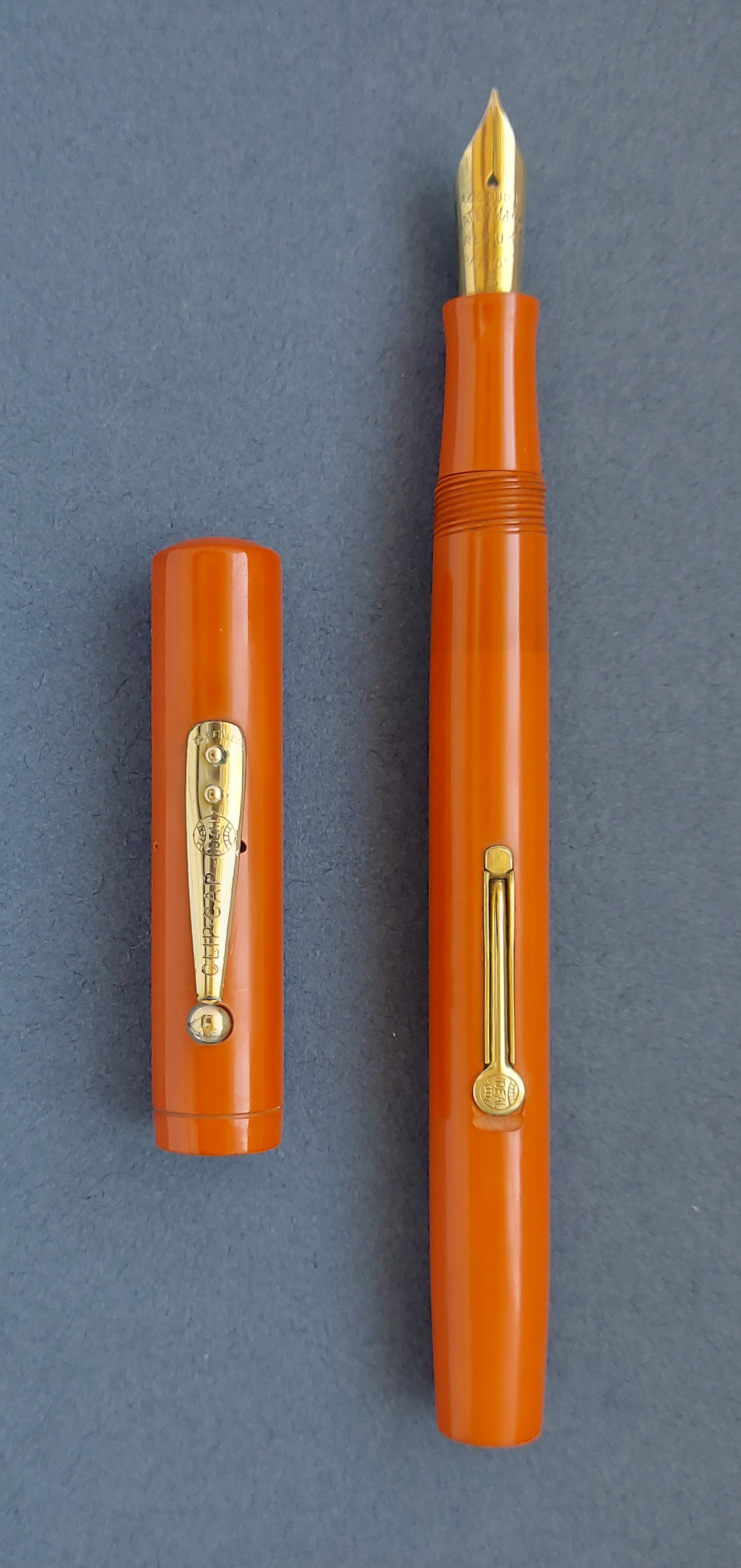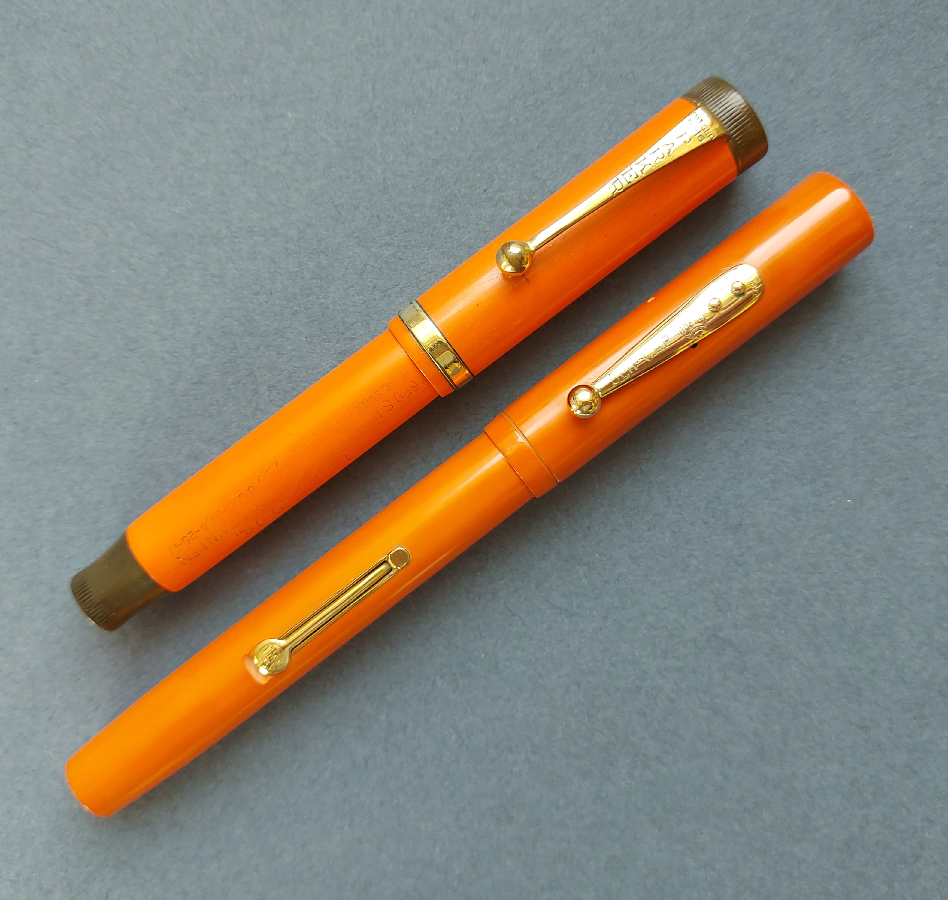 Nelle pubblicità Waterman’s si parla anche solo di colore “red” (che fosse ebanite era scontato, non essendo ancora giunto il tempo della celluloide che segnò nel giro di un lustro la fine della gomma vulcanizzata/hard rubber): in realtà, si tratta di un arancione!