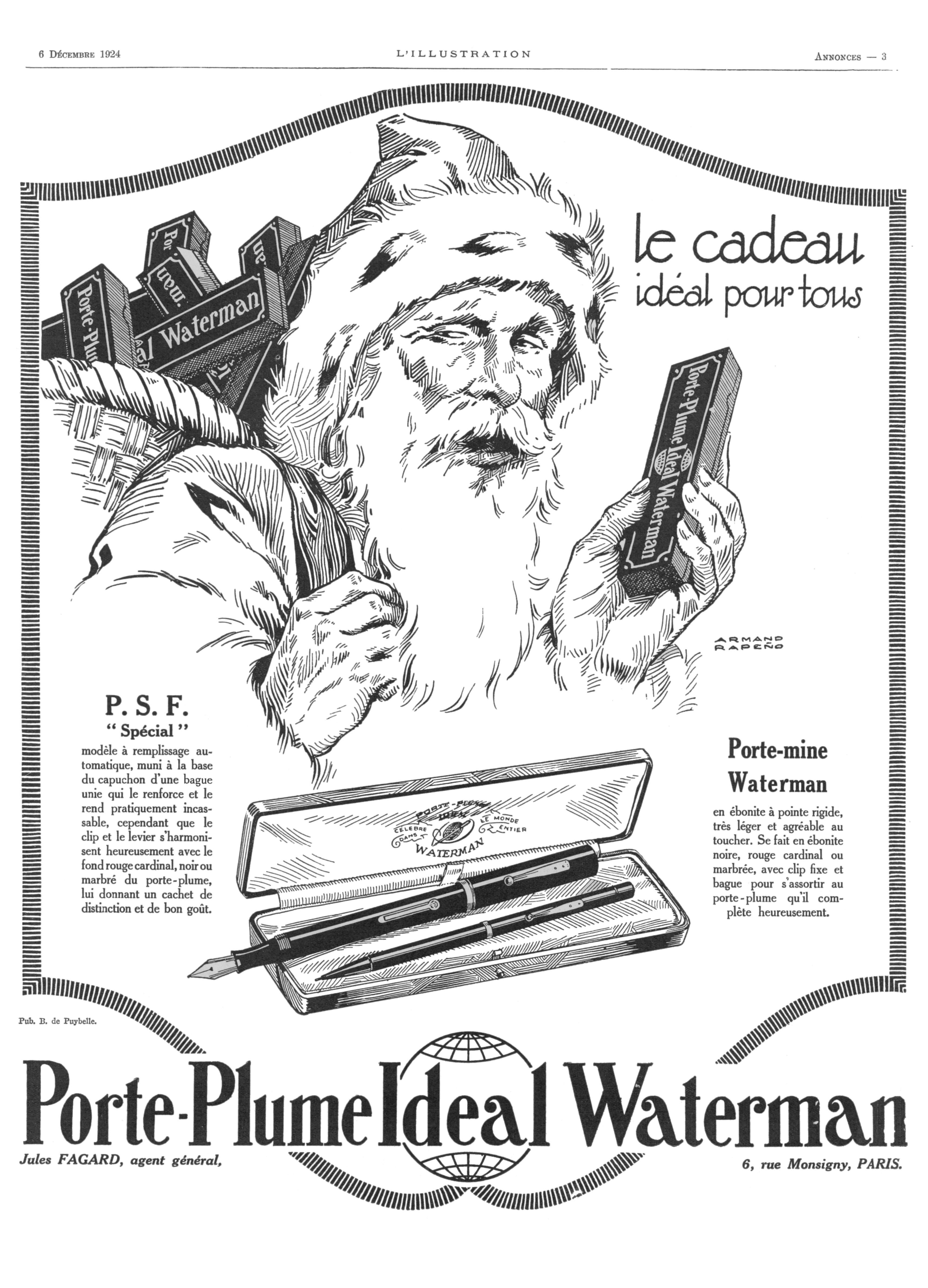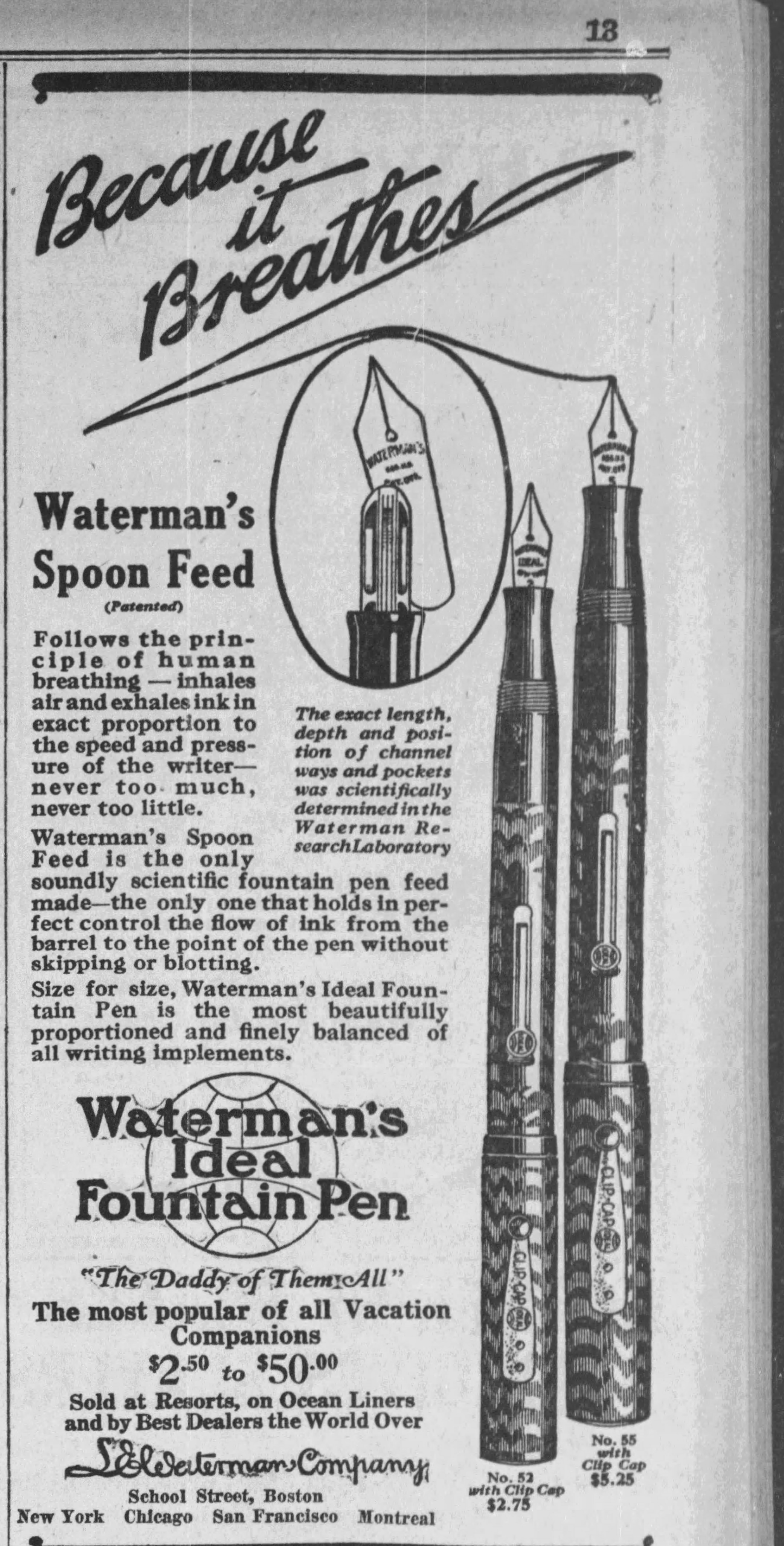In questa sede gioverà ricordare che il caricamento a levetta fu introdotto da Waterman all’inizio del 1915, divenendo subito il sistema di punta nelle vendite della Casa in quanto pubblicizzabile come modello “automatico”, e che la stilografica di taglia standard che lo montava fu dapprima denominata 12 P.S.F. (Pocket Self Filler), per divenire Waterman’s n° 52 solo dopo il 1917, con la nuova numerazione (in cui le cifre stavano ad indicare il sistema di caricamento a levetta <5> dotato di pennino <2>).