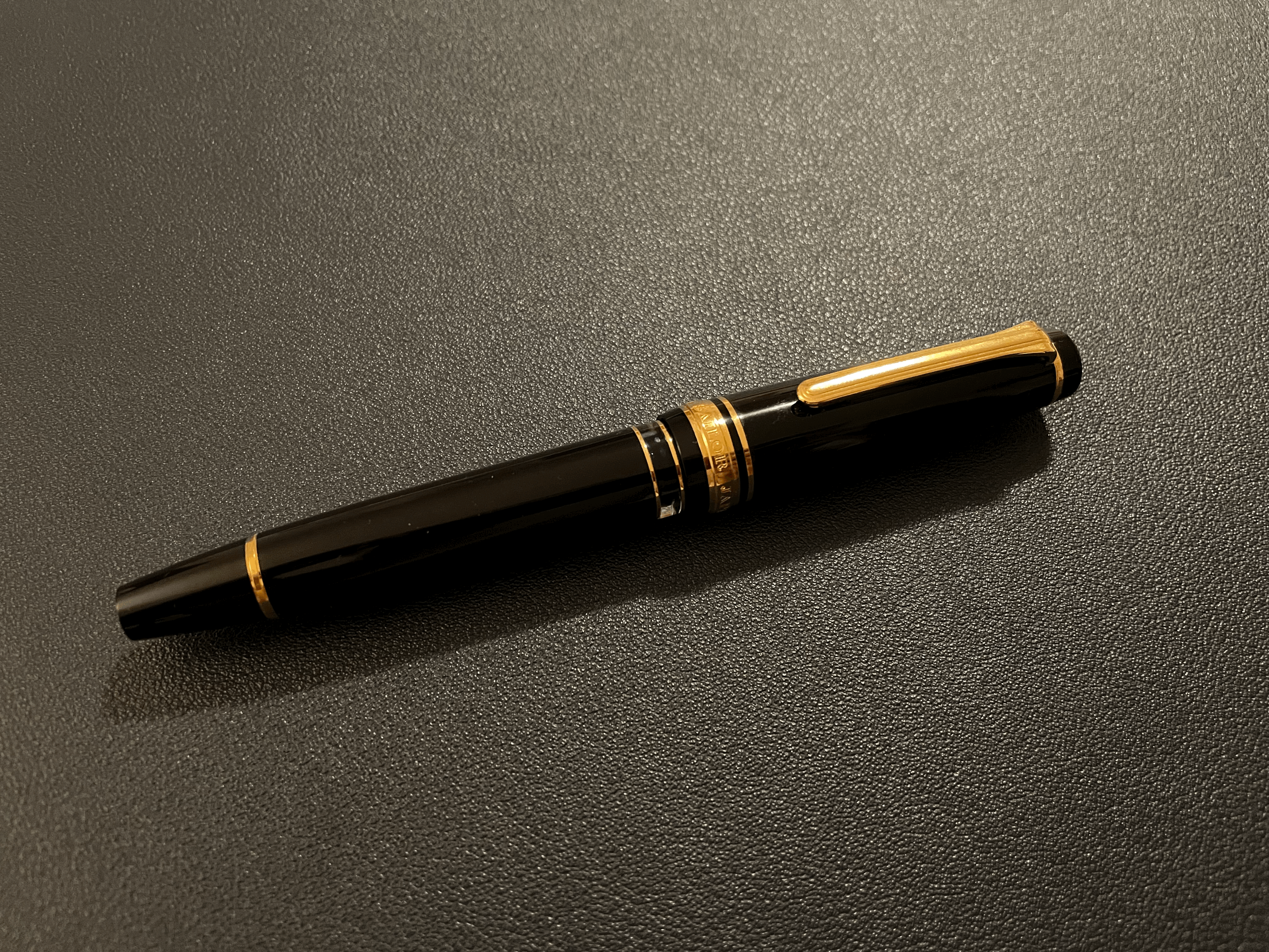 Indiscutibilmente una Pro Gear, ossia con le estremità tronche. Decisamente classica nella livrea nera con dettagli dorati, è giusto qualche mm più lunga di una Pro Gear classic (caricamento a cartuccia/converter) e ne mantiene le proporzioni.