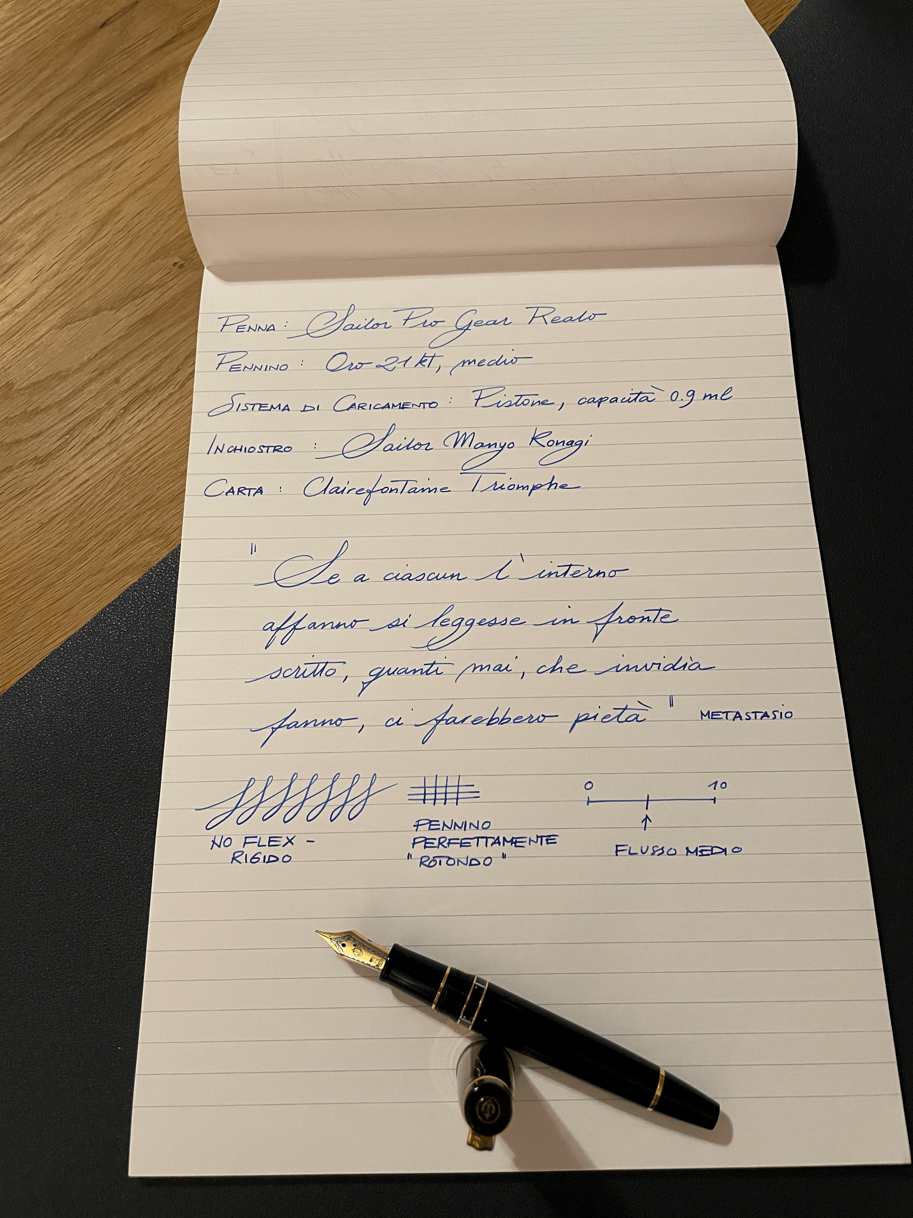 Bella penna Matteo, posseggo alcune Sailor e per me sono delle ottime penne, tutte con un certo feed back, caratteristica che trovo molto gradevole, i pennini sia in acciaio che in oro sono molto ben realizzati. L'unica pecca, secondo la mia percezione, sono le dimensioni: aggiungessero 1,5 cm al fusto sarebbero perfette. Ho una Kop che è una gran penna, rispetto alla Realo è.....tutta un'altra sensazione possono risiedere nello stesso cassetto senza dare l'idea di doppione. Grazie per la condivisione e buona giornata