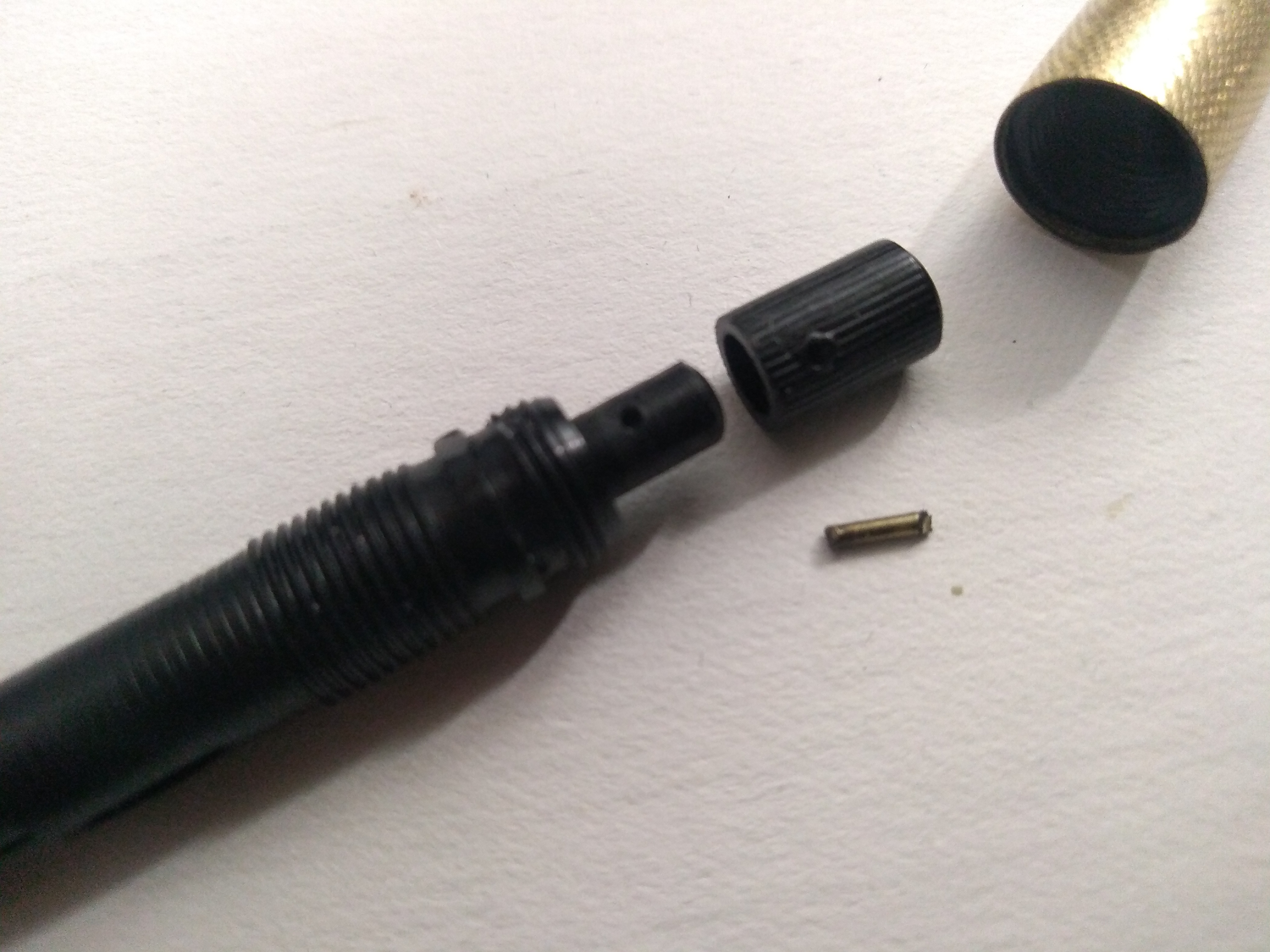 1) l'alberino del pistone è diviso in due sezioni di diametro differente, entrambe hanno un "solco" in senso longitudinale che farebbe presumere ad un inserimento in una guida, ma all'interno della sezione della penna non vi è nessuna guida;