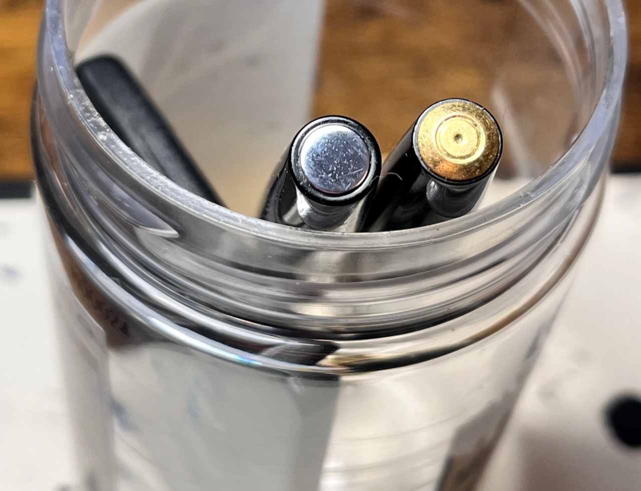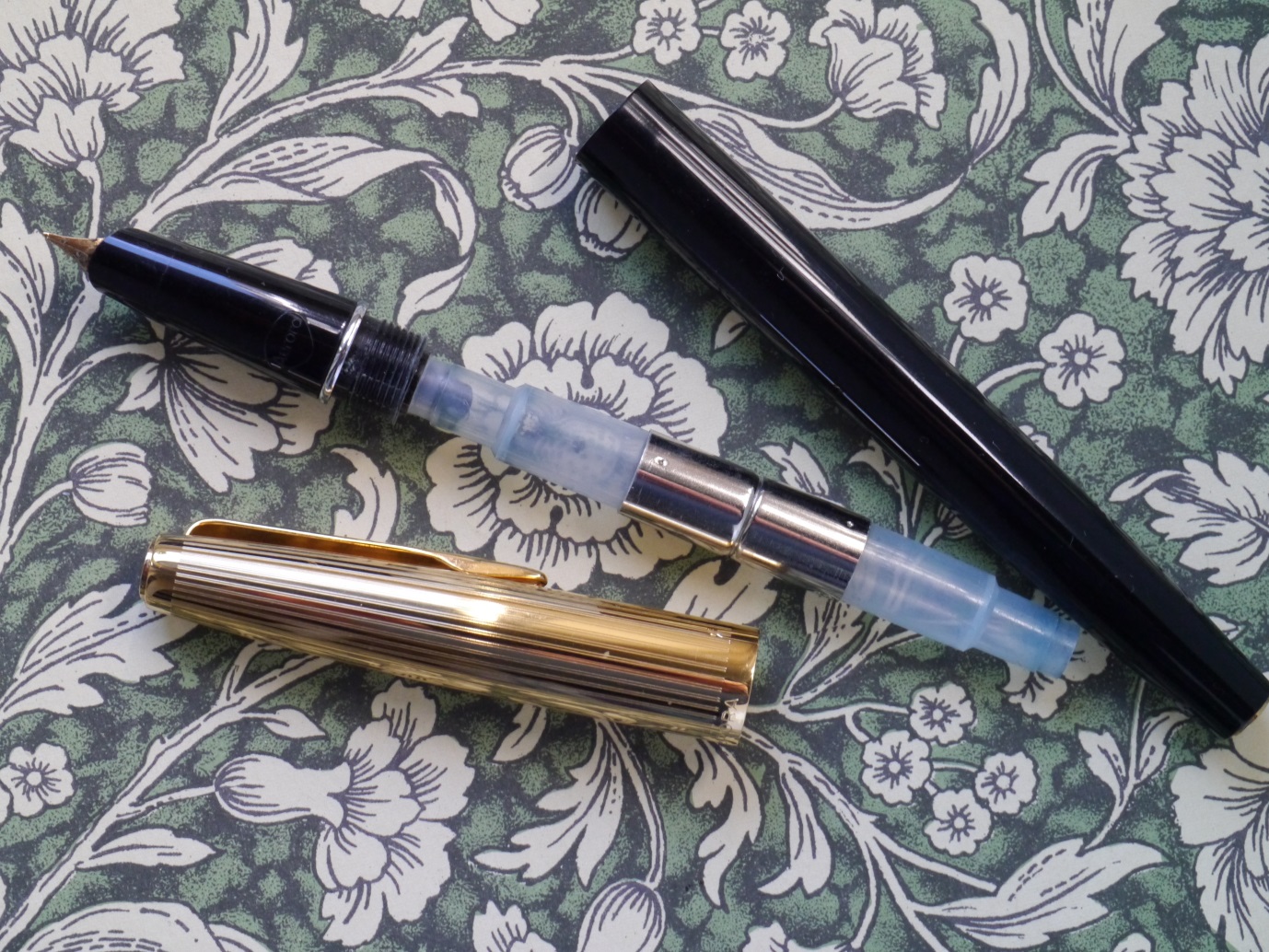 Buona domenica a tutti, ho rimesso in pista questa penna datami dallo zio. Sul cappuccio, d'orato, c'è scritto SAME, deduco sia una penna pubblicitaria. Ho riempito una cartuccia, decisamente sua visto l'imbocco, e visto che avevo un'altra cartuccia vuota e l'anello di metallo che le tiene insieme le ho lasciate attaccate ed ho provato ad avvitare il fusto che purtroppo non si avvita fino in fondo. Ho tolto la cartuccia vuota e lasciato l'anello di metallo ma anche così il fusto non si avvita fino in fondo. Le due cartucce e l'anello non sono le sue? Mi pare strano. A meno che non siano per la 888P, che pure posseggo ma che sta usando il converter Platinum?