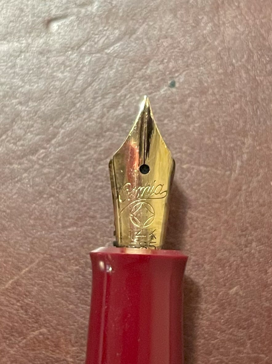 Anni 50-60, fatta con le resine plastiche a iniezione monocolore che cominciavano a essere usate nel periodo, con caricamento a pistone. Piccolina e ogivale. Da vedersi è come tante del periodo, forse pure tozza e corta con questo pennino quasi a rombo come il logo della Osmia. Pennino in oro e corto, più corto ma largo come i suoi contemporanei.