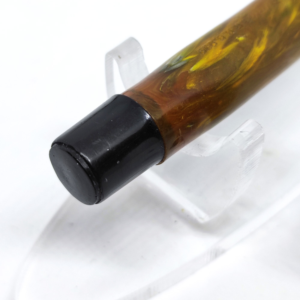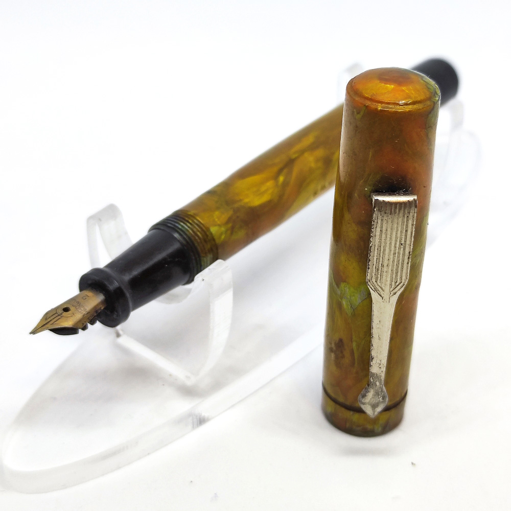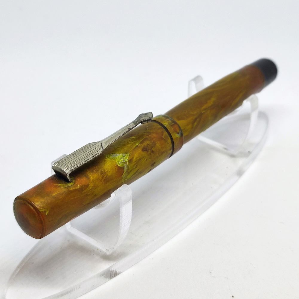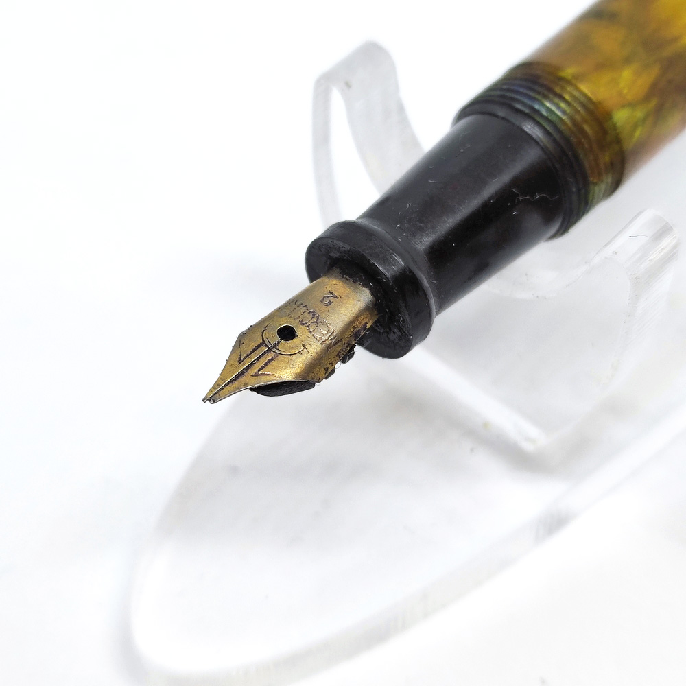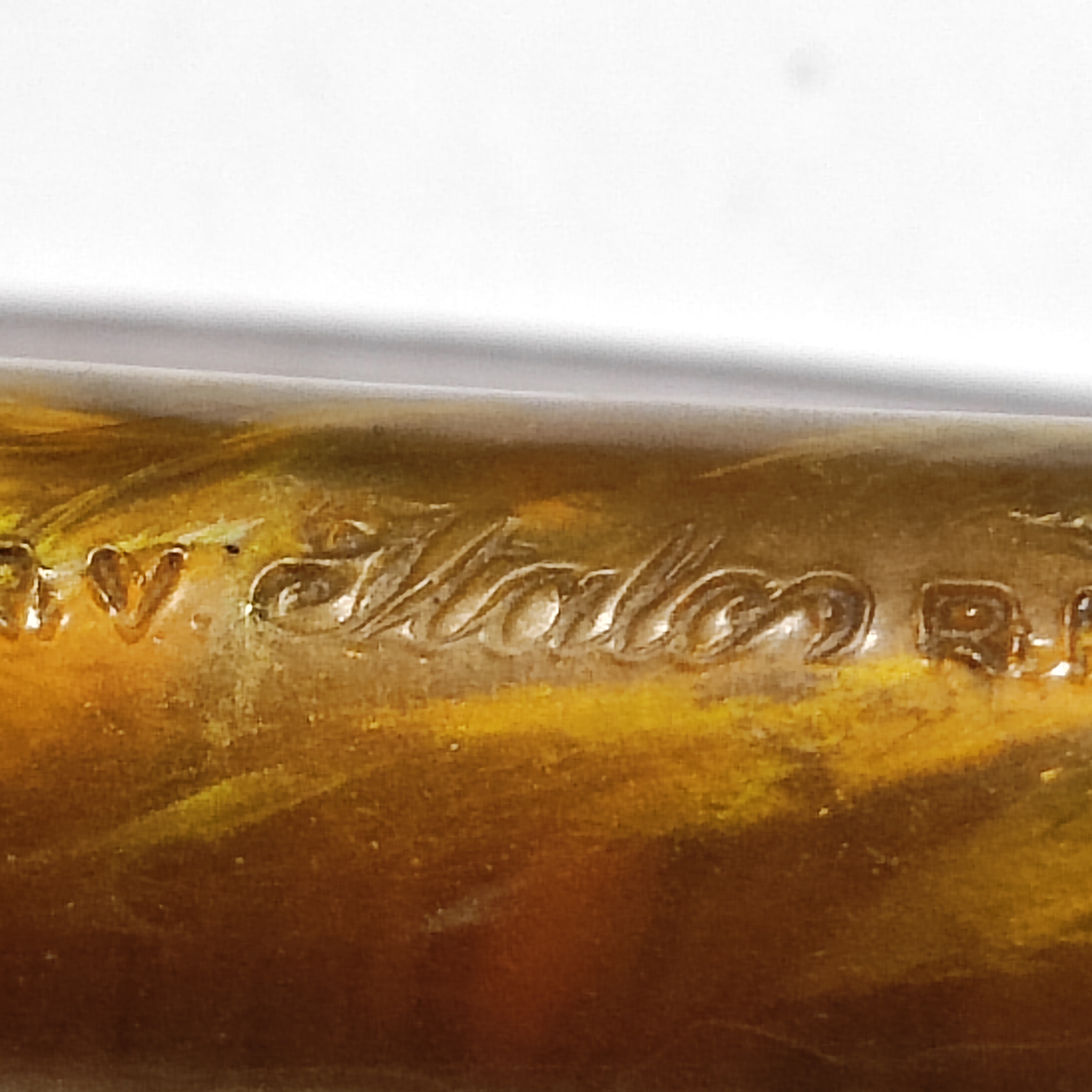 Ha il fusto in celluloide venata impastata ad effetto marmo, è presente una incisione in corsivo ITALON (credo di leggere) ma non trovo riferimenti nemmeno qui sul forum (almeno mi sembra di non trovarne)